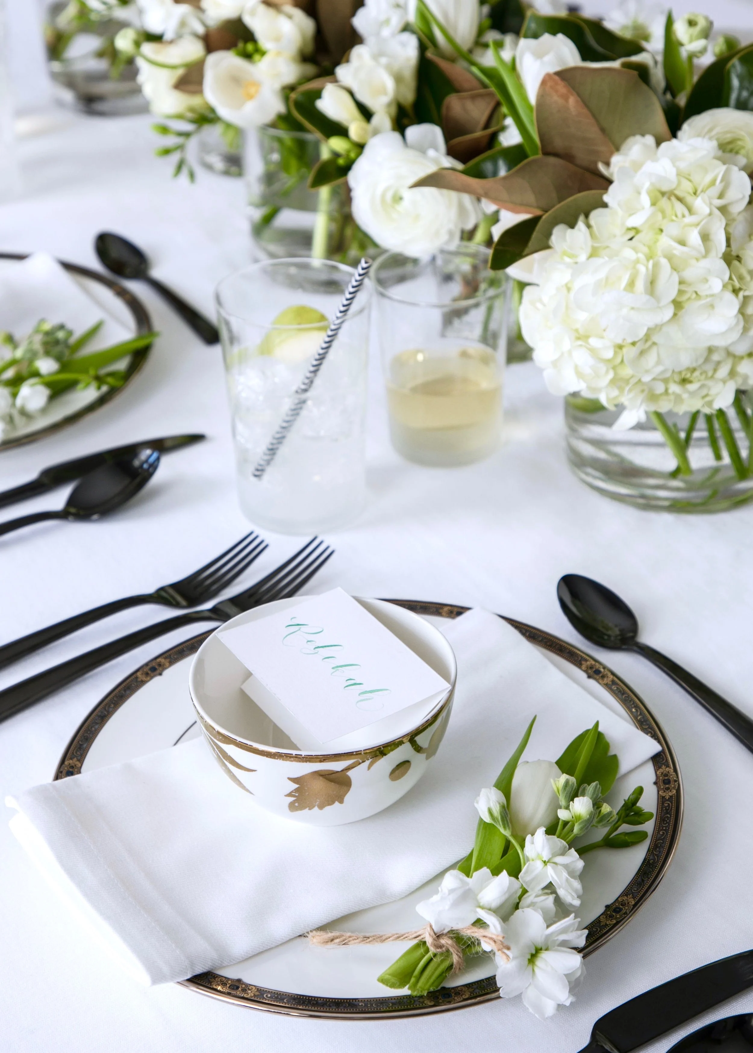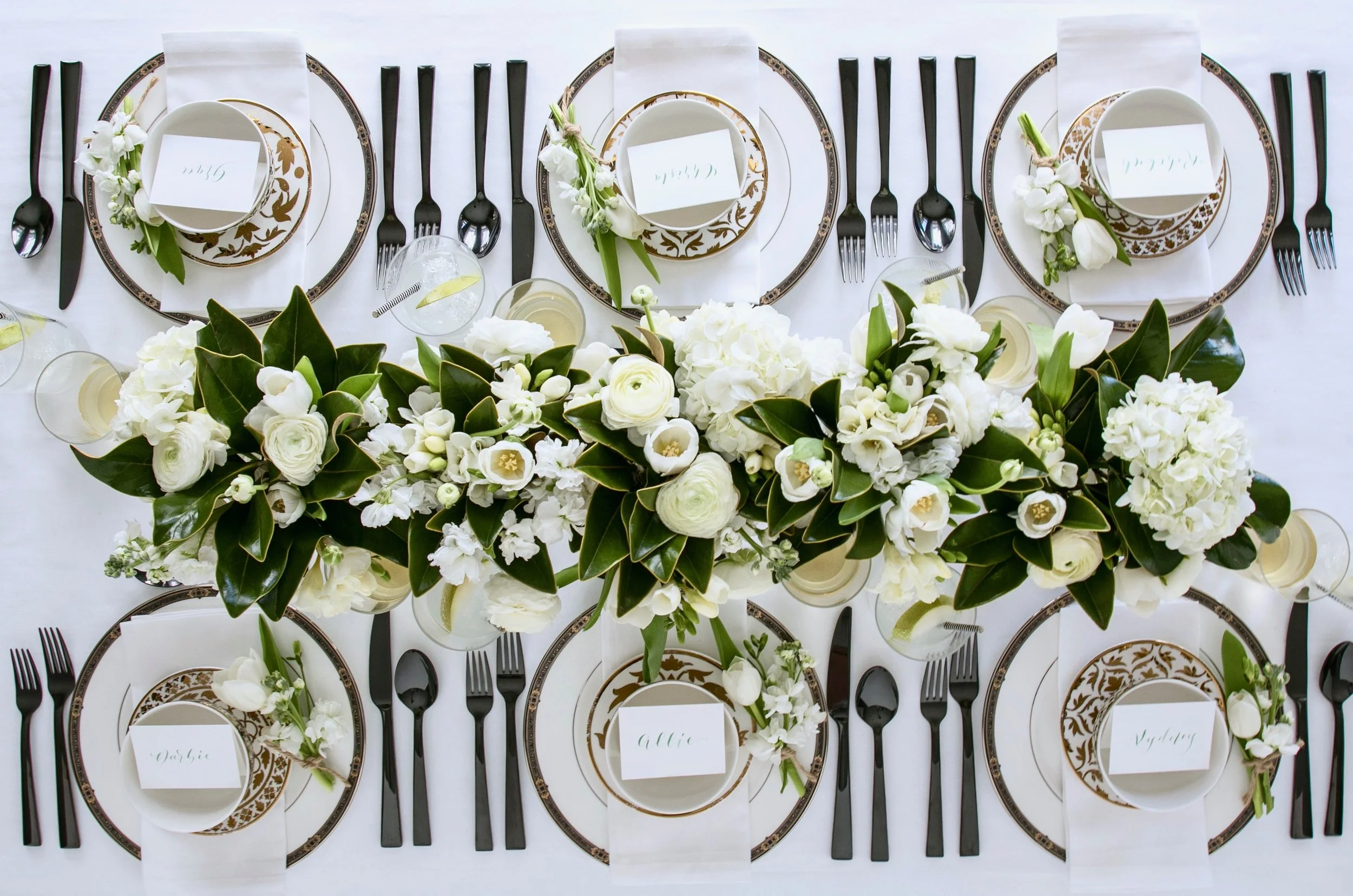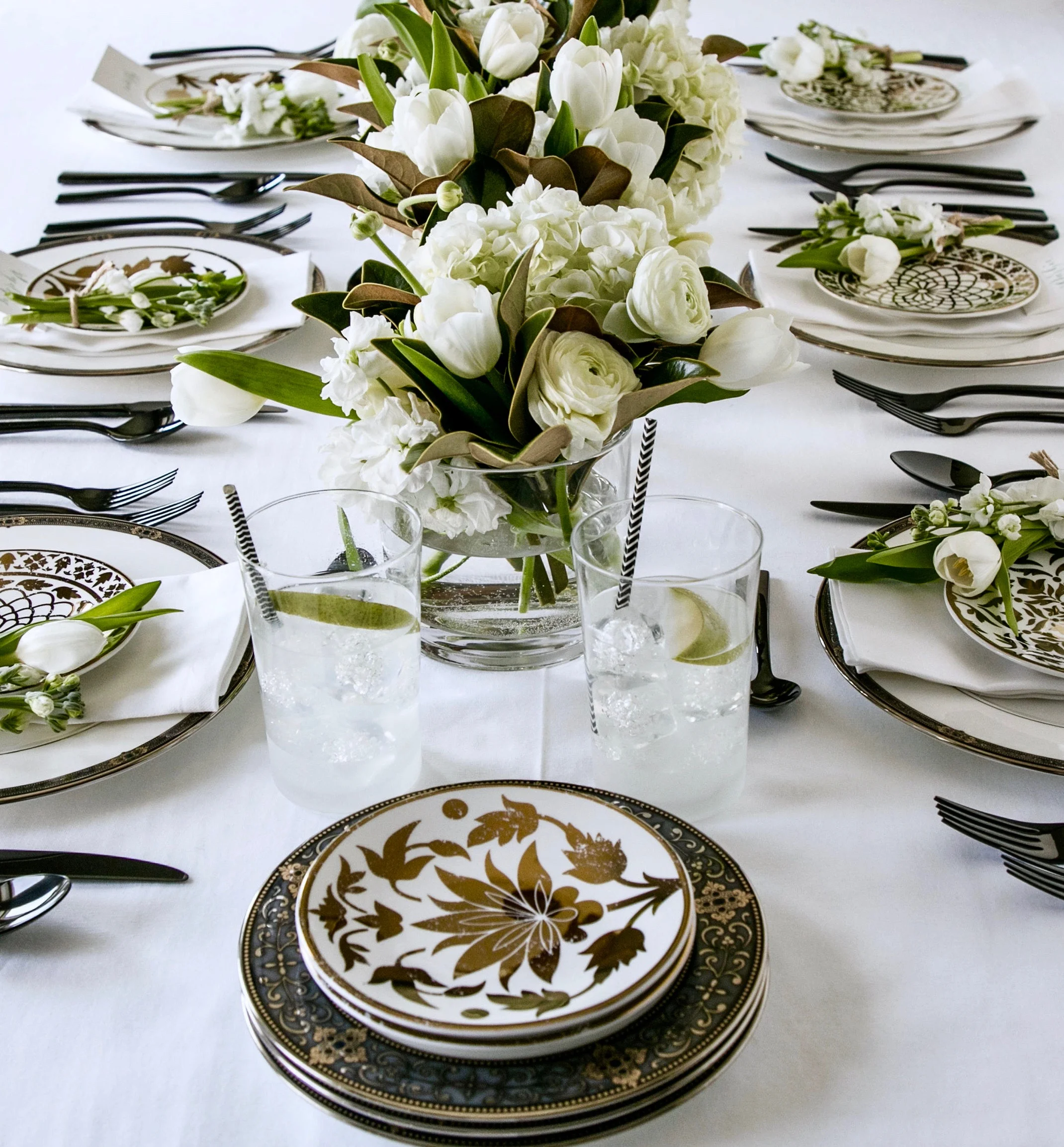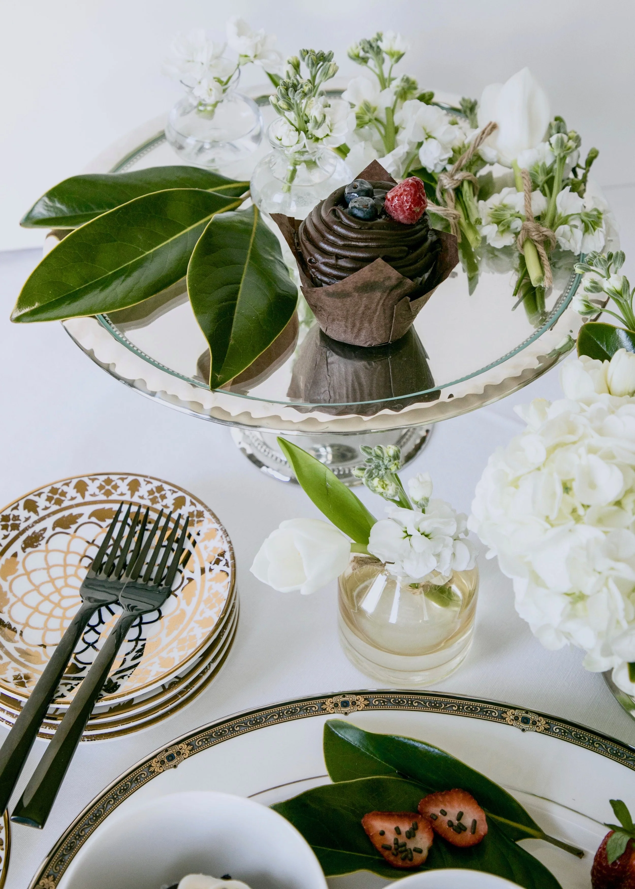 featuring vintage jewel dinnerware & Accessories, Colebrook Onyx flatware, kate spade new york nolita glassware, reed & barton beaded cake stand