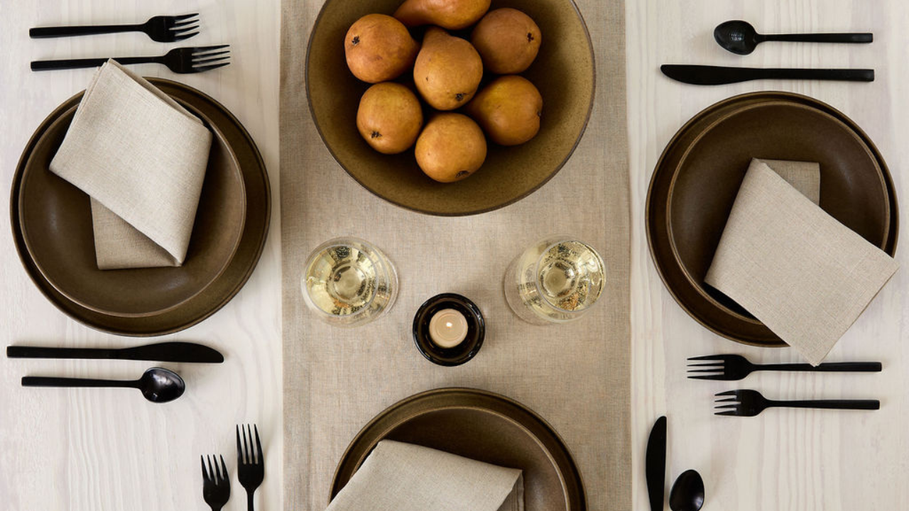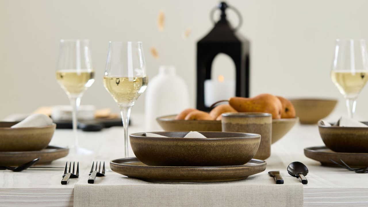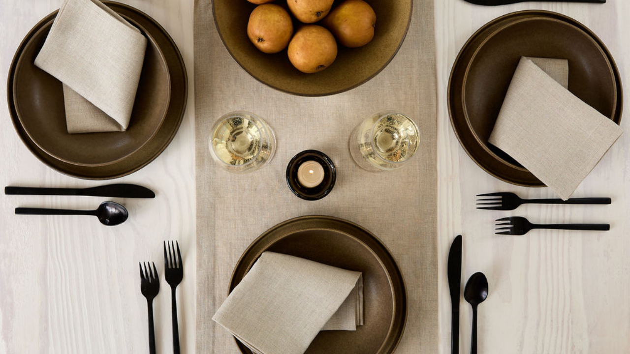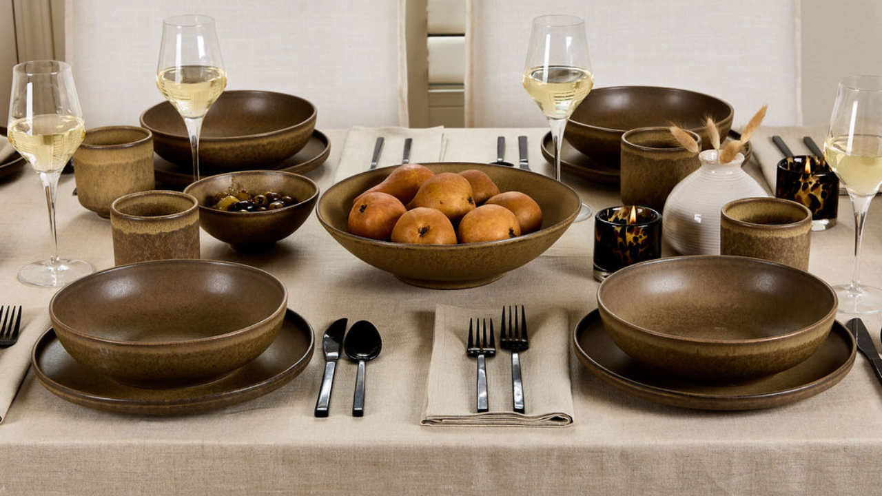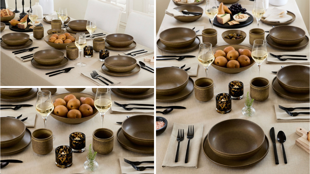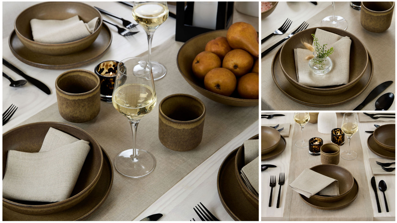 Layering here isn’t about contrast. It’s about tone. Ceramic against linen. Matte against soft sheen. Brown stoneware plates grounding the setting, while neutral napkins soften the edges. This is where modern table decor shifts from styled to lived-in, something often explored through thoughtful pieces in the newer collection.