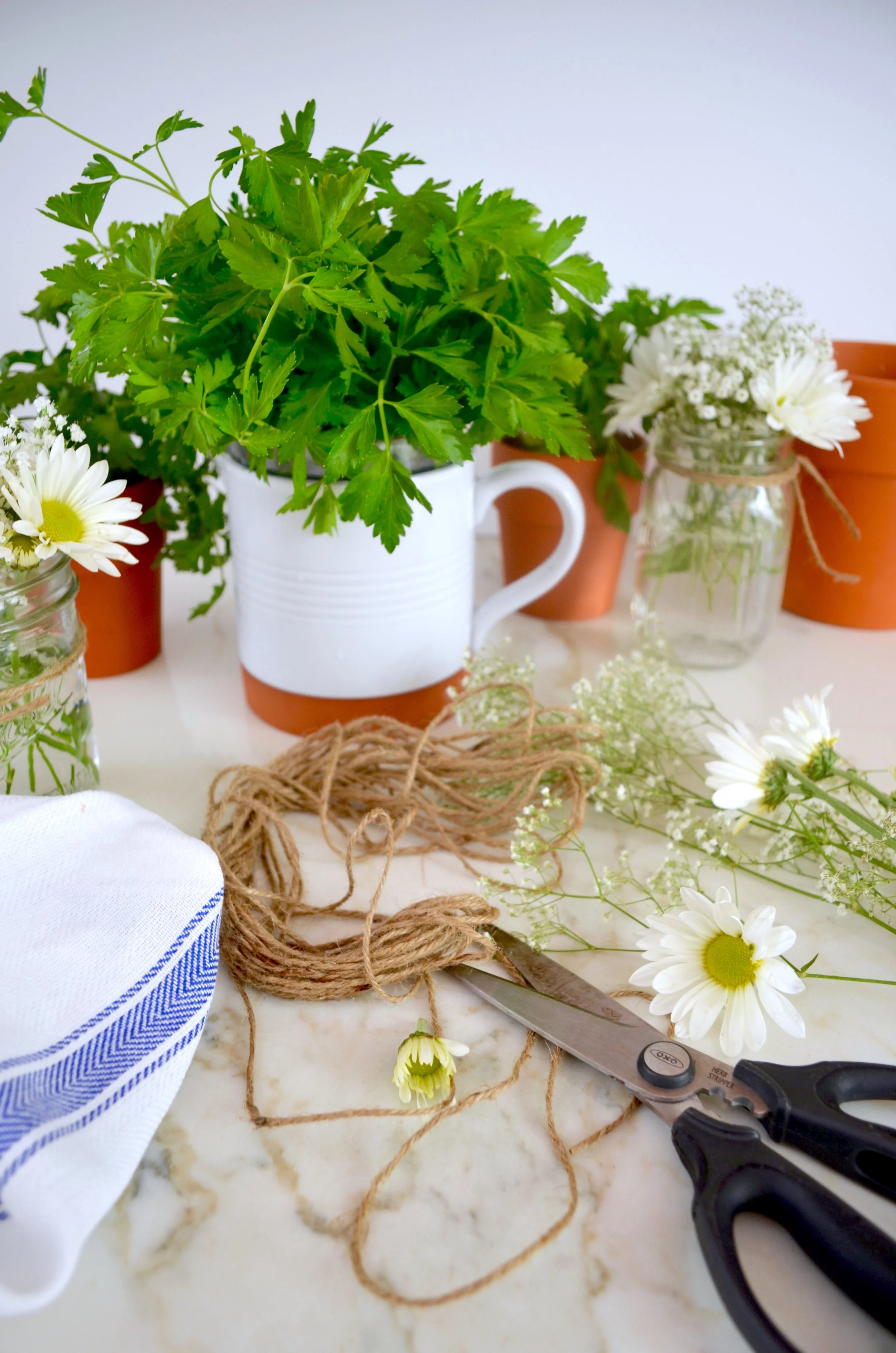Using clay pots and either a small juice glass or glass votive holder filled with water to line the pots, cut the herbs to desired height, spray with water to keep them fresh, and you're done. I keep the white flowers simple, with daisies, babies breath or sometimes white roses from my garden. While you're cutting fresh herbs, add a handful to your water bottles and refrigerate until you're ready to serve. The best!