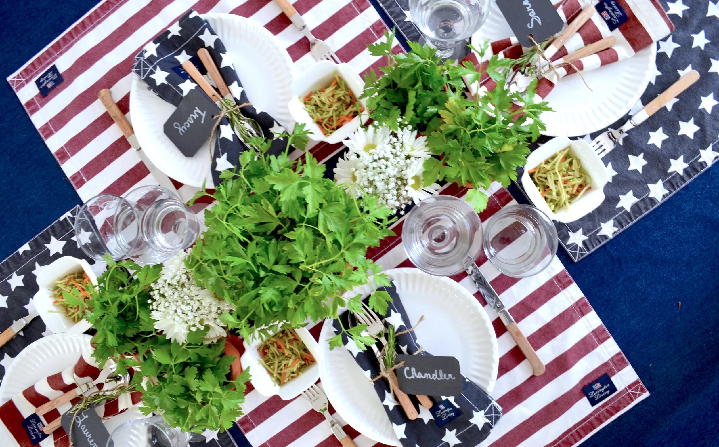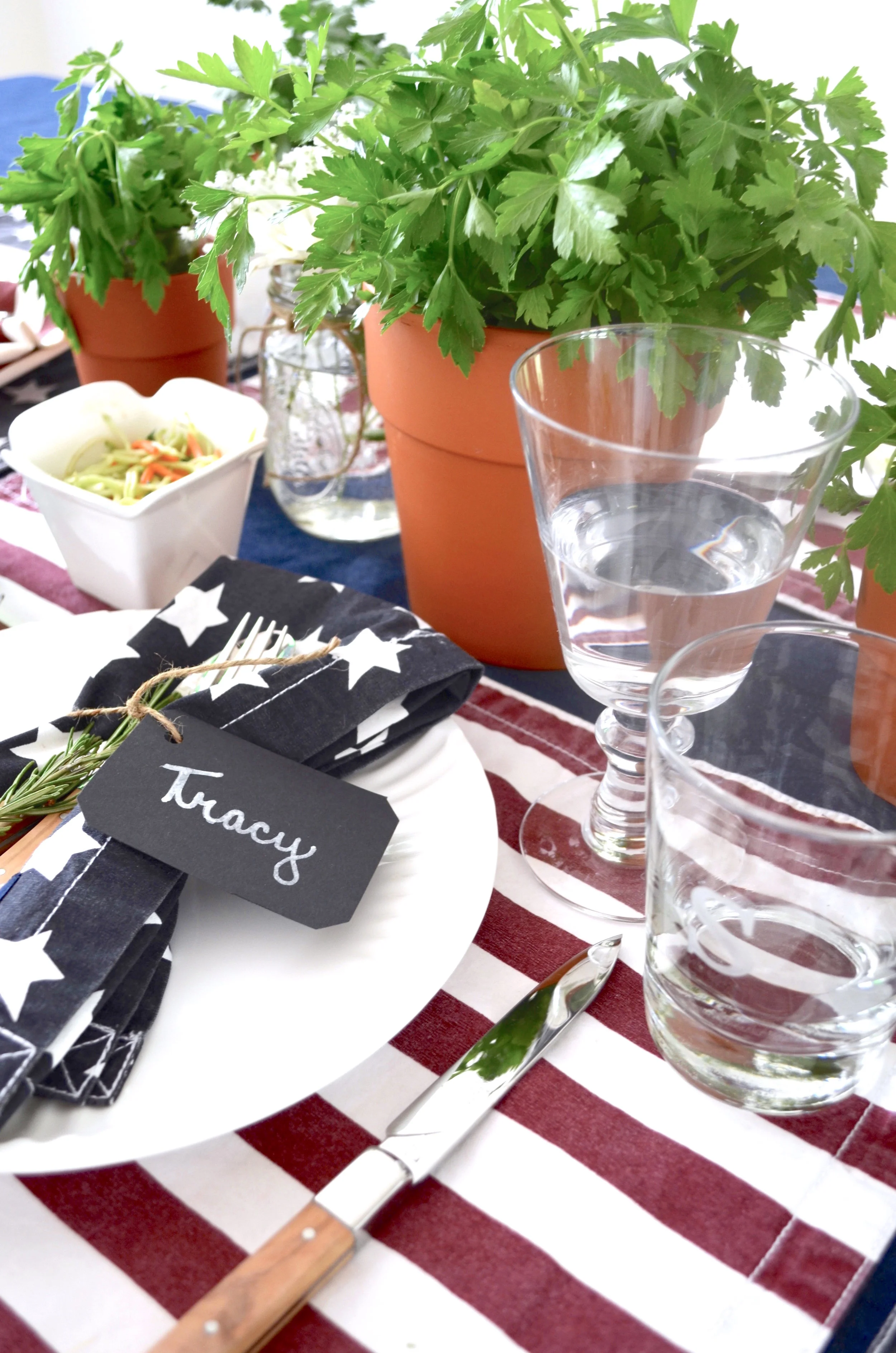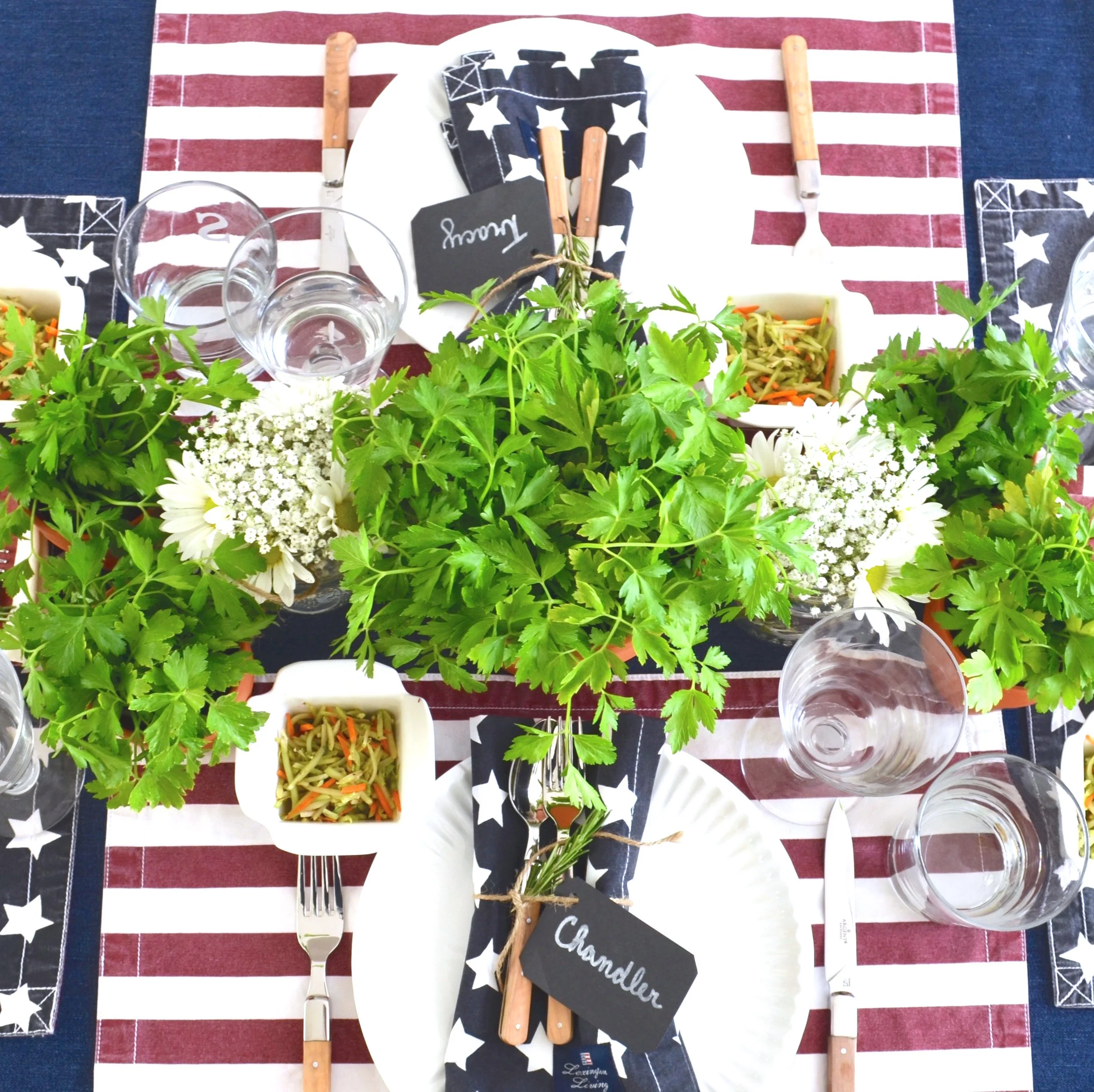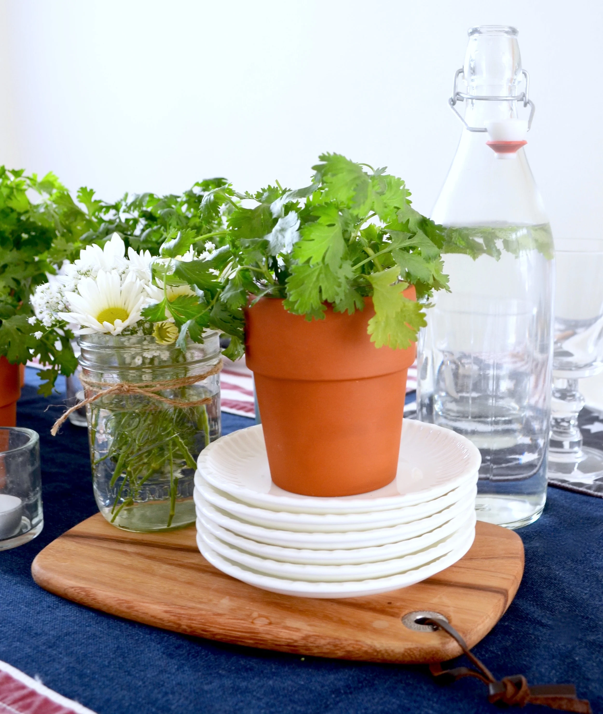 Since the 4th of July usually includes a backyard, potluck BBQ, I think it calls for a casual tablesetting - meaning, just about anything red, white and blue works on the table. This year, I'm taking things up a notch from my typical flower centerpieces or runners and using fresh herbs in clay pots and white daisies with baby's breath in mason jars. They're super easy to assemble, and there's nothing like the smell of fresh parsley, cilantro, rosemary, mint or anything that's growing in your garden right now. Fresh herbs create a look I love and one I'm pretty sure Ina Garten would approve of.