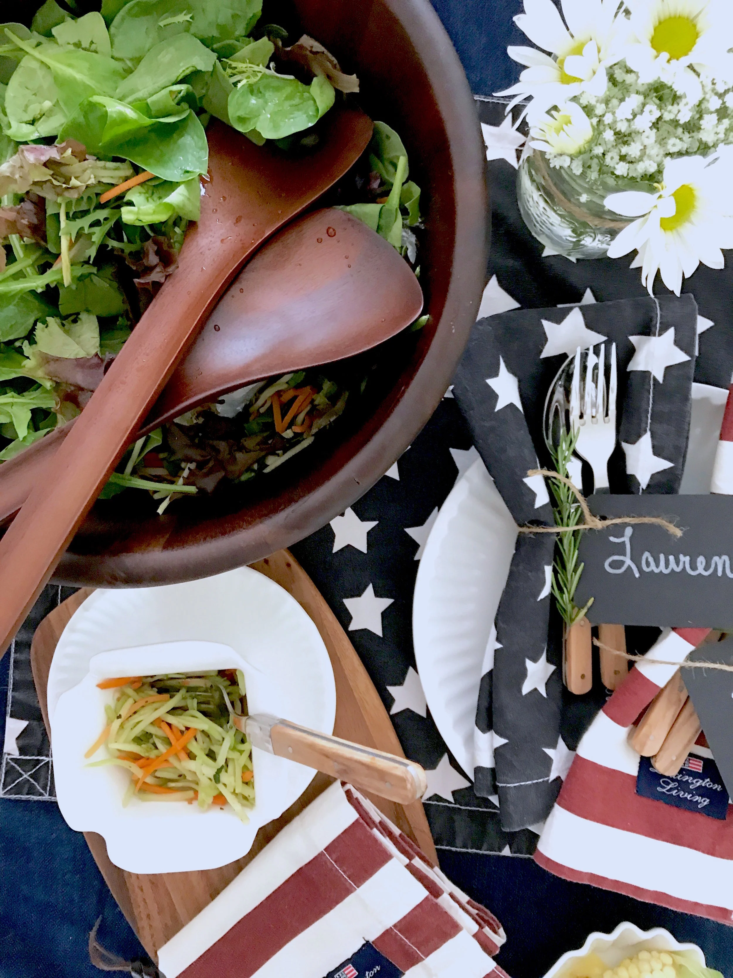 I like to set tables indoors and out for any BBQ or summer party. It makes it easy for serving, entertaining guests and creating places to strike up conversation. For this setting, I used a denim tablecloth as a backdrop, diner kitsch china dinnerware and serveware (can you believe it's china?!) and wood handled flatware. I alternated (reversible) stars and stripes placemats and napkins, and set out glasses for water, cocktails, wine and beer. For any barbecue or potluck, I stack plates,napkins and flatware on tables to make it easy for everyone to grab a plate when they feel like a little somethin', somethin'.