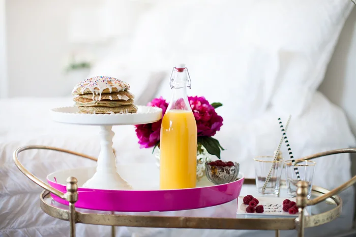 Planning breakfast in bed? Caitlin Claire from A Little Dash of Darling shows us how to do it up big and even styled some of the products we carry! Like the ksny fancy another serving tray, striped straws, and cake pedestal which she so cleverly used to serve up sprinkled pancakes. Whatever, it's carb day.