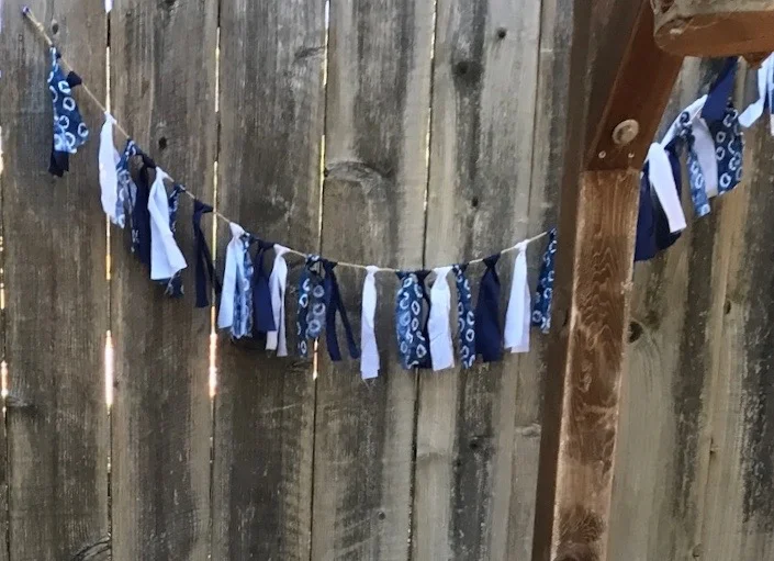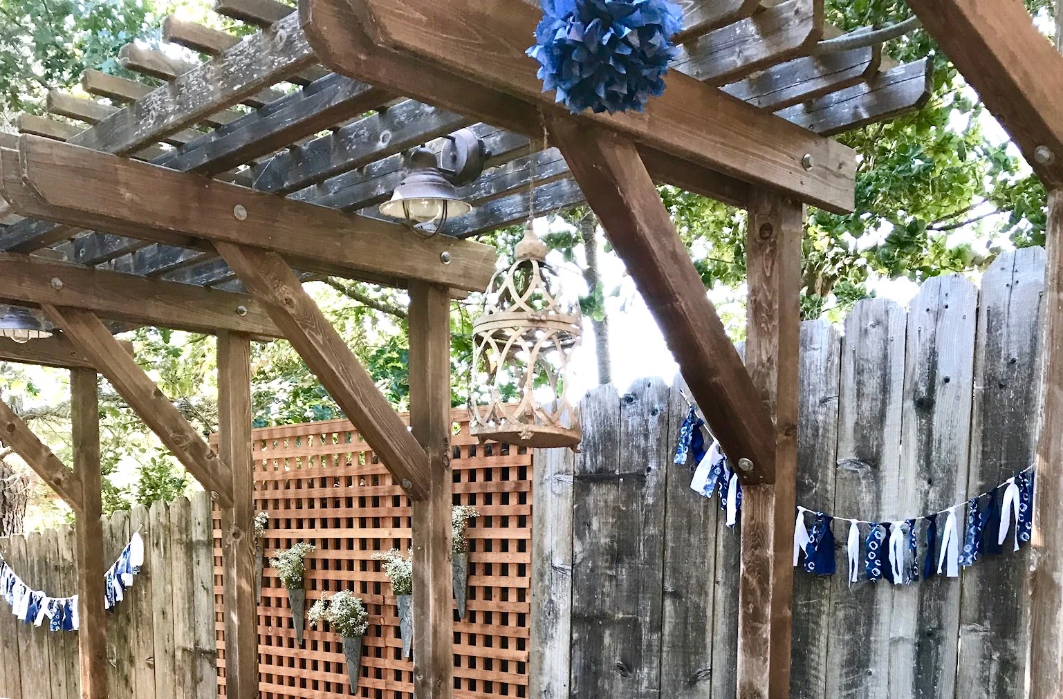 Lauren chose a blue and white color story, in honor or the bride’s current favorite colors, and to chime in the essence of summer. She decorated with Shibori garlands, blue paper poms and rustic cones filled with baby’s breath throughout the yard, creating a simple, insanely charming and rustic vibe, that was as pretty as can be.