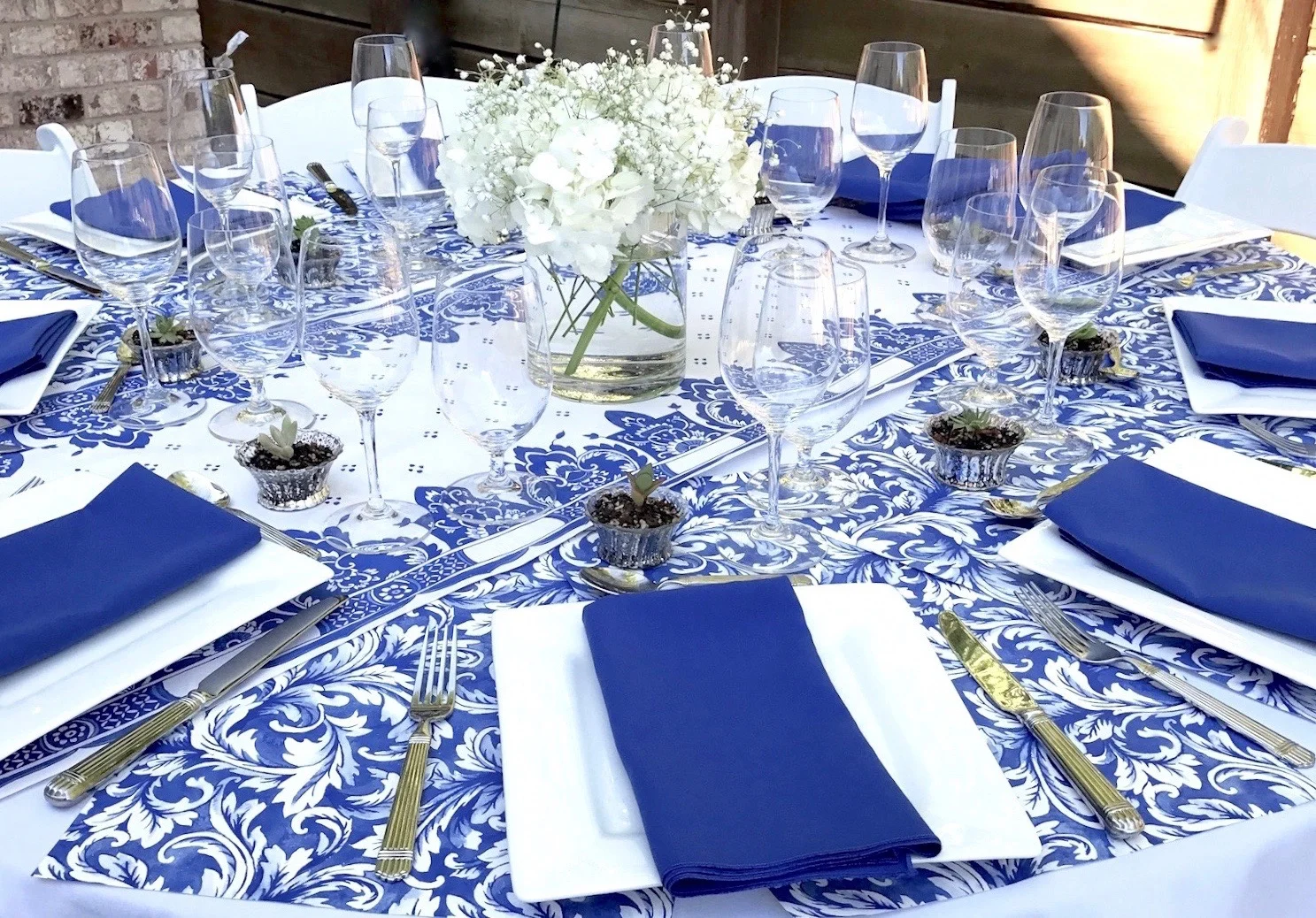 To carry out the color theme, Lauren combined white linen tablecloths draped down to the lawn, blue and white paper table runners with coordinating placemats, which also accented the bar area, square dinner plates for a little drama and solid blue napkins, playing off the blue of the pretty paper. To accent the table décor, she kept it simple, filling clear glass vases with white hydrangeas and baby’s breath, which was just enough to accent the prints of the paper. She added mini-succulents planted in votive holders at each placesetting as favors, to thank guests for coming.