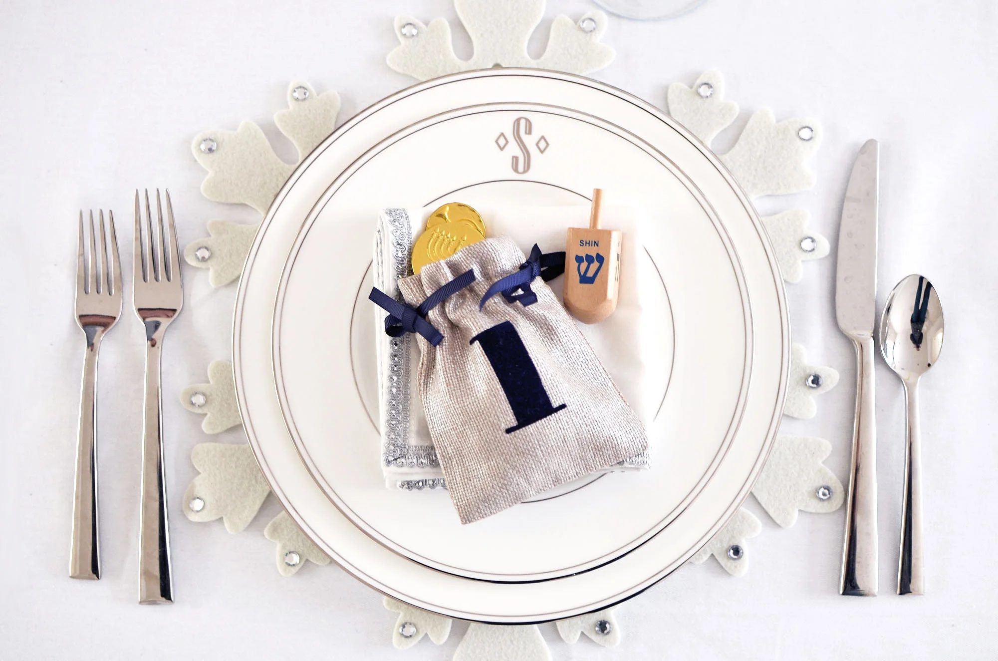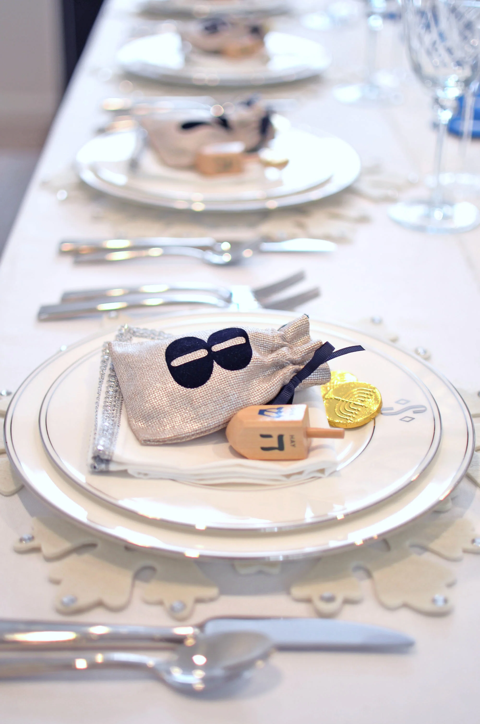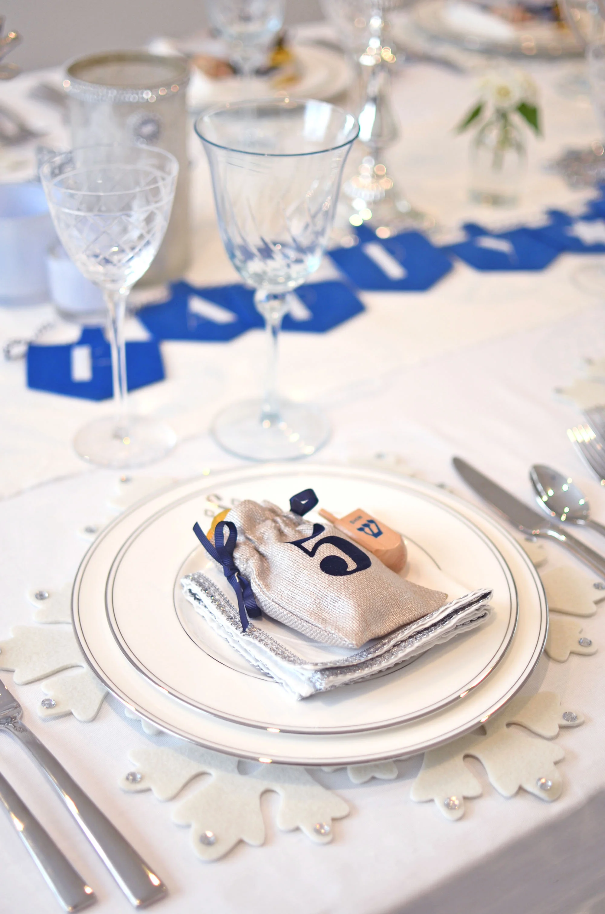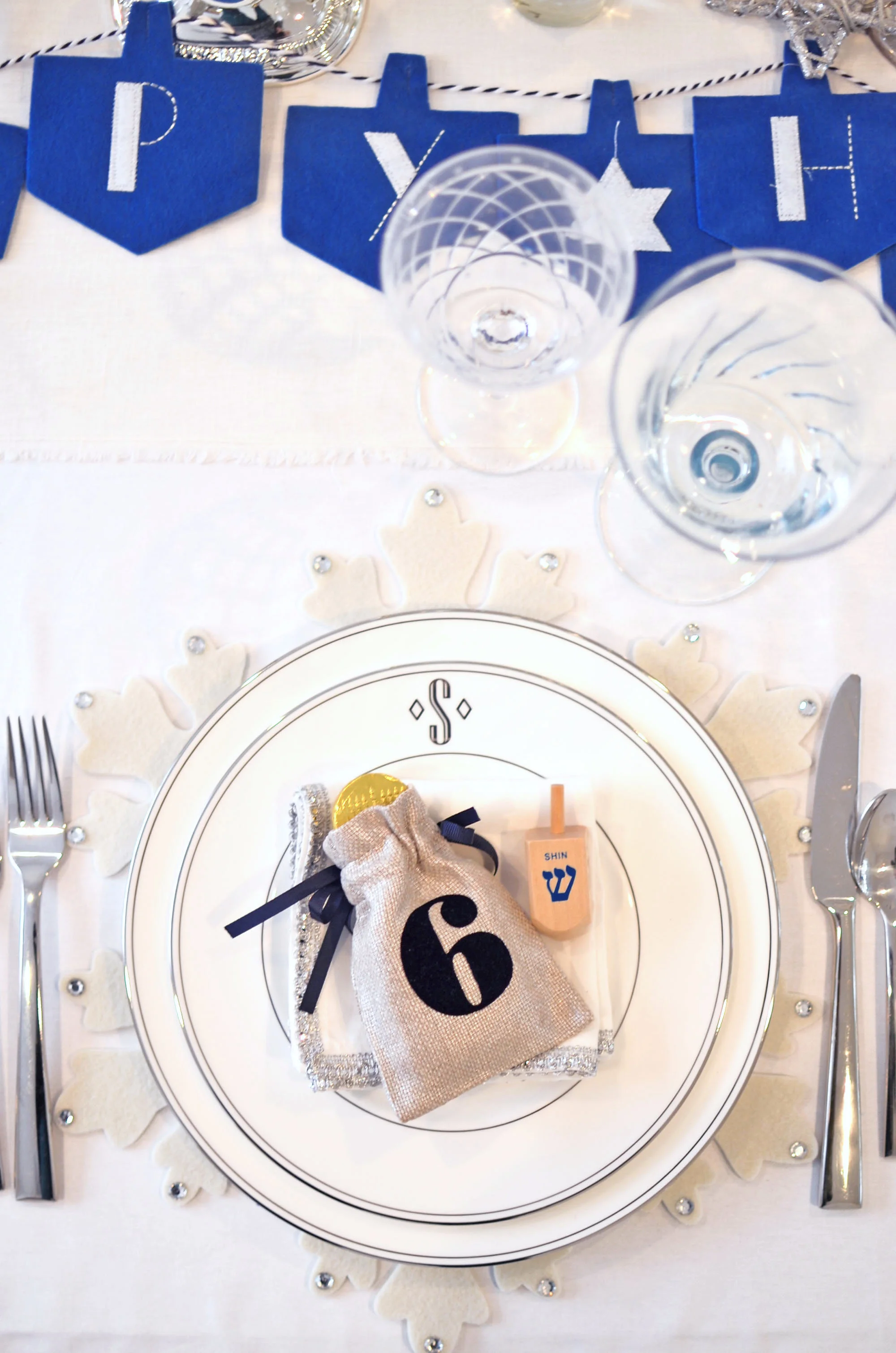 On the Hanukkah table: White, silver, shades of blue and my collection of menorahs, which really do all the work. By now you all know I love to layer my placesettings. Here, I layered a white felt snowflake placemat from Pier 1, a Lenox Federal Platinum Dinner Plate, a Lenox Federal Platinum Monogram Accent Plate (I'm all about monogram right now!), a silver trimmed napkin and topped each placesetting with these adorable Hanukkah Gelt Bags from Mark and Graham. The gelt bags absolutely made the placesettings and the table. I added gelt to the bags and dreidels to the placesetting so everyone can spin!