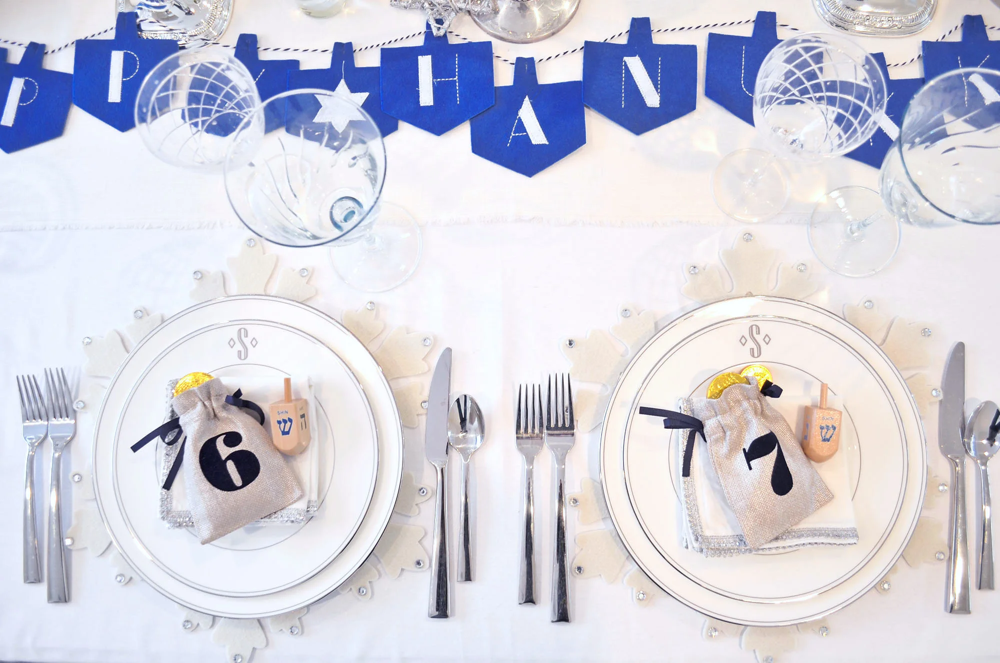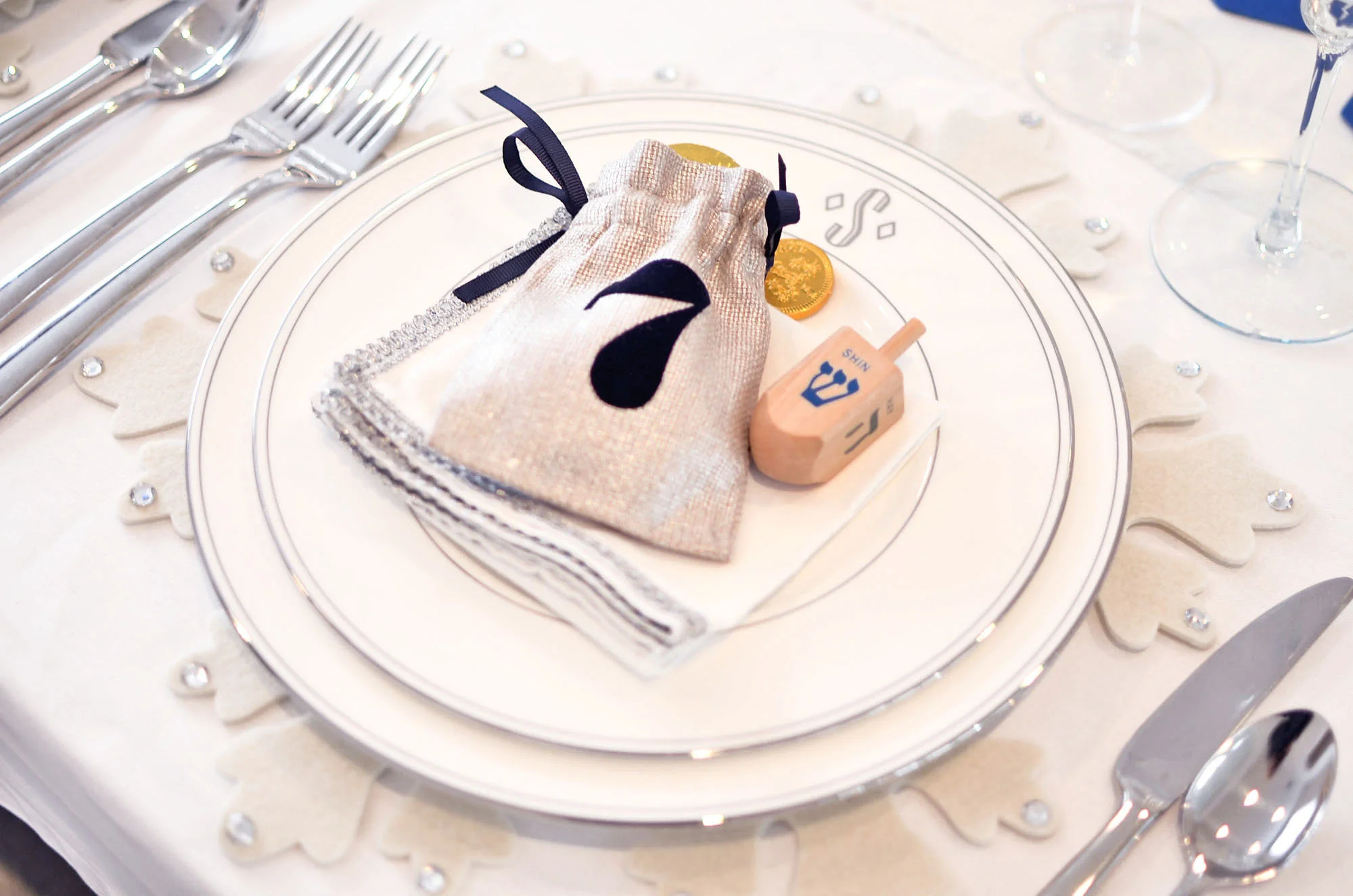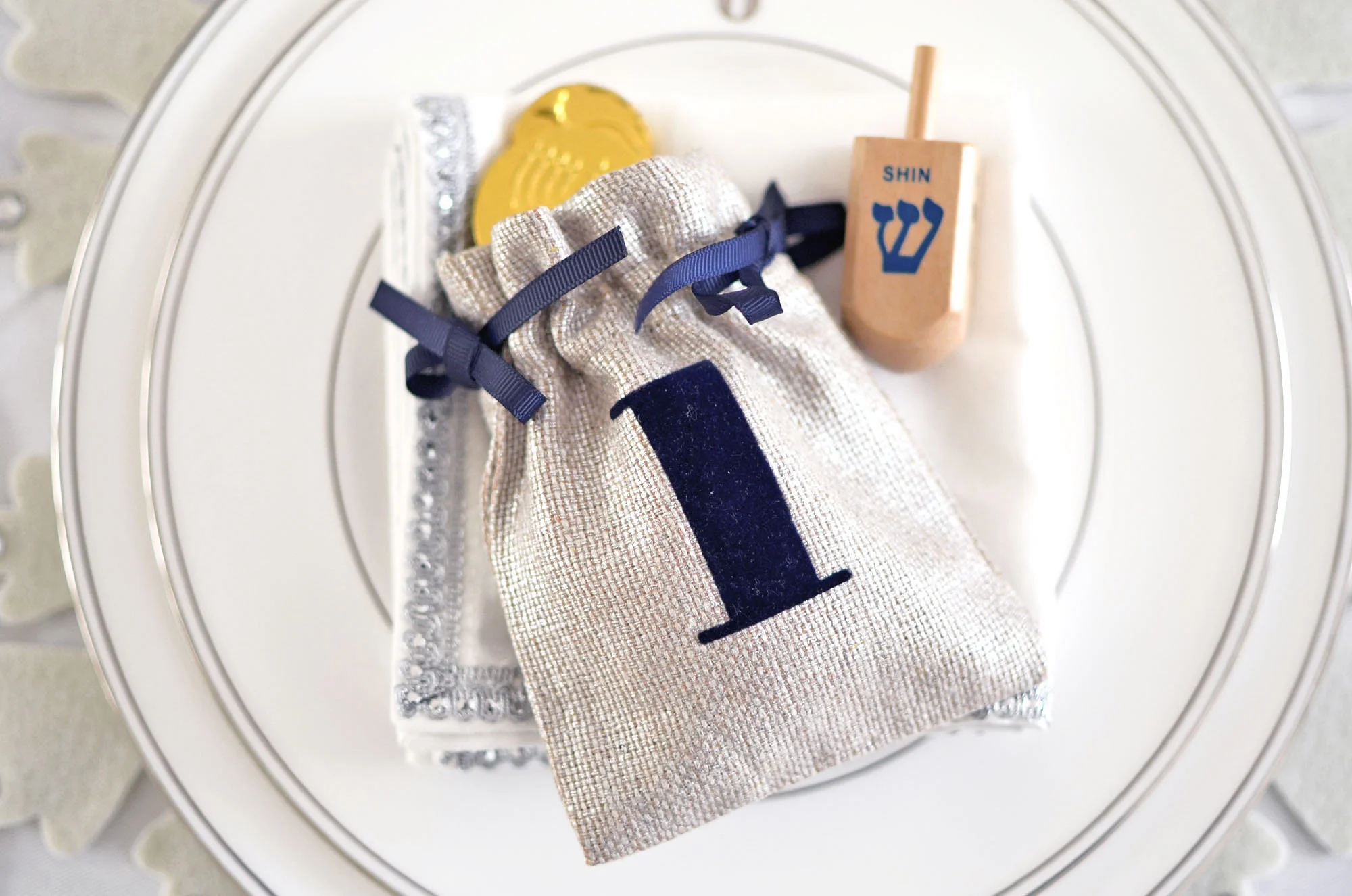 On the Hanukkah table: White, silver, shades of blue and my collection of menorahs, which really do all the work. By now you all know I love to layer my placesettings. Here, I layered a white felt snowflake placemat from Pier 1, a Lenox Federal Platinum Dinner Plate, a Lenox Federal Platinum Monogram Accent Plate (I'm all about monogram right now!), a silver trimmed napkin and topped each placesetting with these adorable Hanukkah Gelt Bags from Mark and Graham. The gelt bags absolutely made the placesettings and the table. I added gelt to the bags and dreidels to the placesetting so everyone can spin!