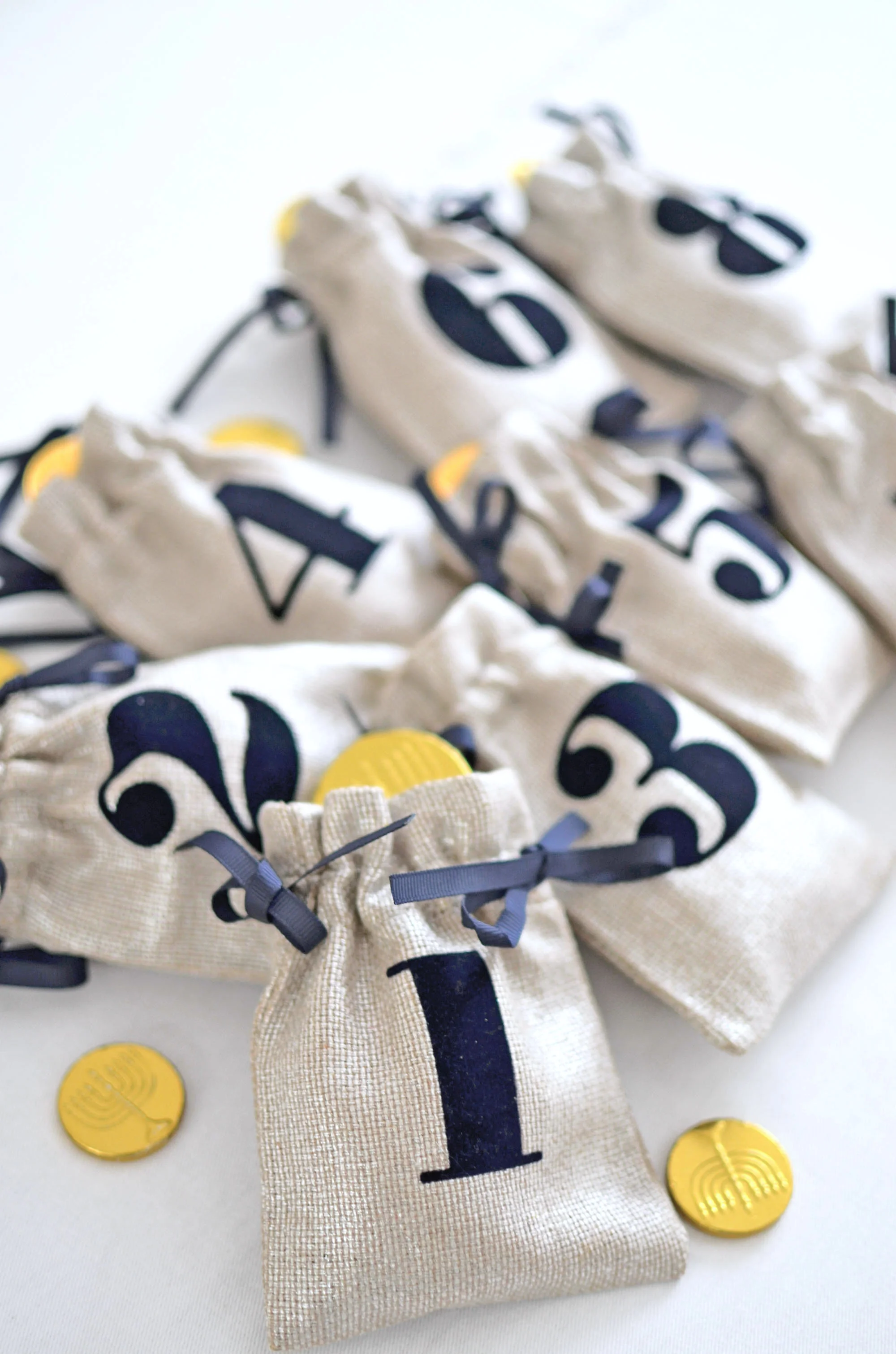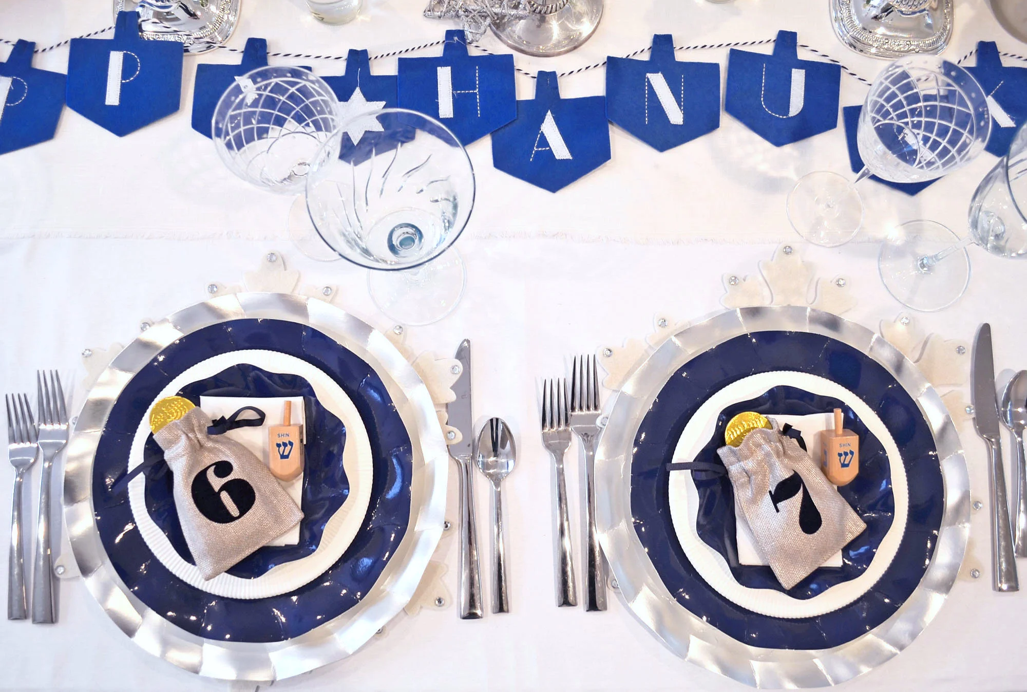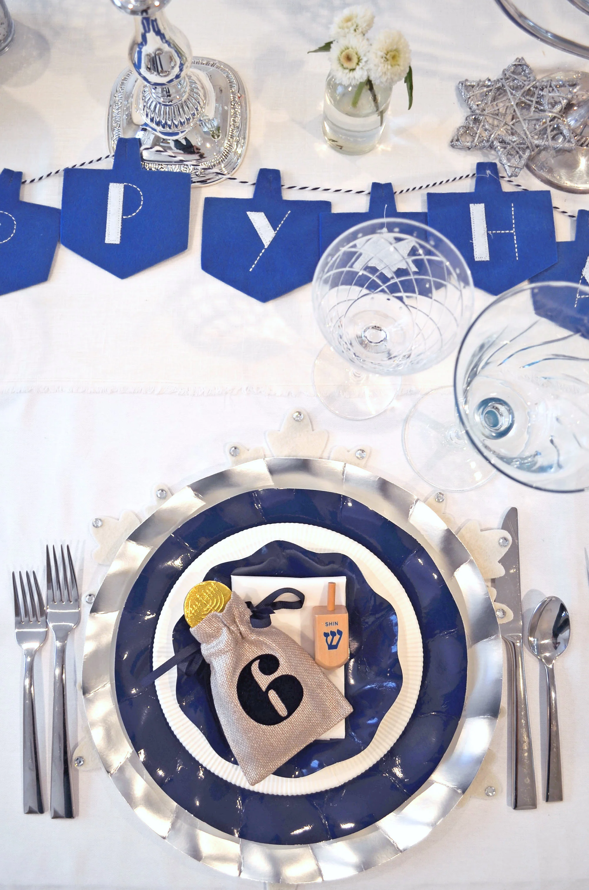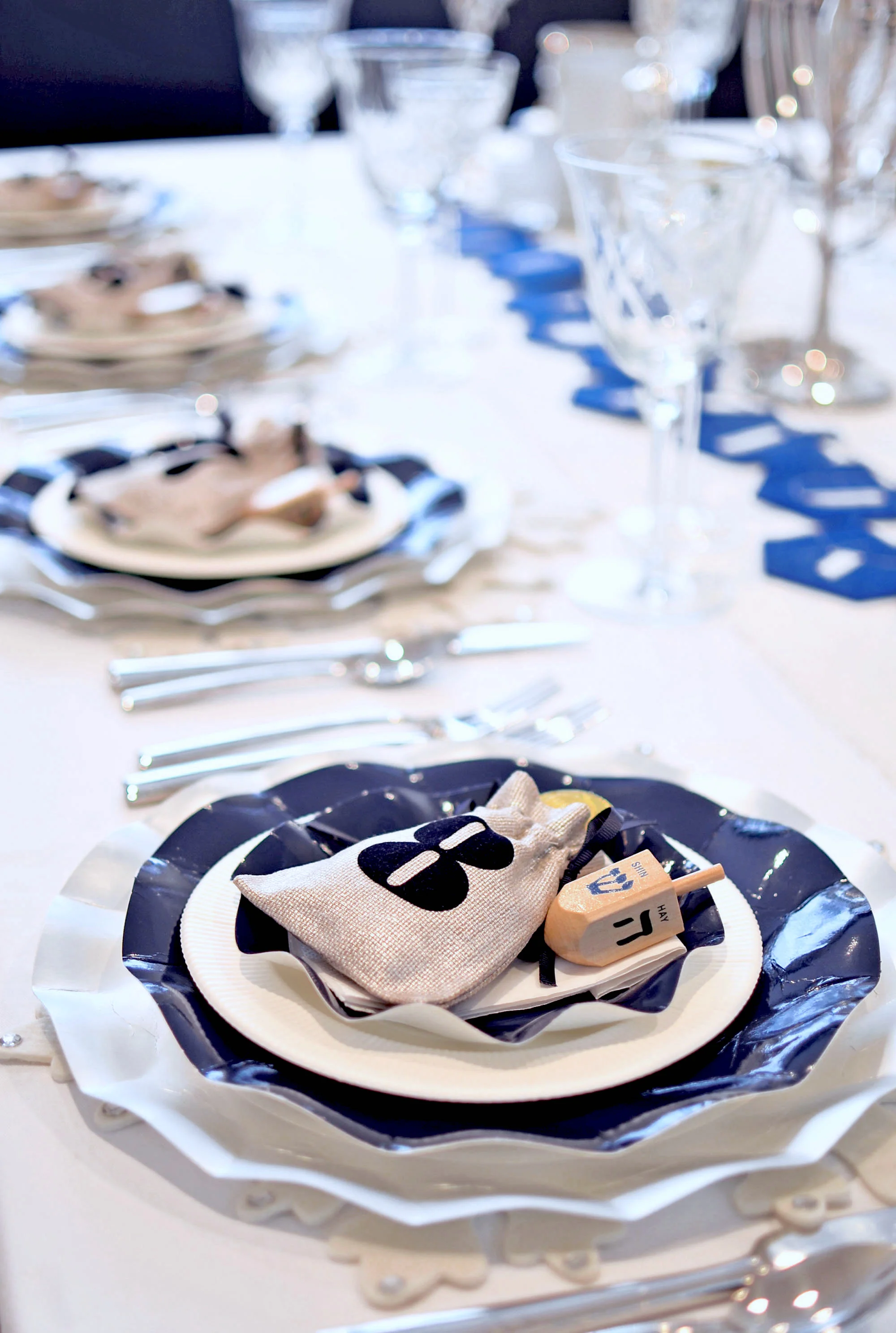 On the Hanukkah table: White, silver, shades of blue and my collection of menorahs, which really do all the work. By now you all know I love to layer my placesettings. Here, I layered a white felt snowflake placemat from Pier 1, a Lenox Federal Platinum Dinner Plate, a Lenox Federal Platinum Monogram Accent Plate (I'm all about monogram right now!), a silver trimmed napkin and topped each placesetting with these adorable Hanukkah Gelt Bags from Mark and Graham. The gelt bags absolutely made the placesettings and the table. I added gelt to the bags and dreidels to the placesetting so everyone can spin!