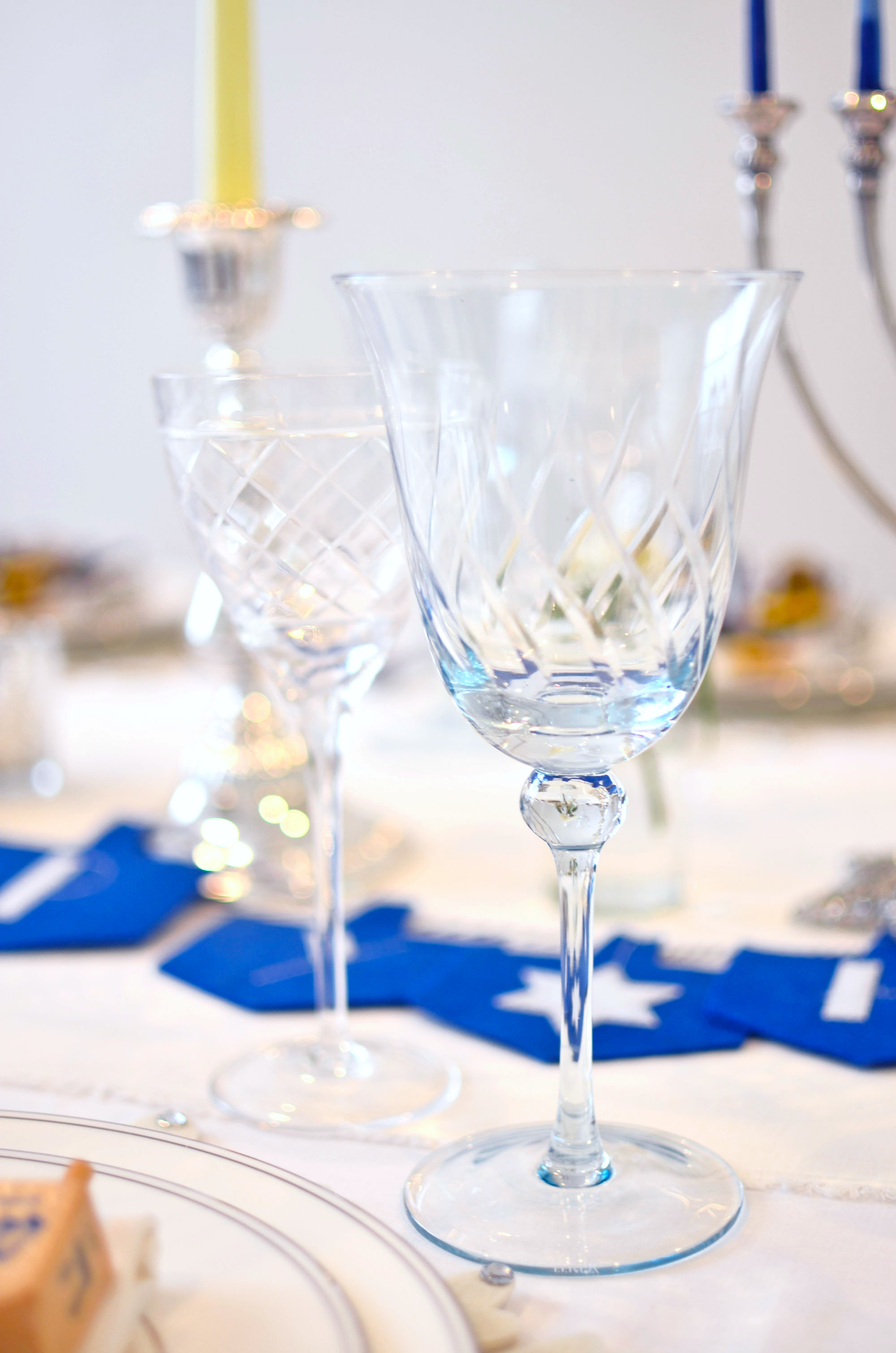 Let's talk about these Etched Footed Blue Wine Glasses from Lenox, because I love that they have a vintage feel and are absolutely the most perfect shade of blue for a Hanukkah table.