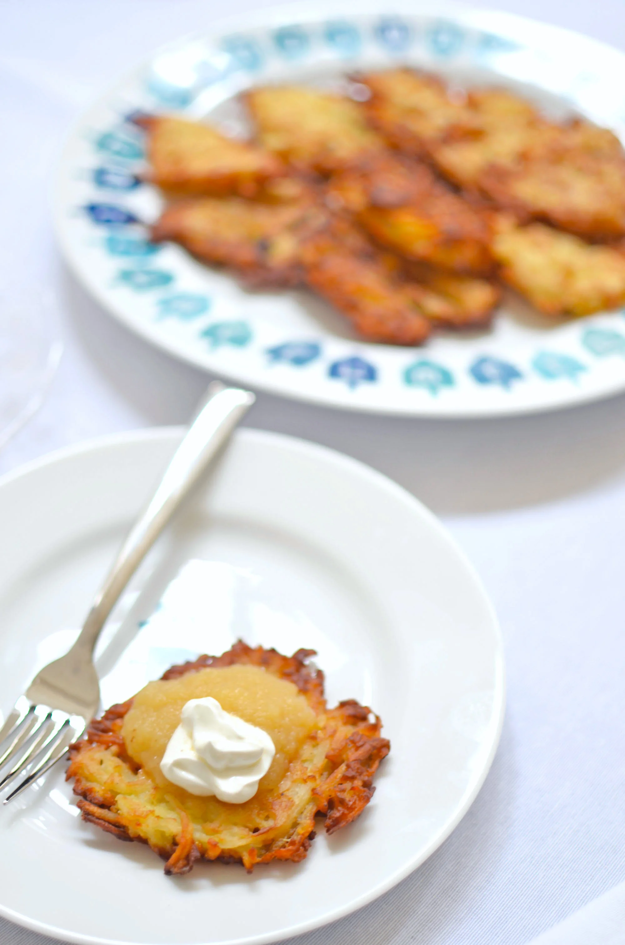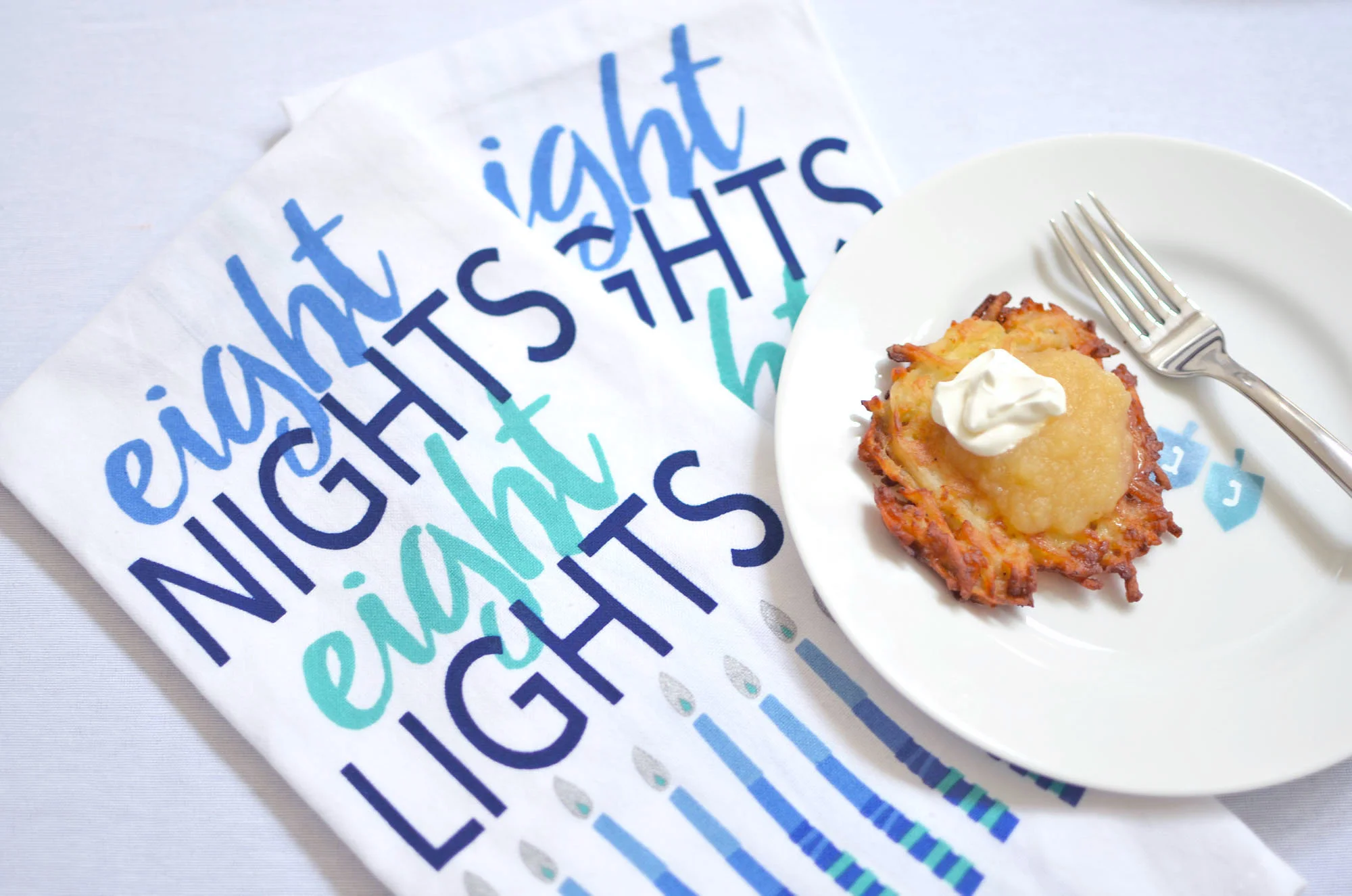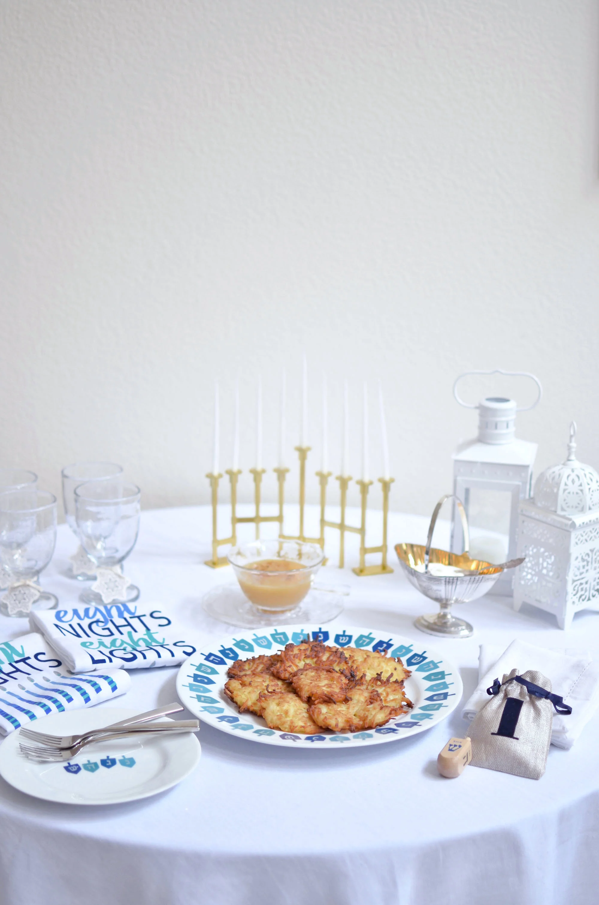 Eight nights, eight lights is the theme of this year’s Hanukkah fest and I couldn’t have had more fun designing this table. While I wanted it to be a typically pretty holiday table, I also wanted to mix in some whimsy for the kids, because after all, Hanukkah is all about the kids. Oh, and eating a ridiculous amount of latkes. If your family is anything like ours it’s also about our traditions, and at least one night during Hanukkah we get together with our closest friends for a great big latkepalooza. And like any other year, we’ll all be ready and waiting for the first latke to come out of the frying pan.