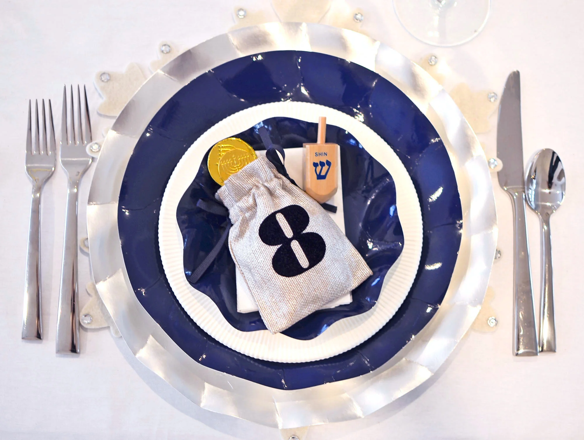 Love all the pretty, but more about easy entertaining? Create it! Sophistiplate is the pretty paper line from Italy I've been talking about and I treat on my table just as I would my fine china, layering and accessorizing it with my flatware and stemware. You can get the look with Sophistiplate's navy and silver Hanukkah set.