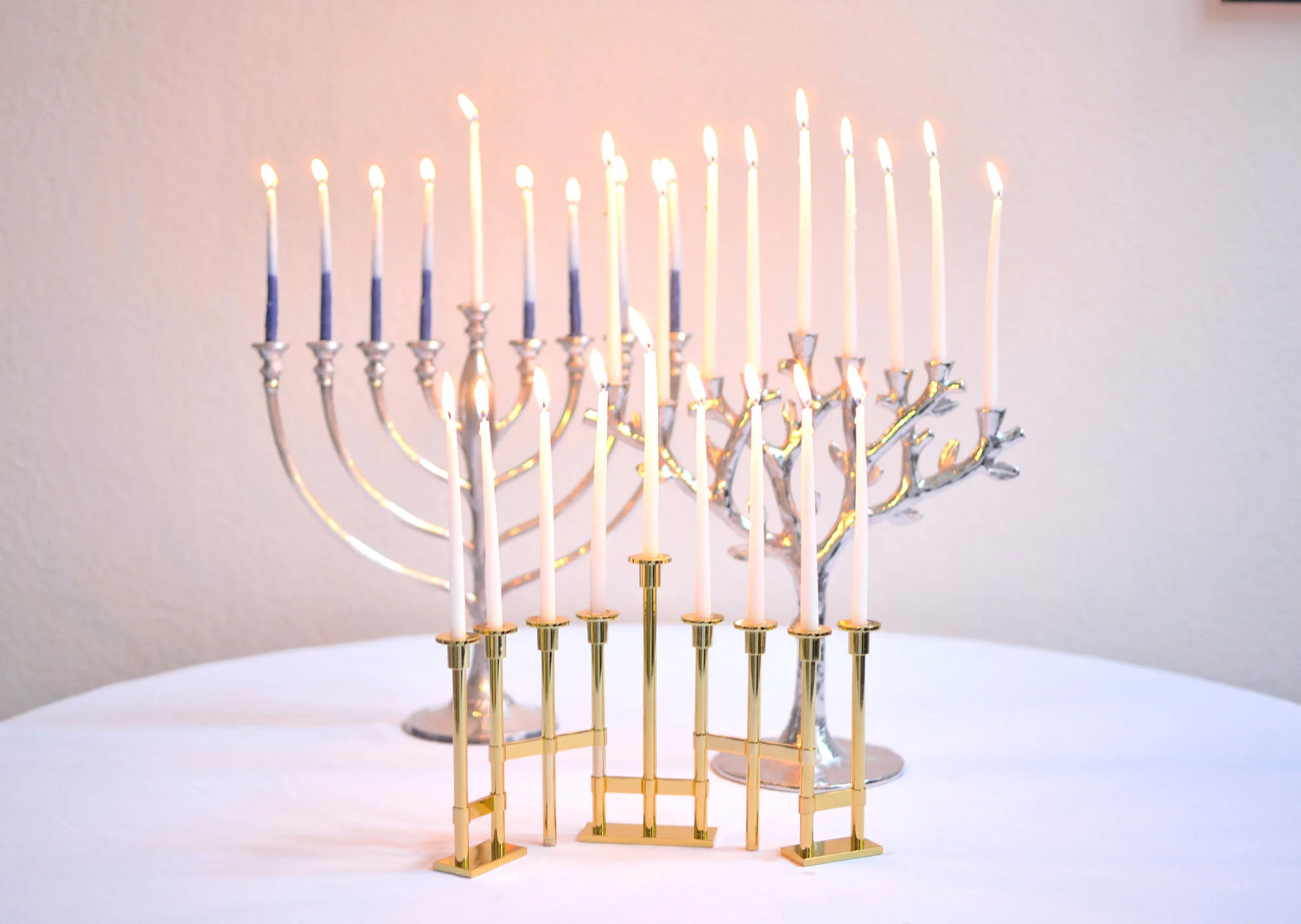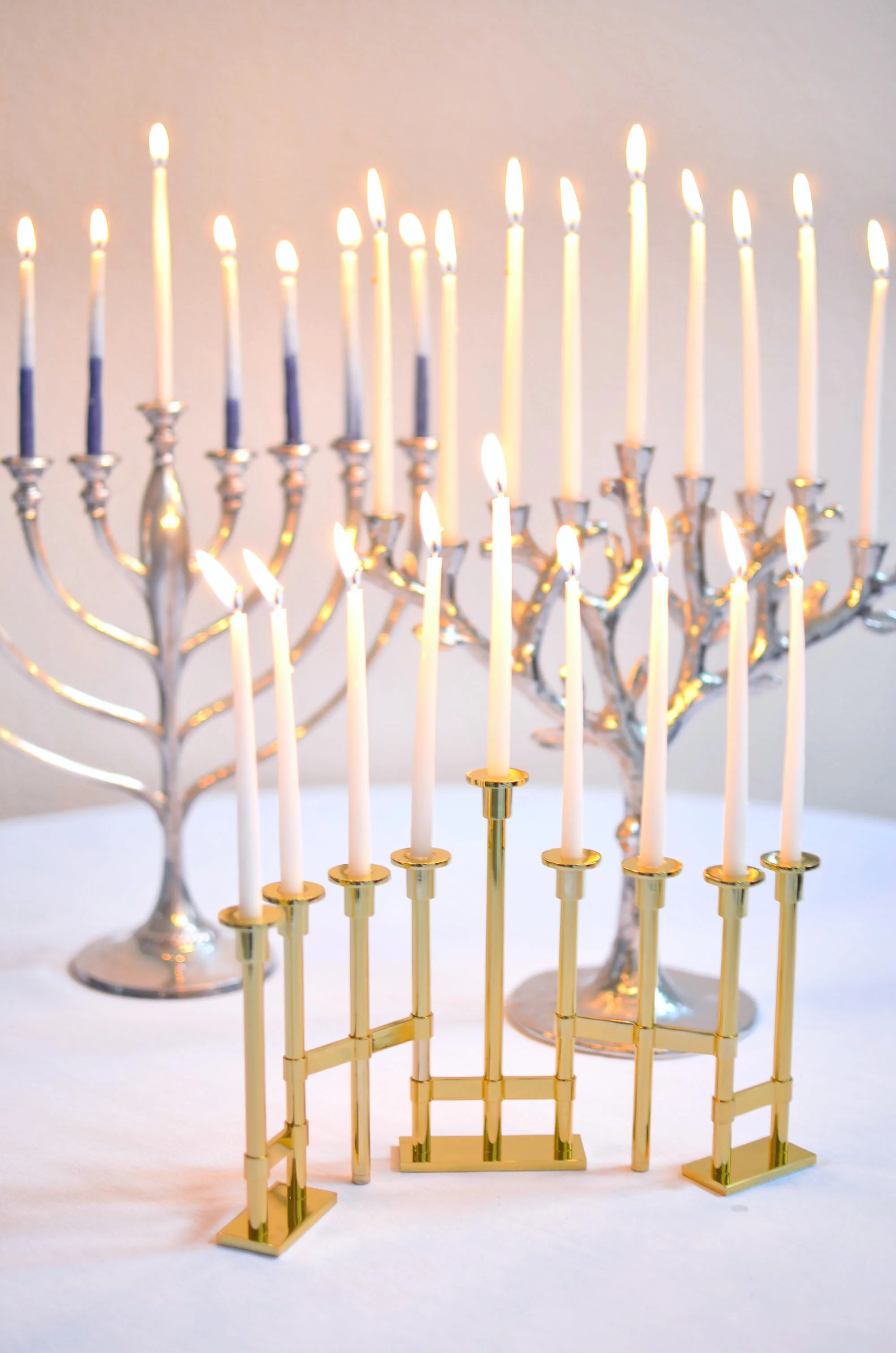 From pretty linens to your favorite latke platters, an easy way to play up your Hanukkah celebrations is with your glittering menorahs.