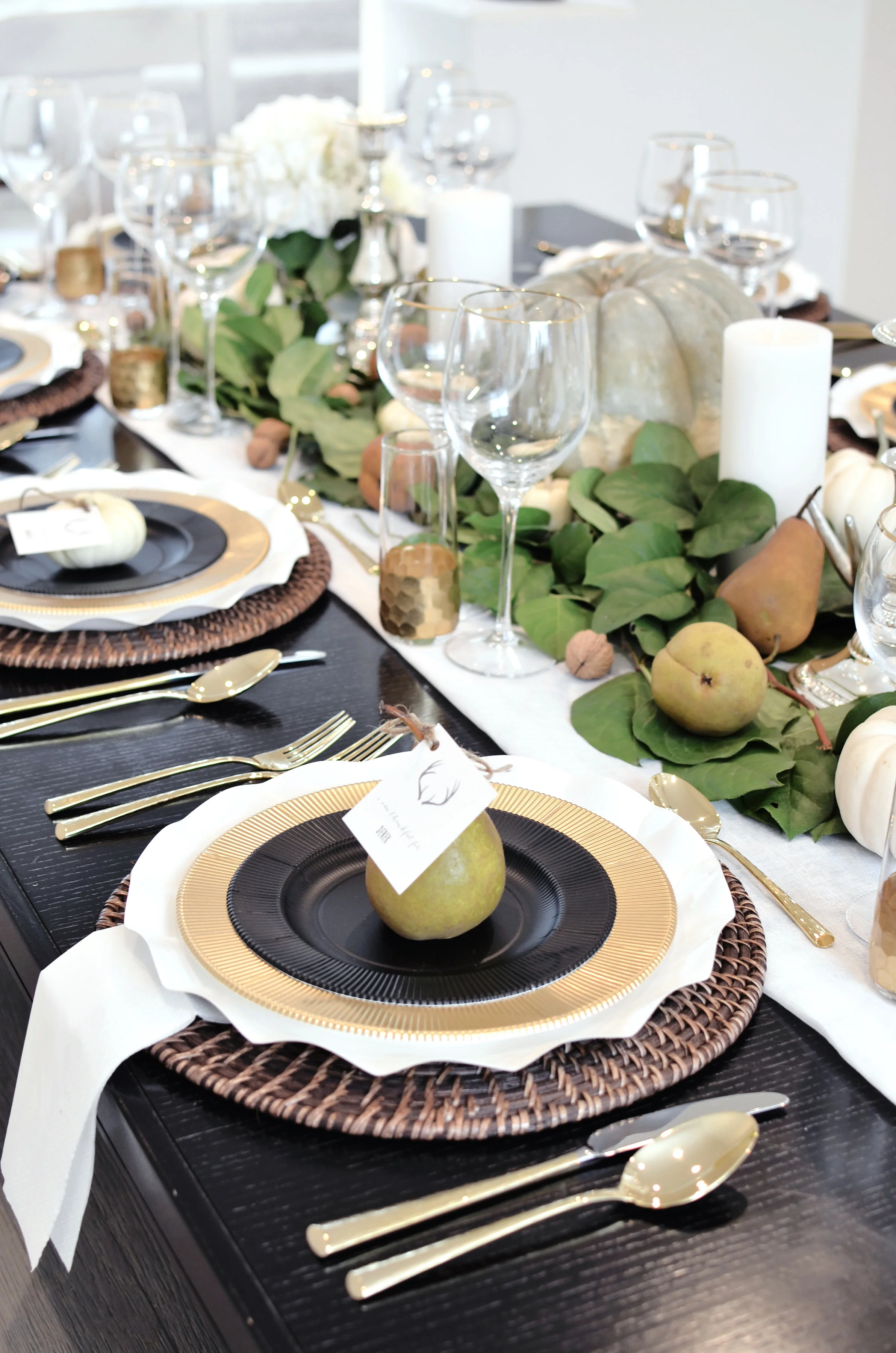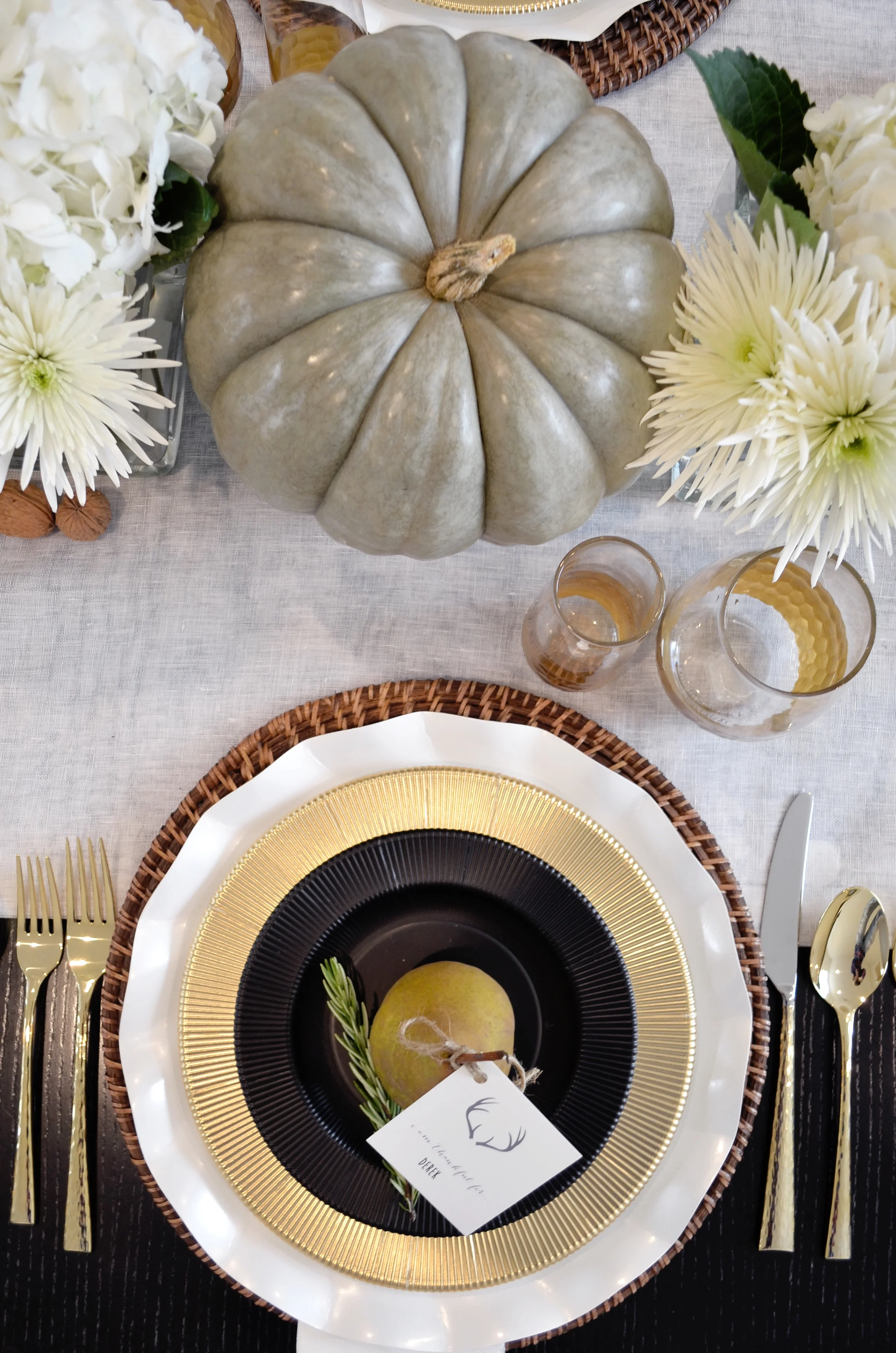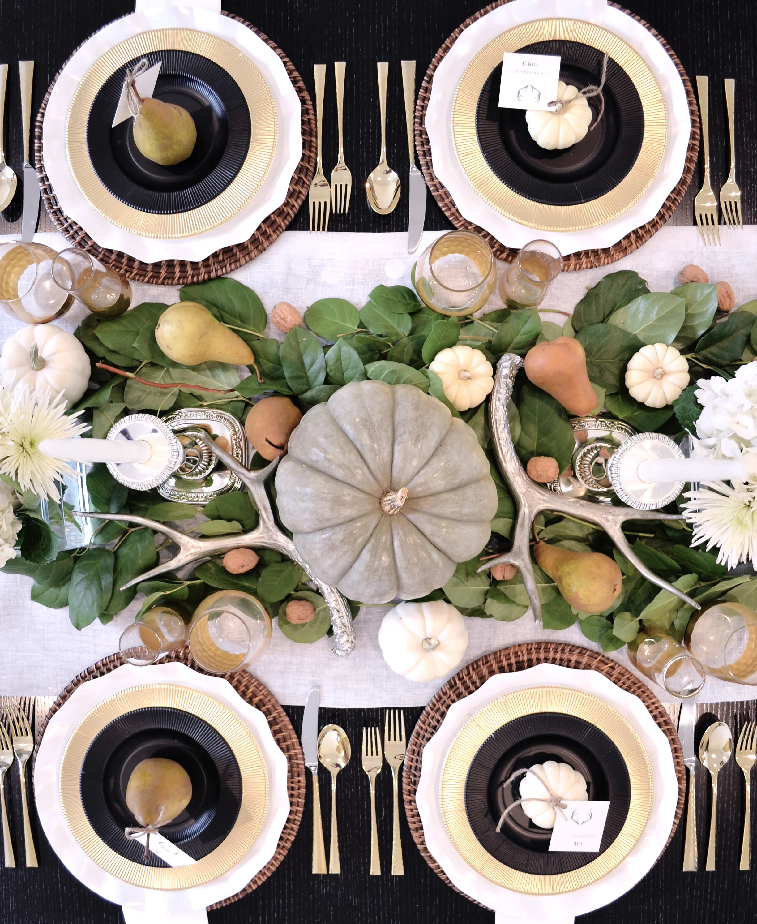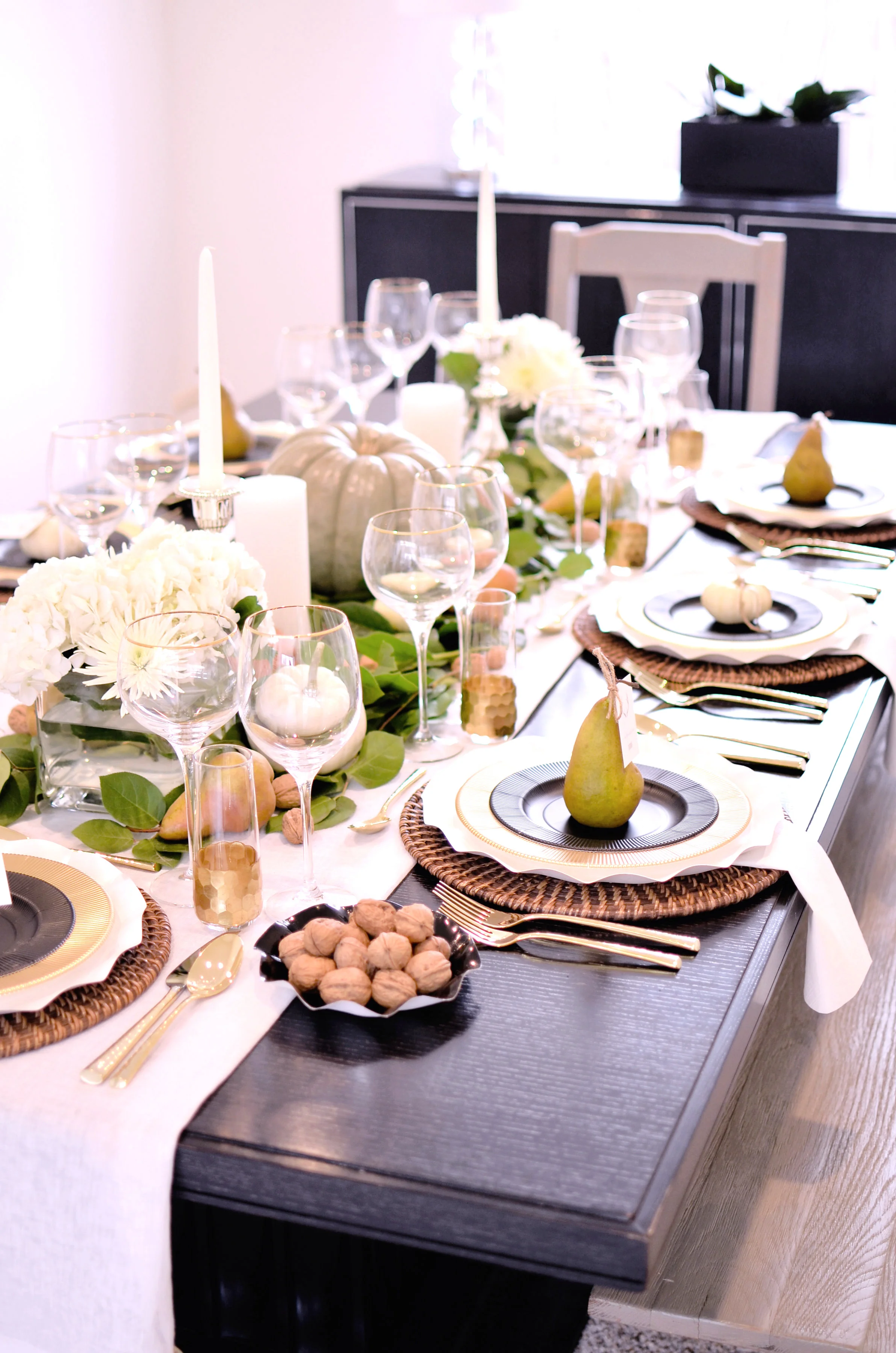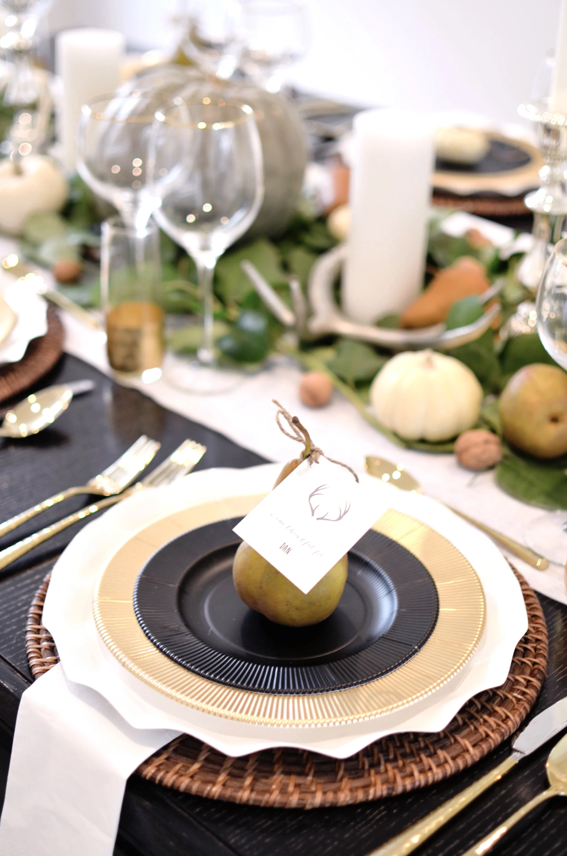 I love the mix of black, white and gold on the table. I think it’s a good balance between sophisticated and casual, so this trio mixed with mini white pumpkins, pears and walnuts will be the theme for this year’s table. The combo just feels so fresh, fall, and festive and says “let’s celebrate” in so many ways.