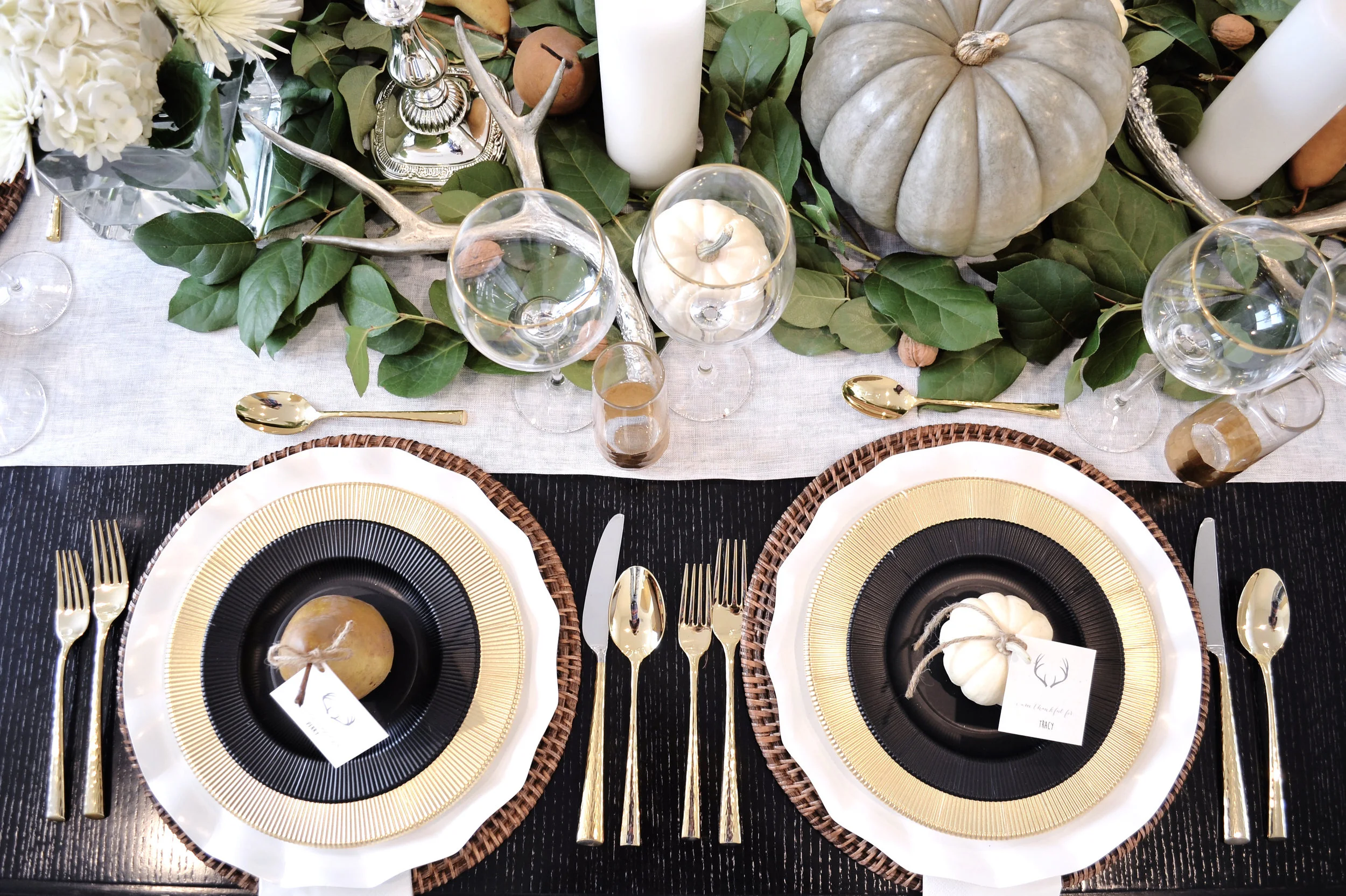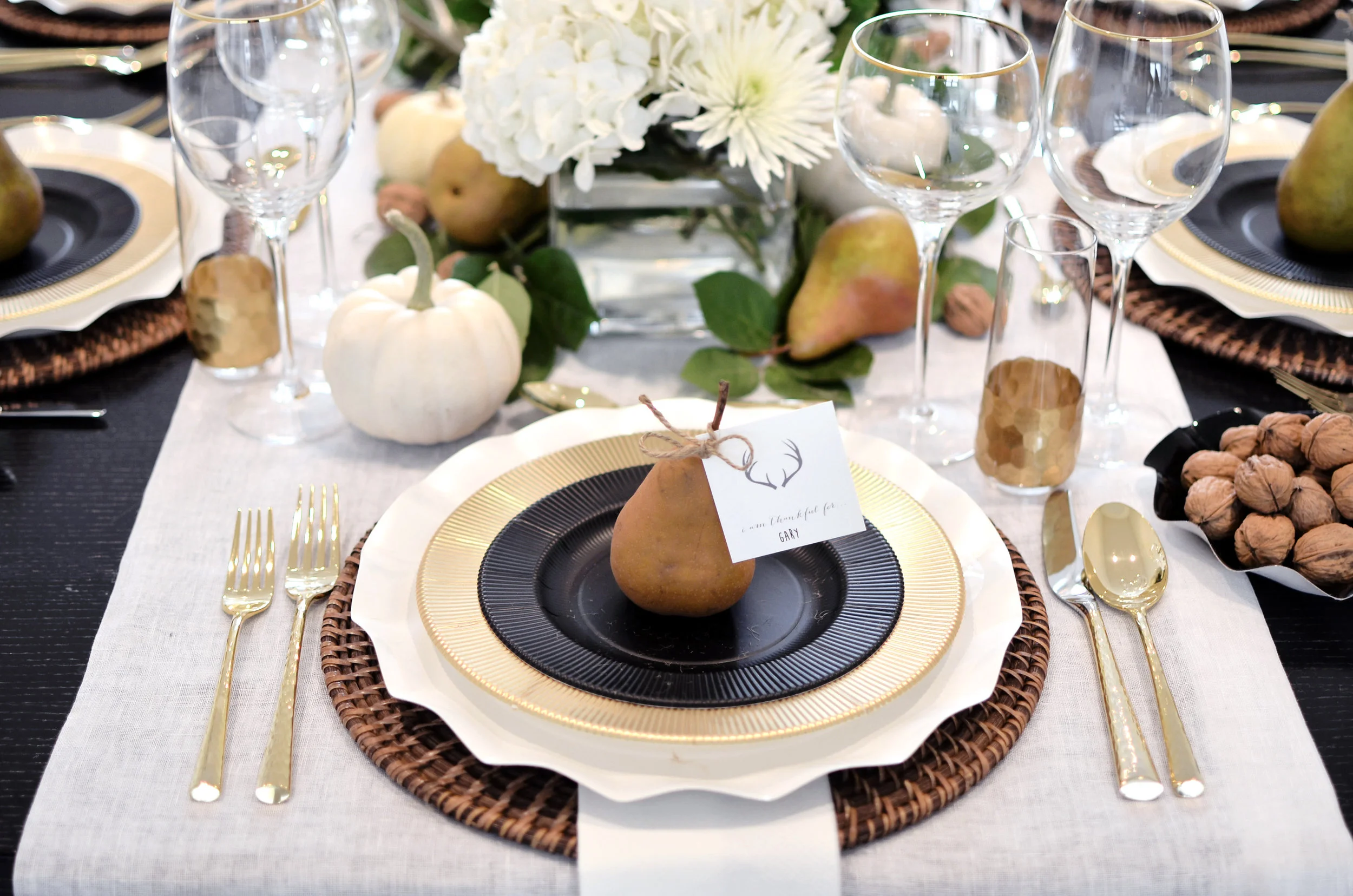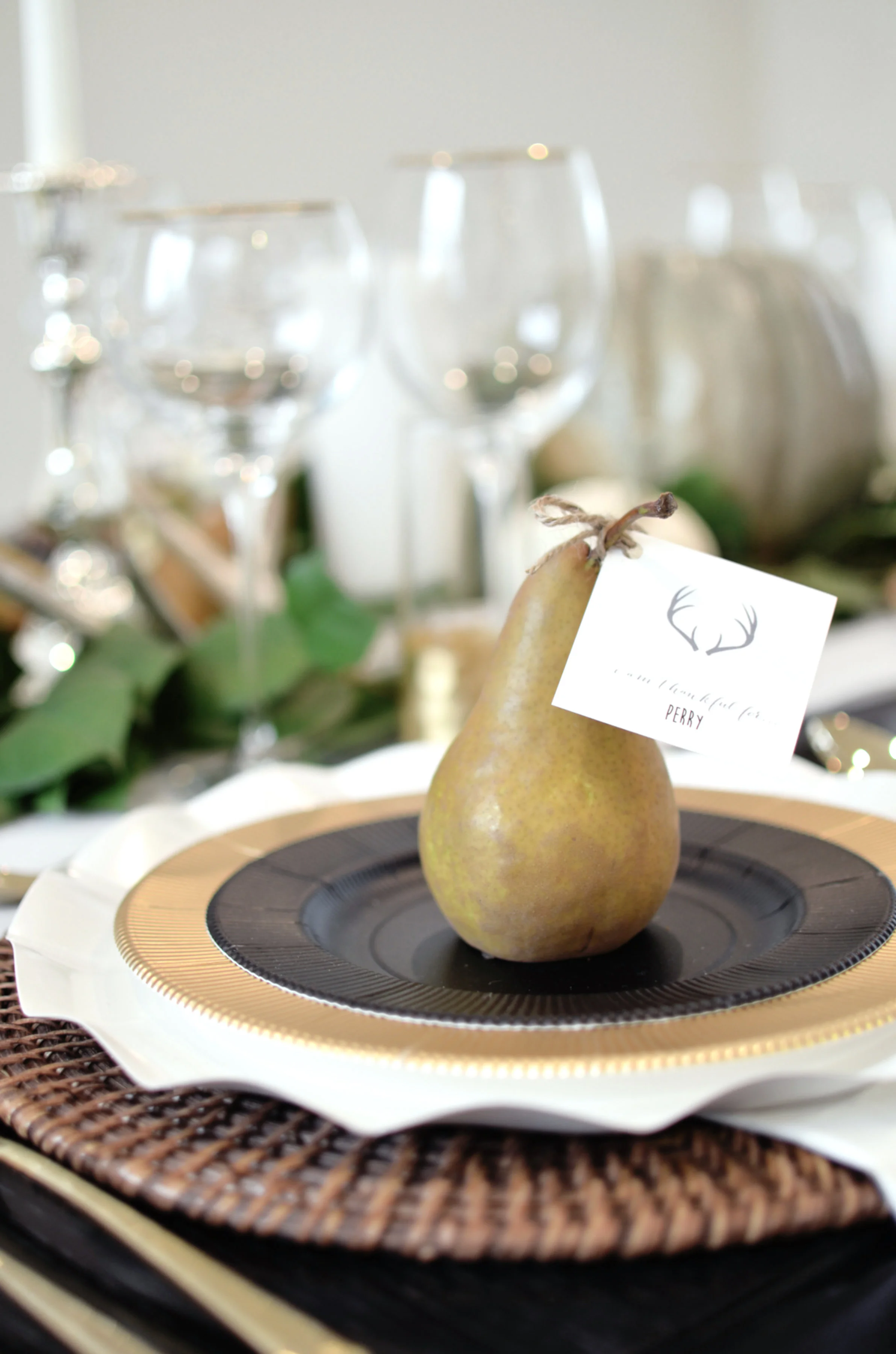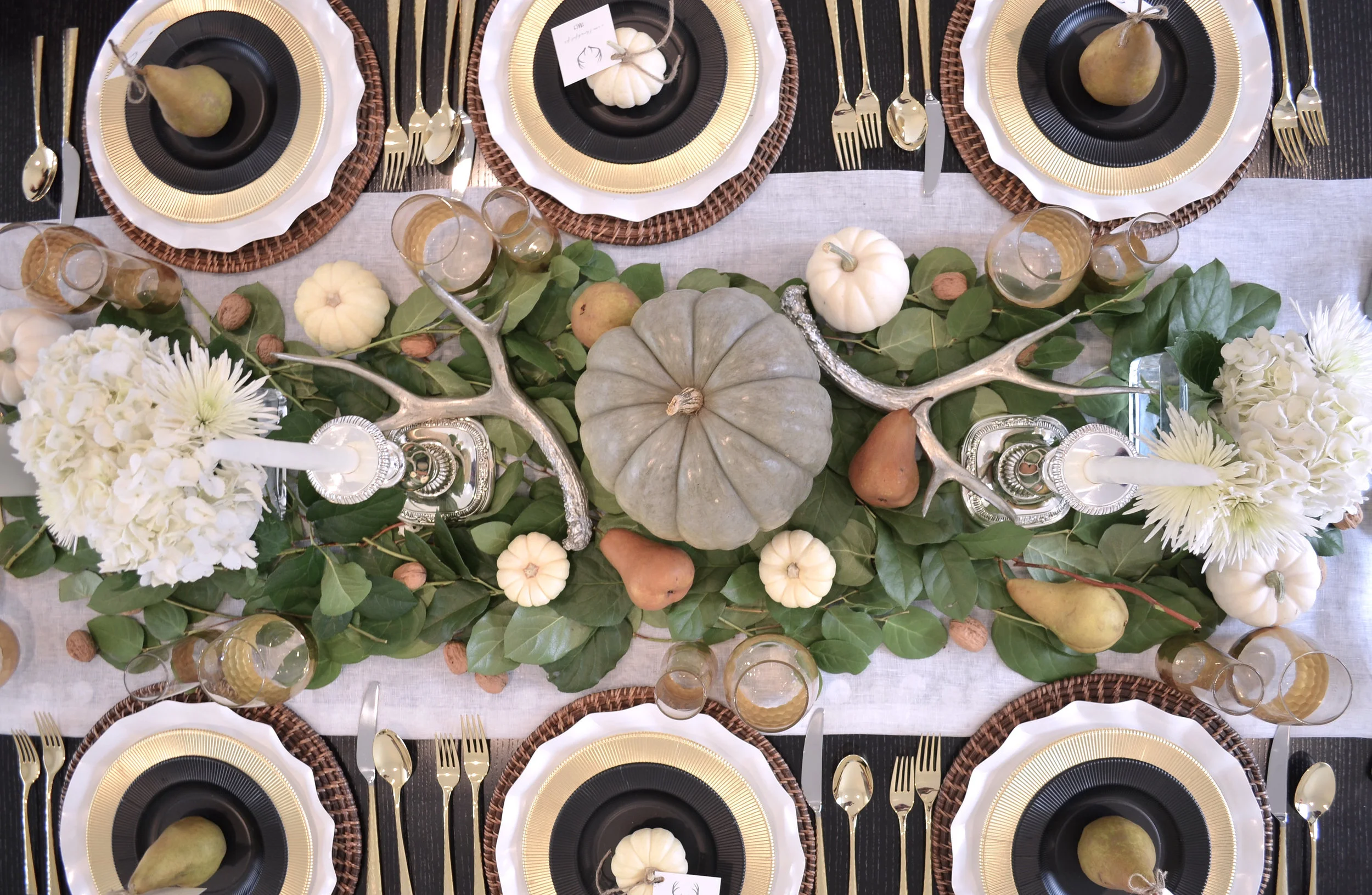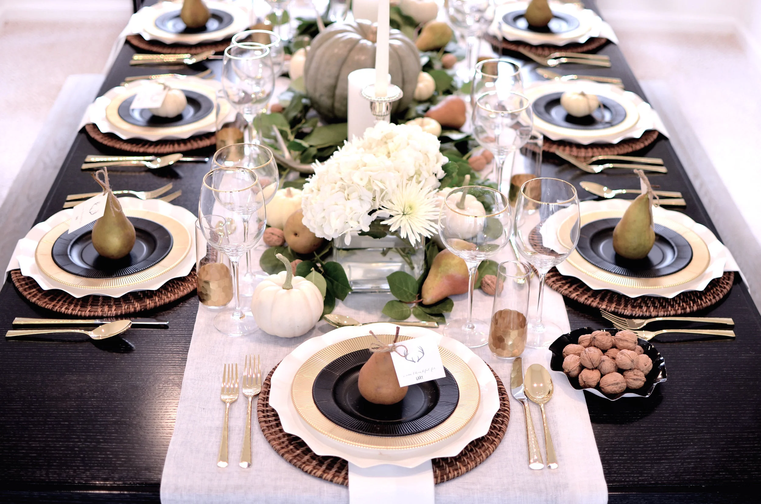 I love the mix of black, white and gold on the table. I think it’s a good balance between sophisticated and casual, so this trio mixed with mini white pumpkins, pears and walnuts will be the theme for this year’s table. The combo just feels so fresh, fall, and festive and says “let’s celebrate” in so many ways.