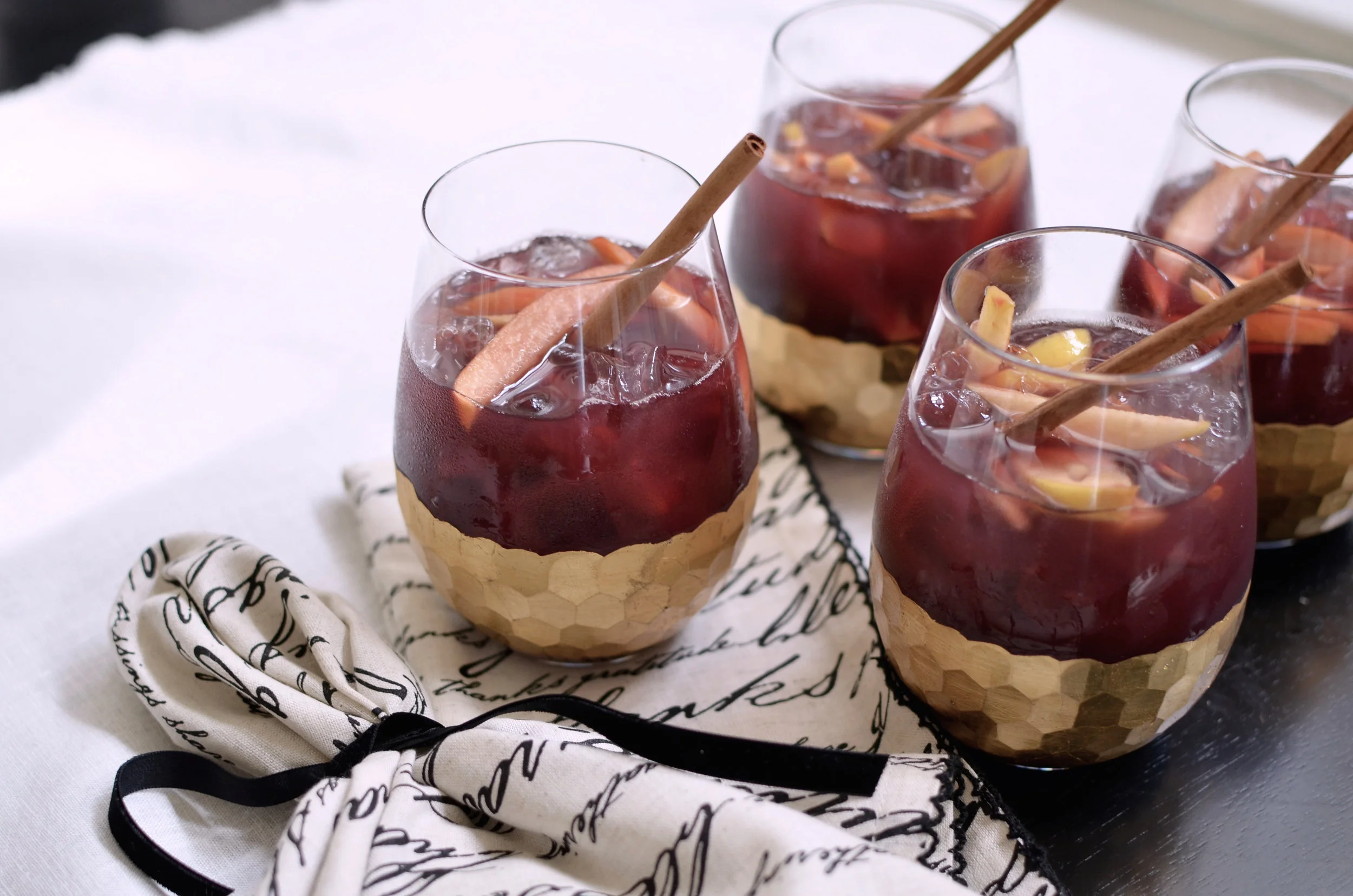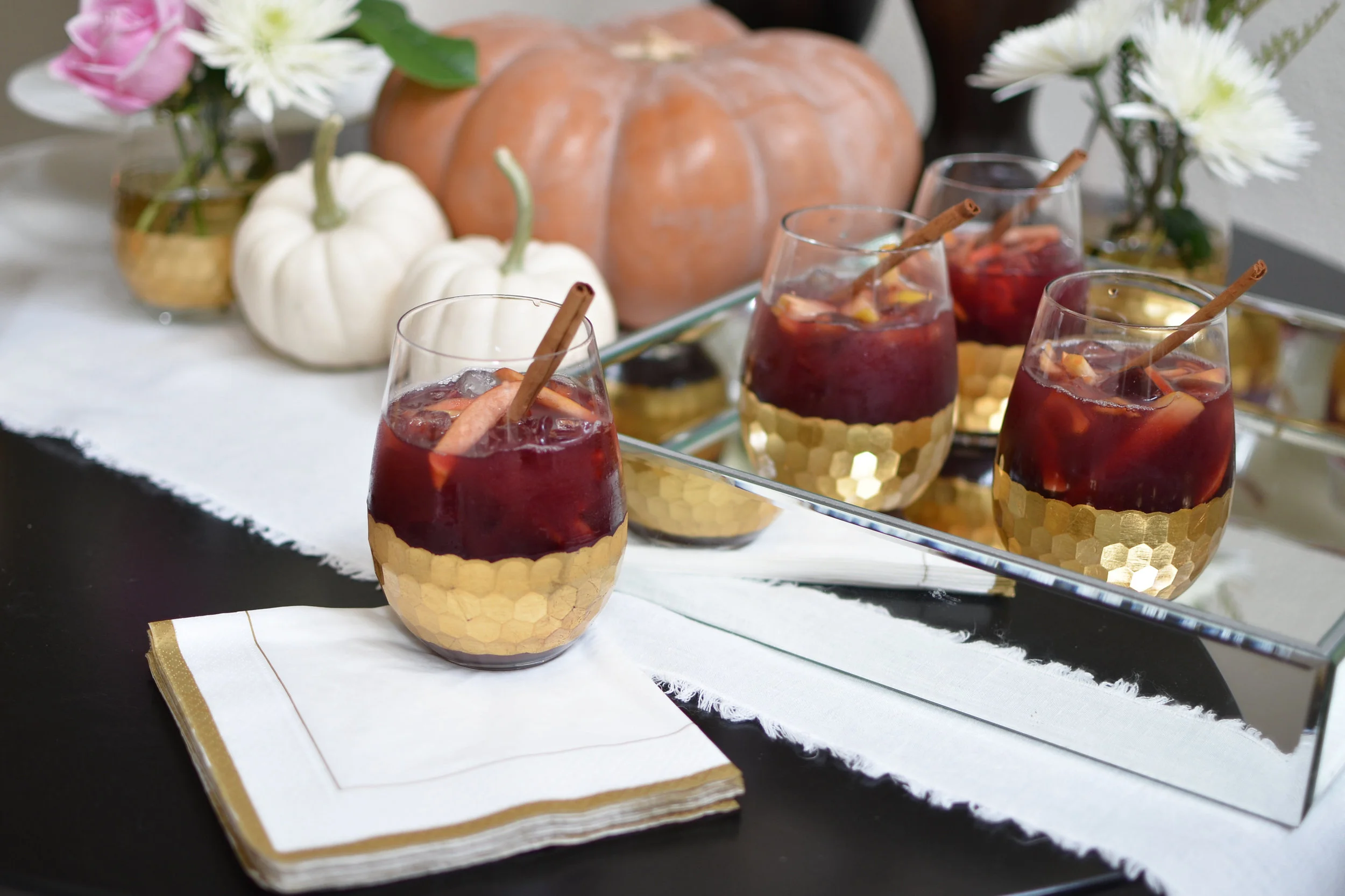 I believe a guest should be greeted with a glass of champagne or a favorite cocktail as they walk through the door. After that, it's fun to set up a self-service bar for everyone to help themselves and keep the hosts free to enjoy their party or event. We love a signature cocktail because they're easy to manage and we always have something sparkling on ice, along with red and white wine ready to pour. This year's signature drink is Apple Cider & Champagne Sangria. Sound great? It is, and all you party people are going to love it!