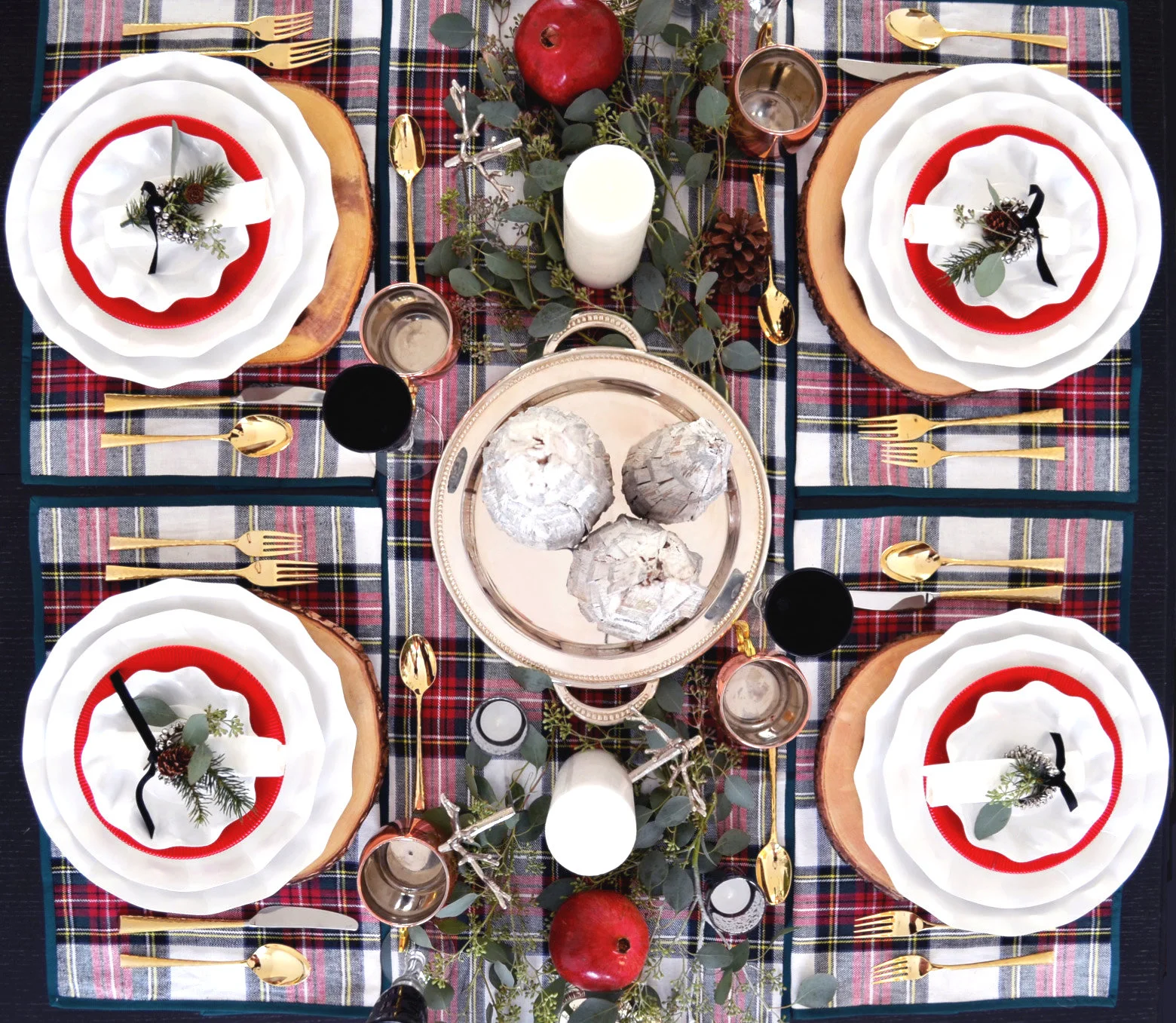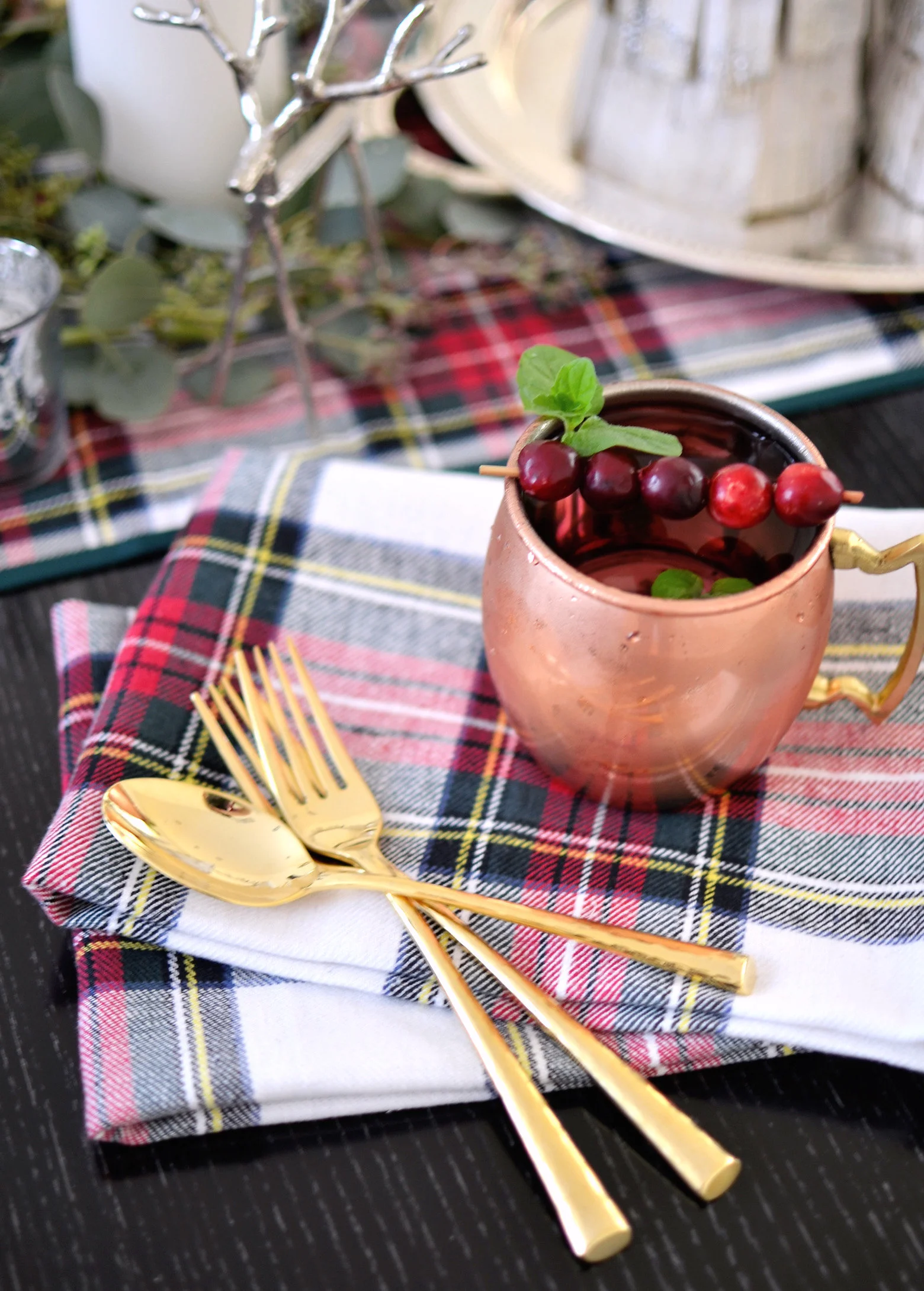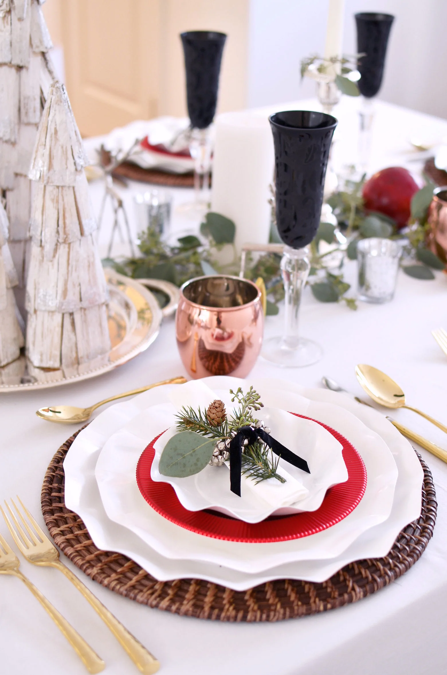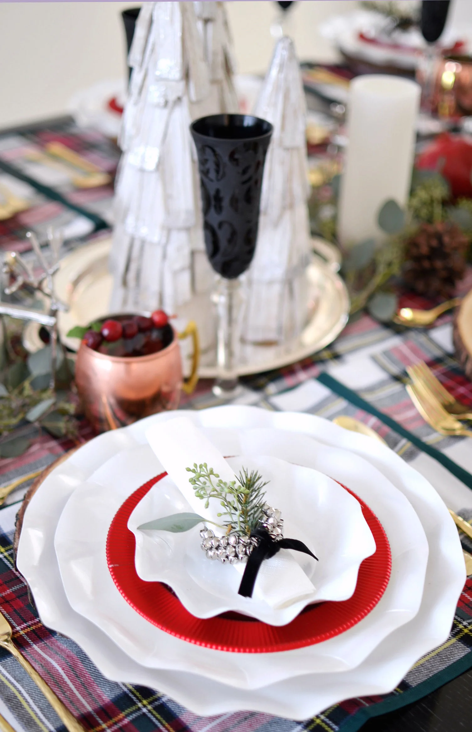 Tablesetting: For this table setting I used the Sophistiplate Bianca Rosso Collection for a traditional and festive holiday look. I think the classic combination of white plates mixed with a hint of red is a perfect balance with the plaid. The collection includes a Pearly White Petalo Colore charger plates and dinner plates, Satin Red Righe Salad/Dessert Plates, and White Petalo Colore appetizer and dessert bowls, along with white napkins. It's sold as a set of eight and all items are also available à la carte. I layered the collection, and used a wood charger underneath to elevate the placesettings and to add a natural element to the table. My favorite part? The mix of metals! The medley of my Marchesa Imperial Gold Caviar flatware, copper cocktail mugs, and silver serving pieces added a perfect amount of holiday glow. I think the real drama came in with my favorite black champagne flutes. Mine are vintage, but you can find similar ones at Z Gallerie, where I bought mine several years ago.