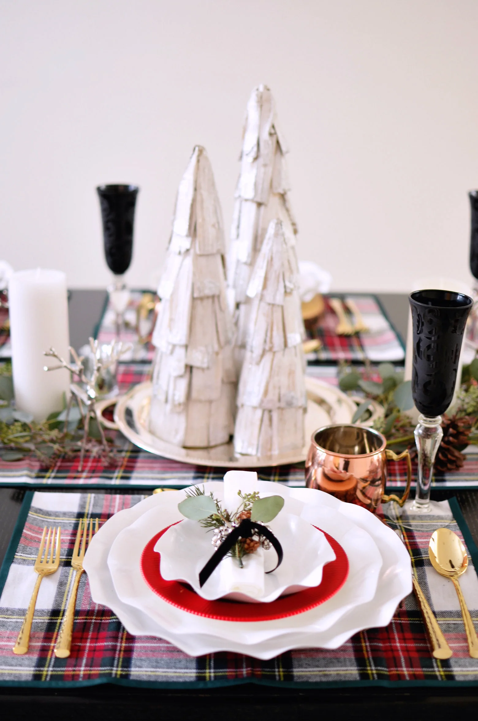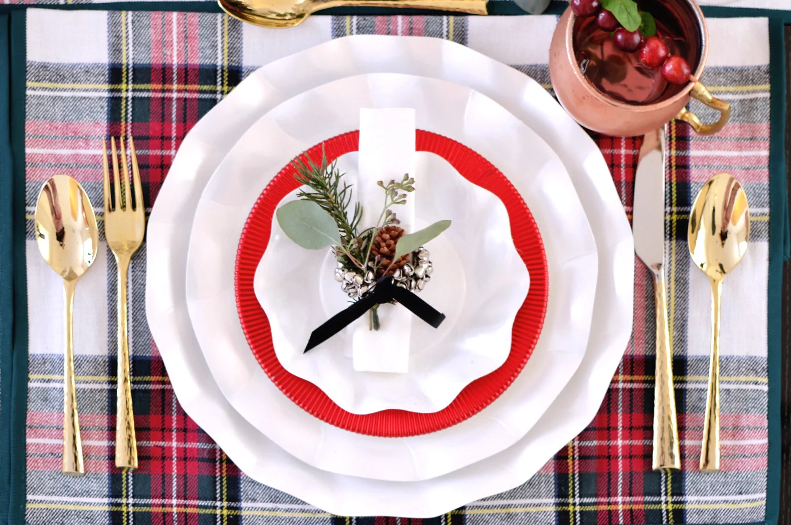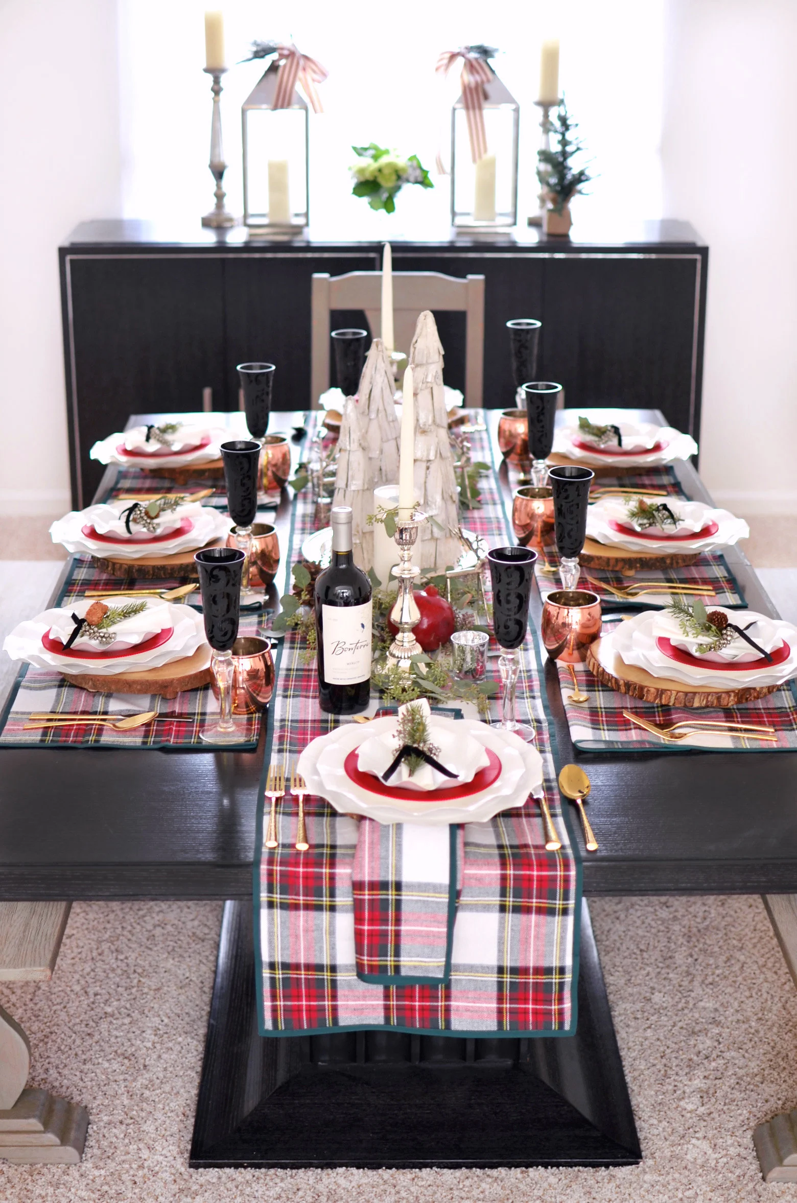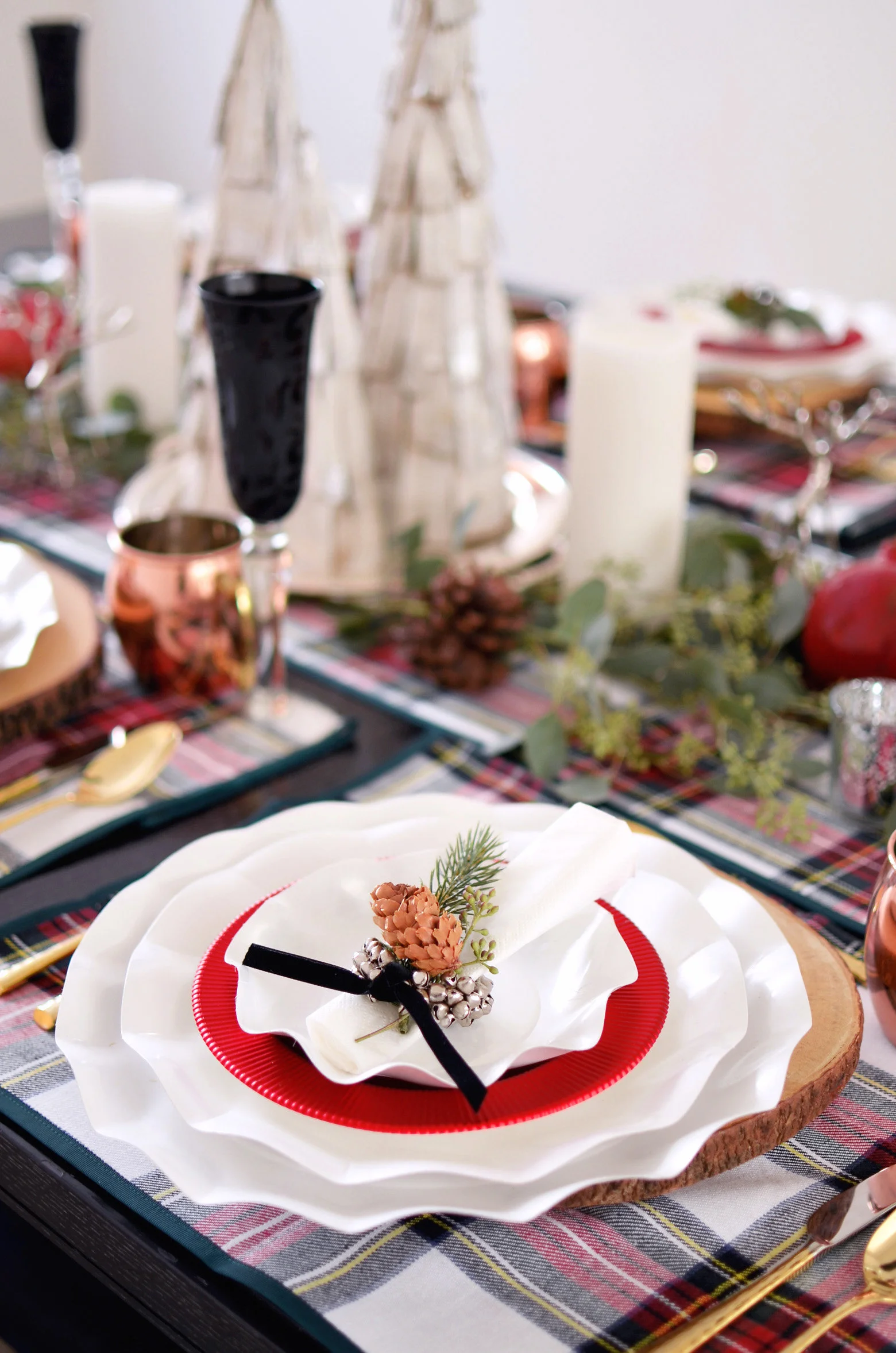 Tablesetting: For this table setting I used the Sophistiplate Bianca Rosso Collection for a traditional and festive holiday look. I think the classic combination of white plates mixed with a hint of red is a perfect balance with the plaid. The collection includes a Pearly White Petalo Colore charger plates and dinner plates, Satin Red Righe Salad/Dessert Plates, and White Petalo Colore appetizer and dessert bowls, along with white napkins. It's sold as a set of eight and all items are also available à la carte. I layered the collection, and used a wood charger underneath to elevate the placesettings and to add a natural element to the table. My favorite part? The mix of metals! The medley of my Marchesa Imperial Gold Caviar flatware, copper cocktail mugs, and silver serving pieces added a perfect amount of holiday glow. I think the real drama came in with my favorite black champagne flutes. Mine are vintage, but you can find similar ones at Z Gallerie, where I bought mine several years ago.