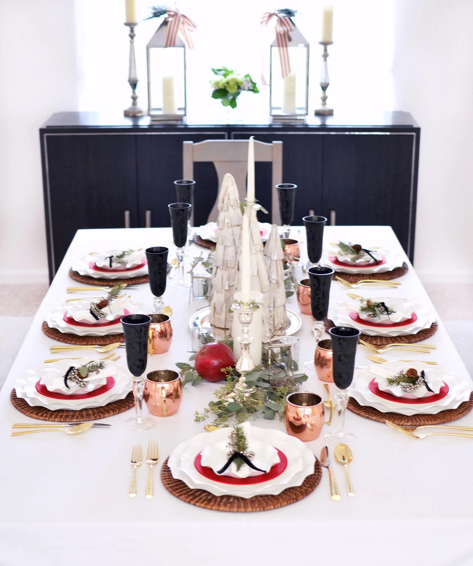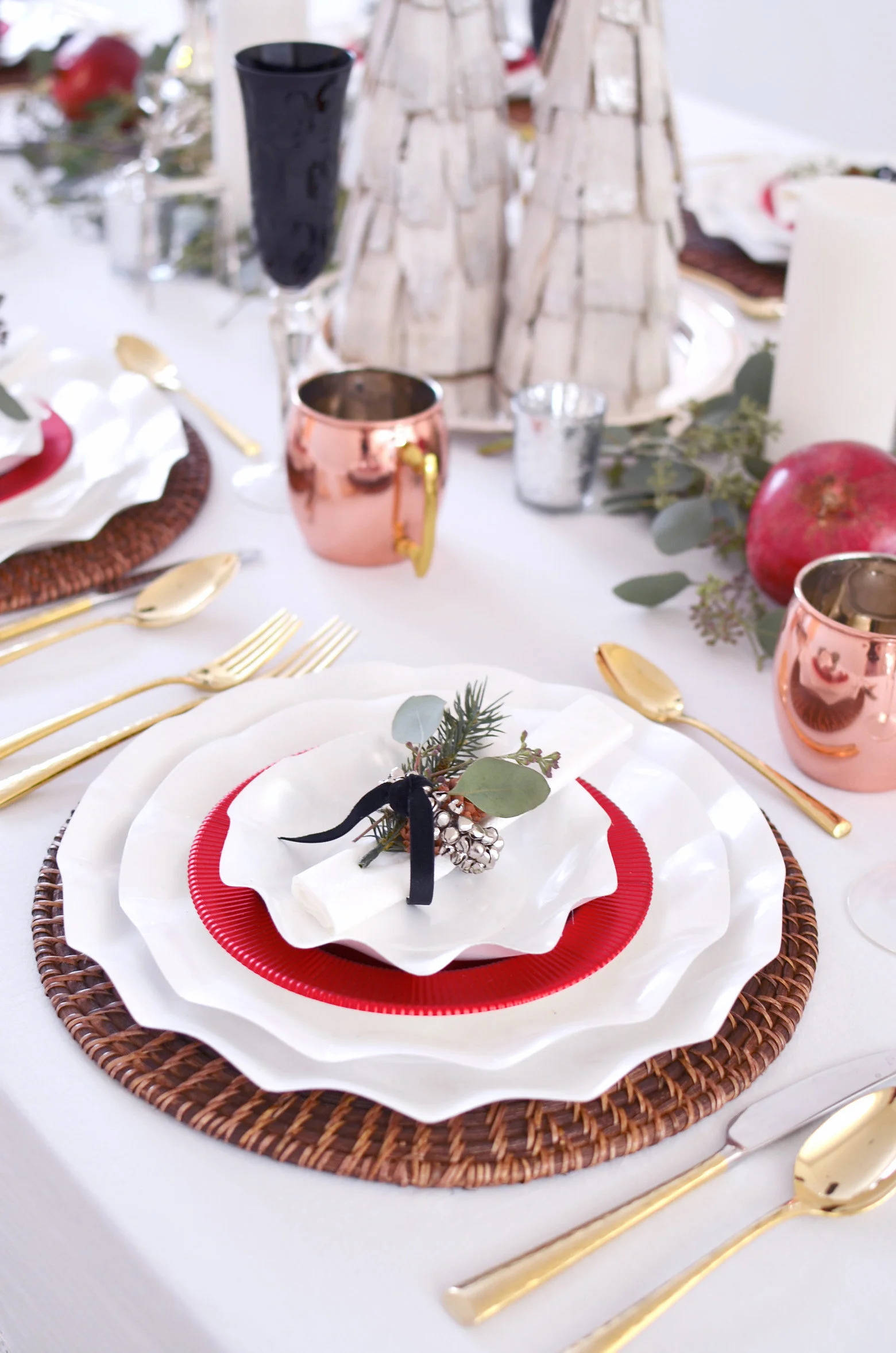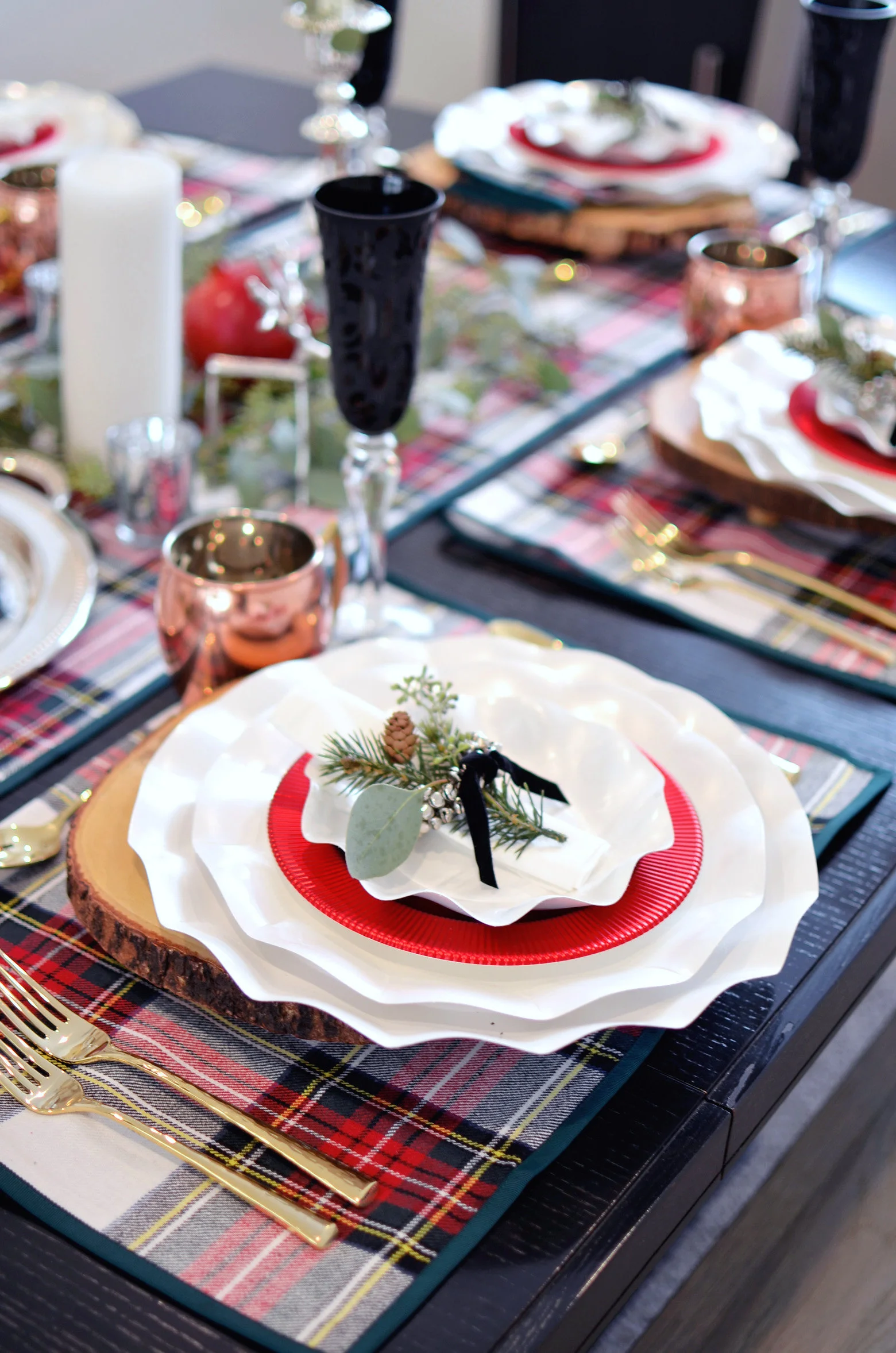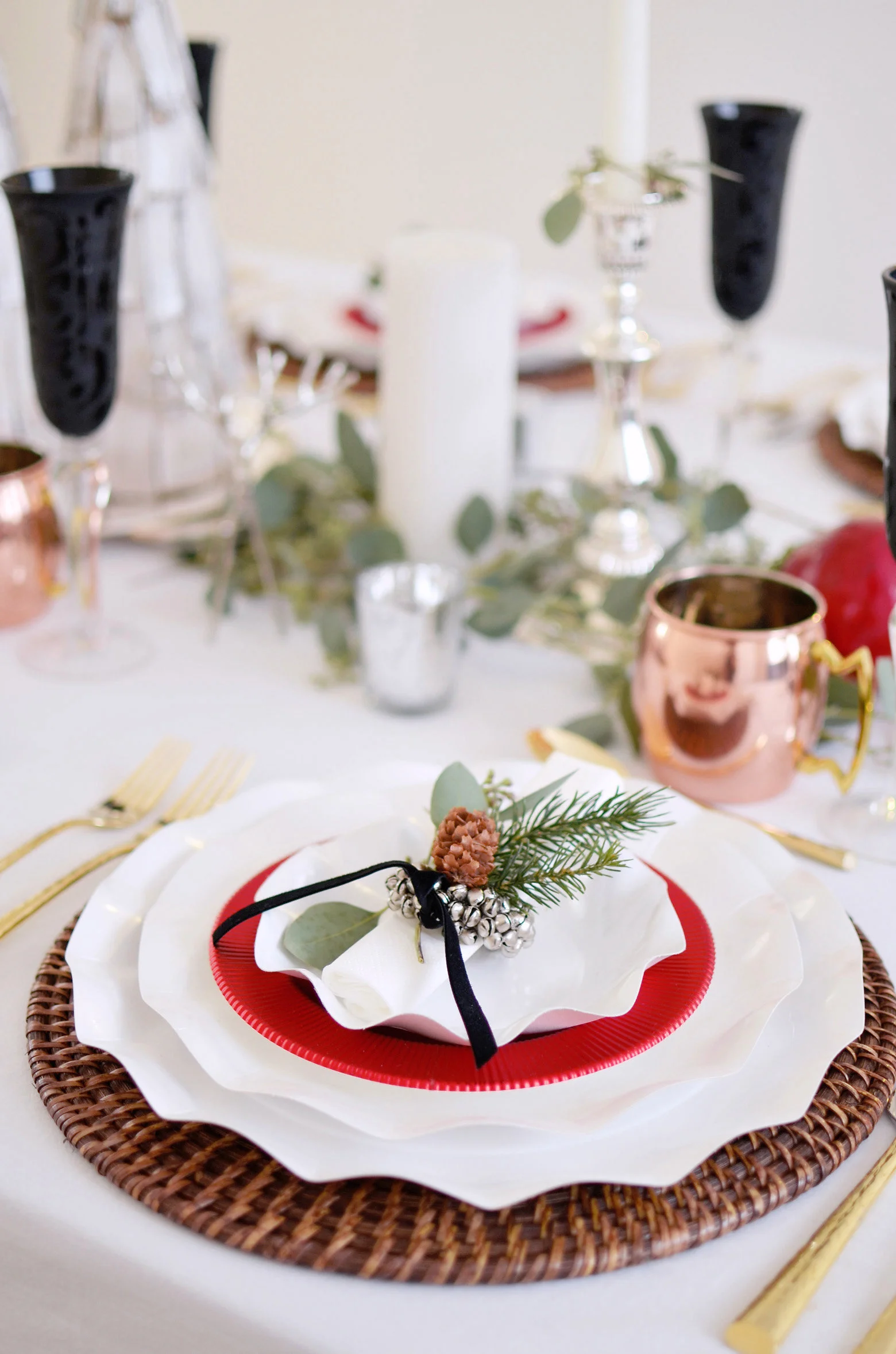 Tablesetting: For this table setting I used the Sophistiplate Bianca Rosso Collection for a traditional and festive holiday look. I think the classic combination of white plates mixed with a hint of red is a perfect balance with the plaid. The collection includes a Pearly White Petalo Colore charger plates and dinner plates, Satin Red Righe Salad/Dessert Plates, and White Petalo Colore appetizer and dessert bowls, along with white napkins. It's sold as a set of eight and all items are also available à la carte. I layered the collection, and used a wood charger underneath to elevate the placesettings and to add a natural element to the table. My favorite part? The mix of metals! The medley of my Marchesa Imperial Gold Caviar flatware, copper cocktail mugs, and silver serving pieces added a perfect amount of holiday glow. I think the real drama came in with my favorite black champagne flutes. Mine are vintage, but you can find similar ones at Z Gallerie, where I bought mine several years ago.