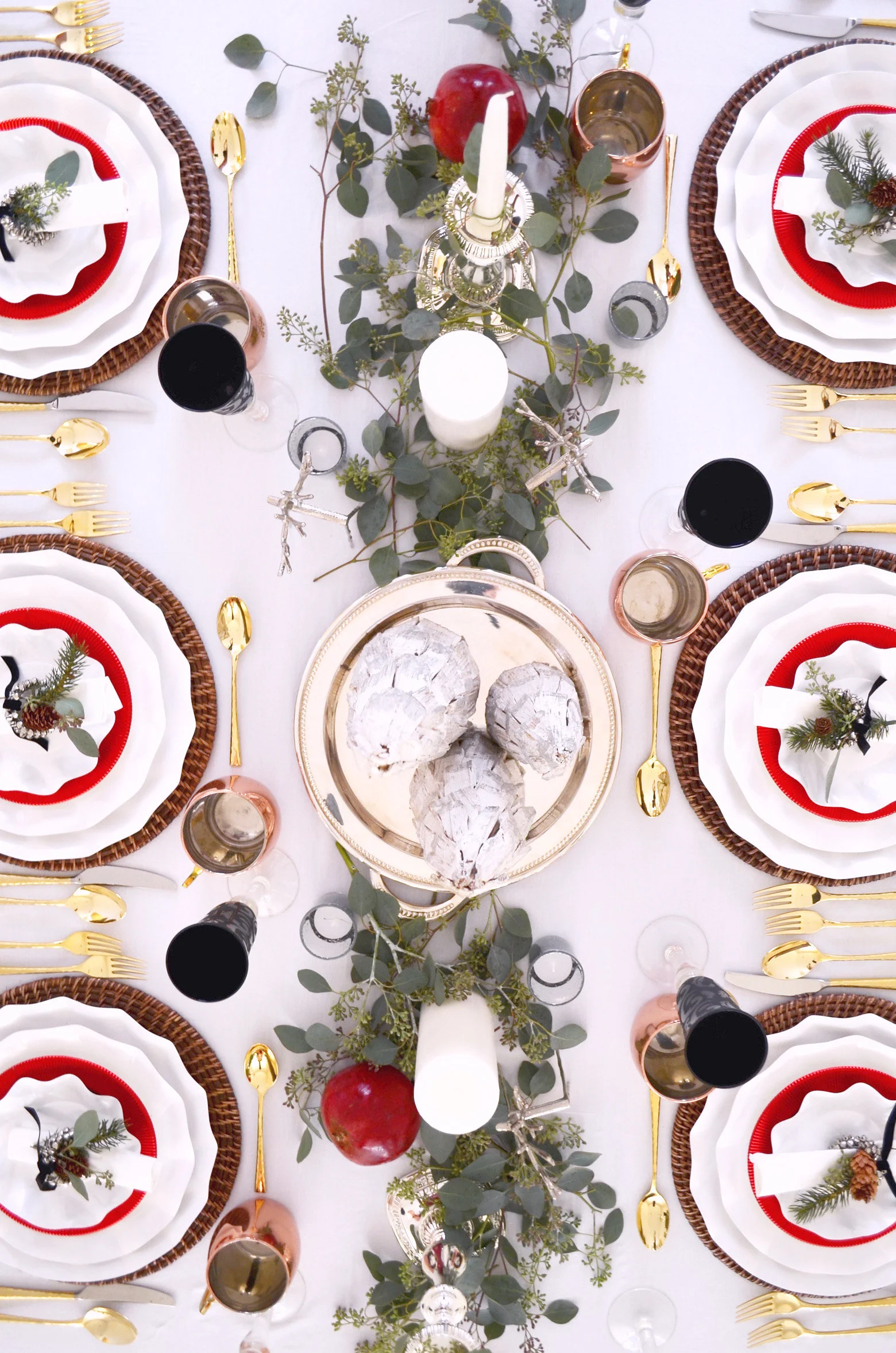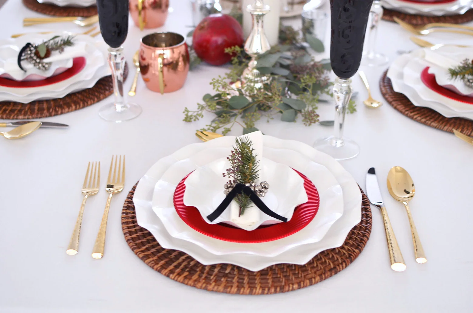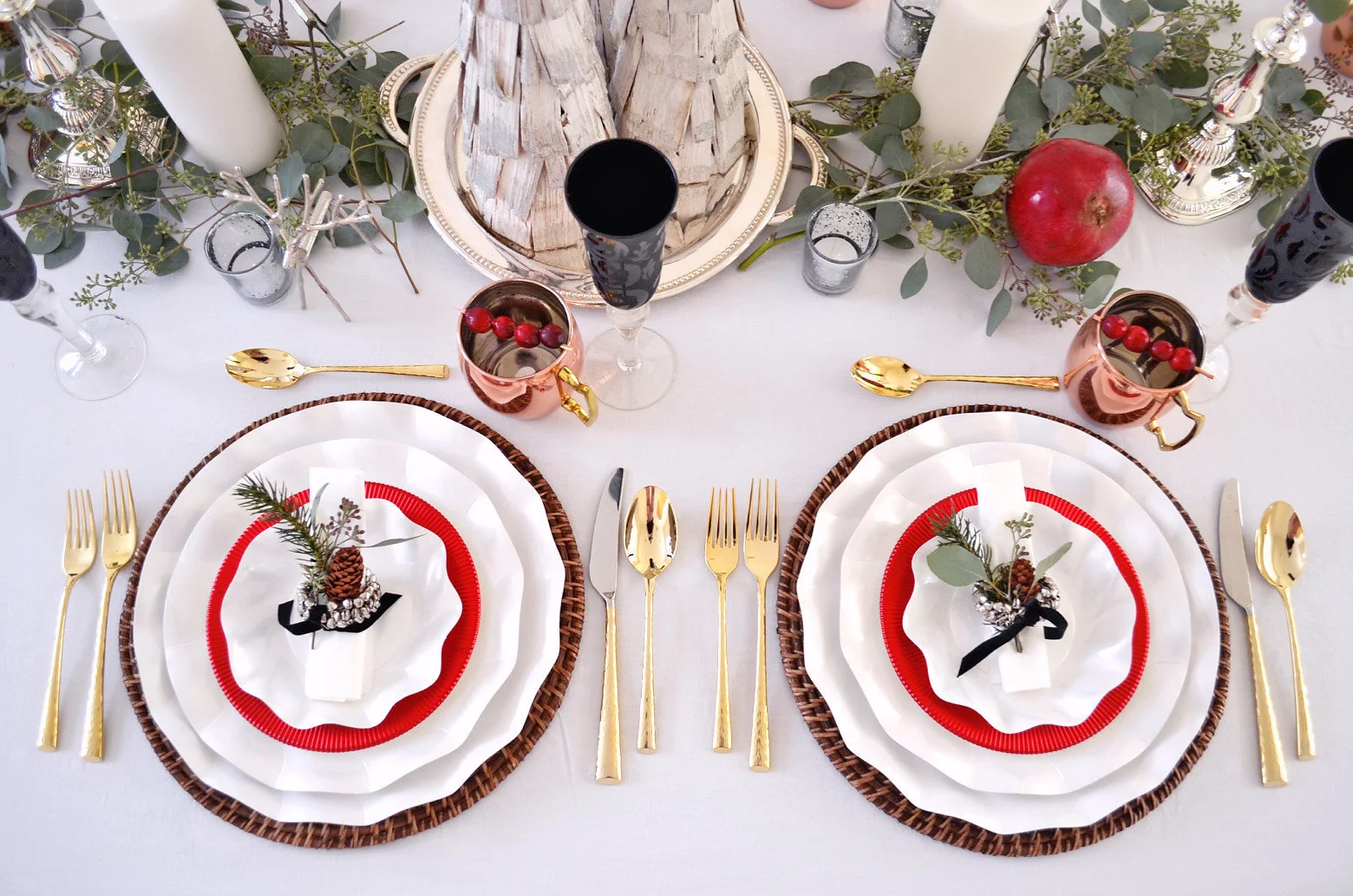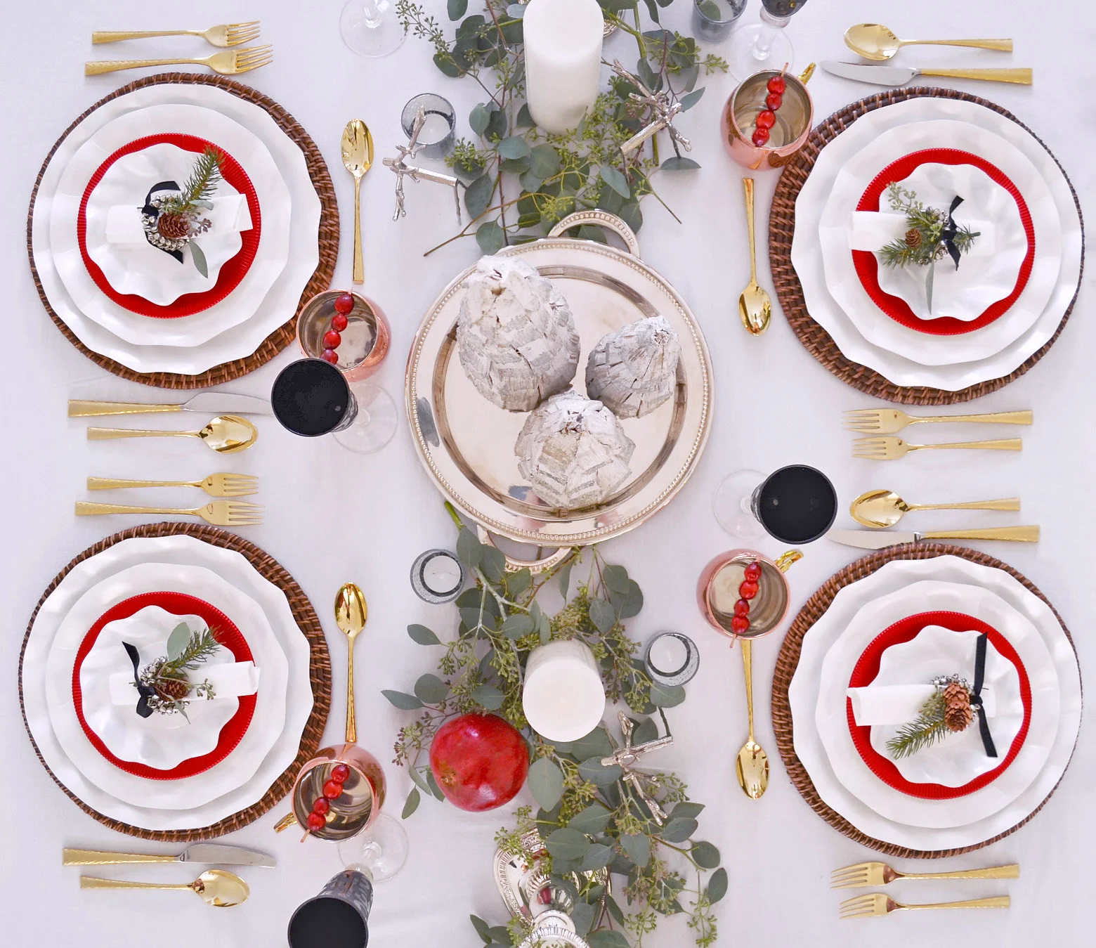 Tablesetting: For this table setting I used the Sophistiplate Bianca Rosso Collection for a traditional and festive holiday look. I think the classic combination of white plates mixed with a hint of red is a perfect balance with the plaid. The collection includes a Pearly White Petalo Colore charger plates and dinner plates, Satin Red Righe Salad/Dessert Plates, and White Petalo Colore appetizer and dessert bowls, along with white napkins. It's sold as a set of eight and all items are also available à la carte. I layered the collection, and used a wood charger underneath to elevate the placesettings and to add a natural element to the table. My favorite part? The mix of metals! The medley of my Marchesa Imperial Gold Caviar flatware, copper cocktail mugs, and silver serving pieces added a perfect amount of holiday glow. I think the real drama came in with my favorite black champagne flutes. Mine are vintage, but you can find similar ones at Z Gallerie, where I bought mine several years ago.