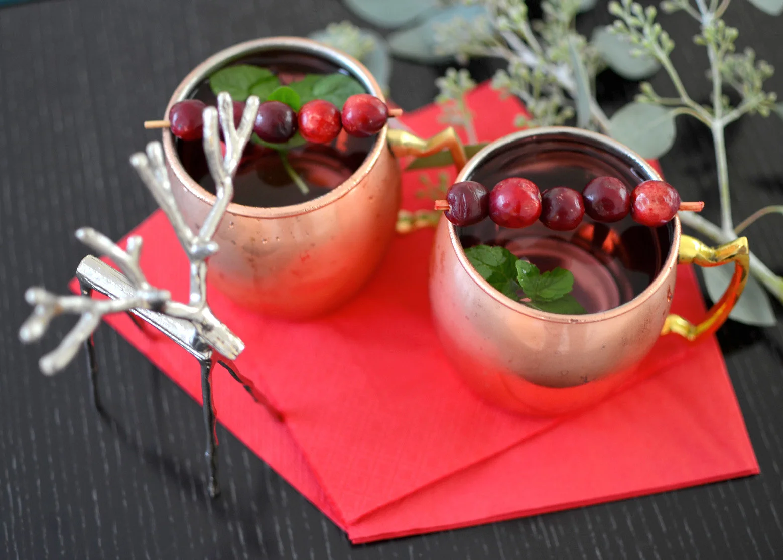 Give all ingredients a brisk stir. Top with fresh mint leave and garnish with cranberries. You can also make a batch in a pitcher and refrigerate. Pour mixture into a mule when guests arrive, top with ginger beer, mint and garnish.