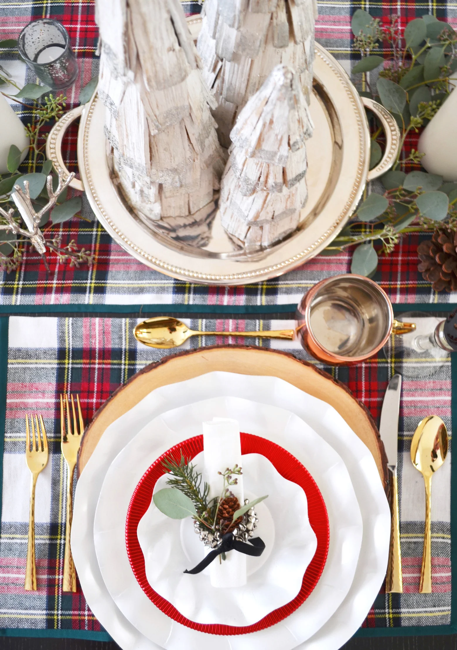 Decor: I wanted the decor to be as charming and traditional as the classic plaid linens. I laid branches of berry eucalyptus down the runner, added white washed wood trees on a silver tray, a few pine cones, white pillar candles, silver mercury votive holders, my favorite reindeer ornaments, silver candle sticks, and scattered fresh pomegranates for a splash of color. The jingle bell napkin rings were a darling addition and the black velvet ribbon added just enough color to the placesetting. I tucked in some greenery for a little more holiday vibe.