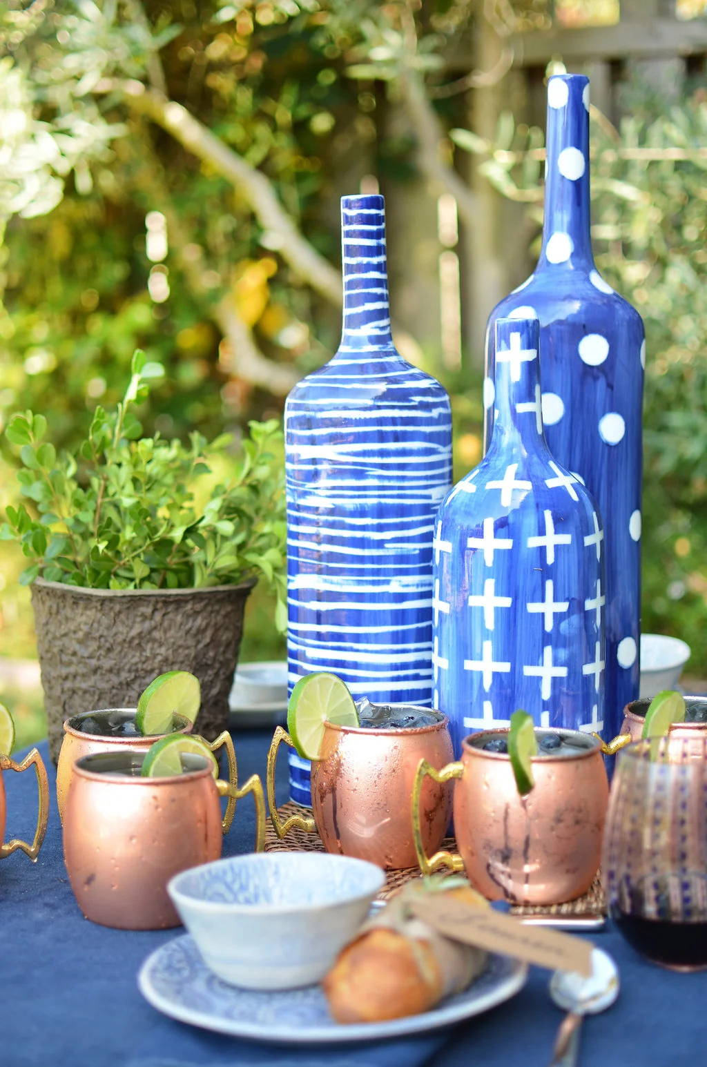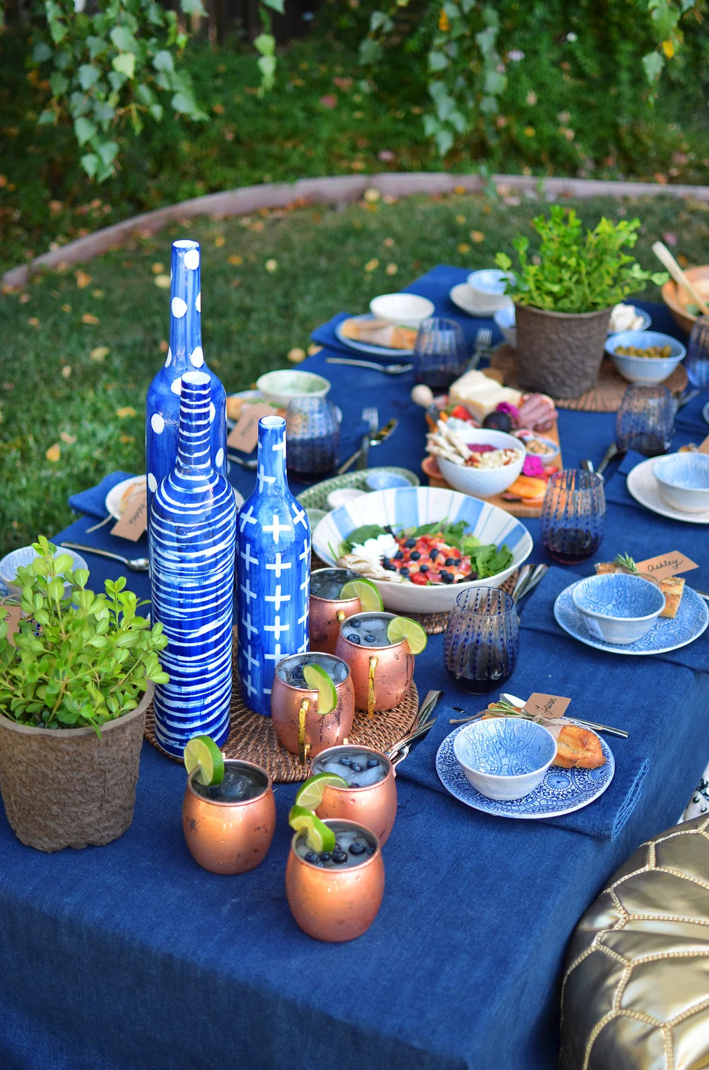 3. Decor: Go un-traditional. As with any party, once you decide on your theme and colors, be creative and first shop at home (or at Mom's) for vases, votives, candle holders, and accent pieces, which is what I did here with a vignette of my Capri Bottles. I love the vibe they bring to the table and how they accent Wonki Ware. Plus, blue and white is always a delight. We cut fresh greenery from the garden, and lemons and limes from the trees. One thing I know for sure, I'm sure going to miss the bounty from the yard come this winter.