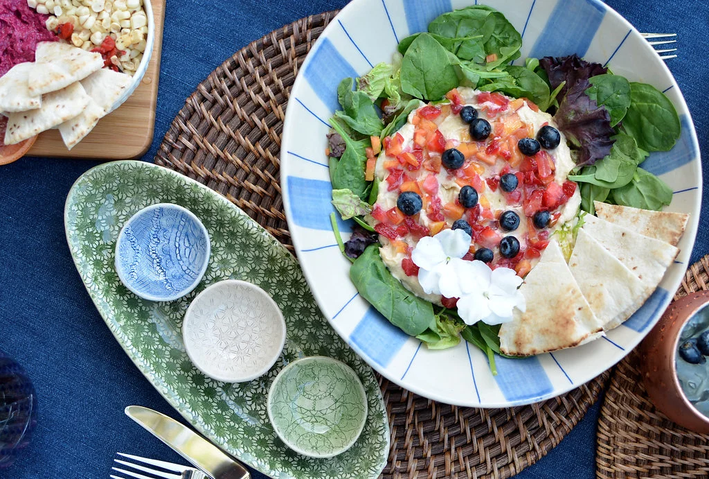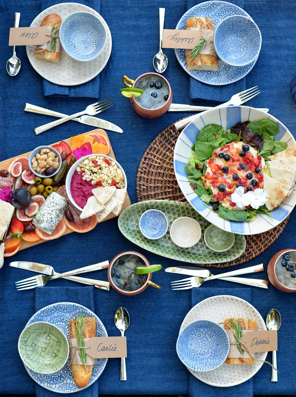 2. The Fare: Create your own mini-feast. We're inspired by Heirloom LA (check them out) and while we're not the masters of cheese and fruit presentations, we're truly inspired by them. Using a Entertain 365 Cheeseboard & Dip Bowl by Lenox, we created our own epic charcuterie board with cheeses, cured meats, Marcona almonds, beet hummus with fresh corn salad, assorted olives, pickles, roasted red peppers, fresh berries, sliced ruby red grapefruit, peaches, and fresh figs (from our garden) with sea salt. Honestly, whatever you have on hand can usually work and remember, fruits, cut pita bread, sliced baguettes and basically any fresh veggie are great for filling in the gaps. The beauty of any charcuterie board is it can be your very own culinary masterpiece, just by starting from one end of the board, working your way to the other and filling it in where it needs in between. Promise! Add fresh flowers and it's ready to serve with bowls of cut pita, naan, assorted breads or whatever your fancy.