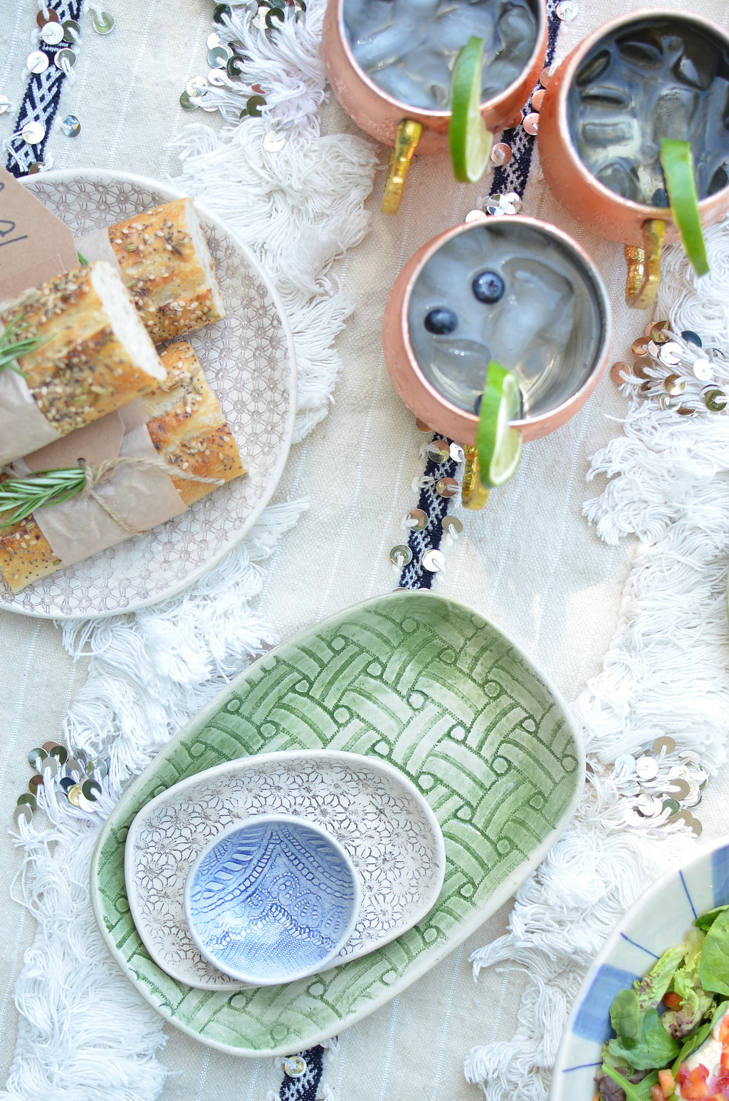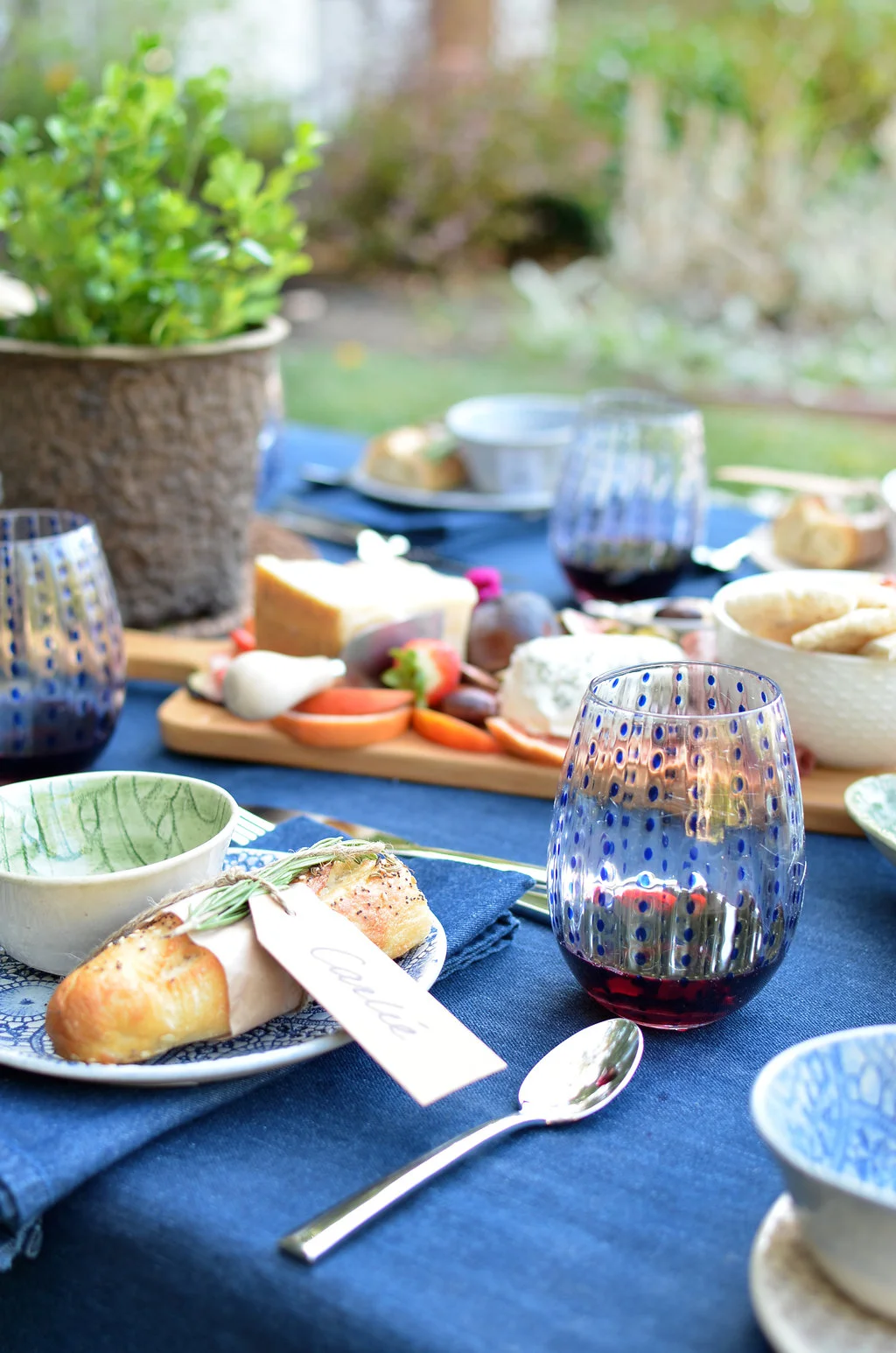 Wonki Ware is available in several colors, shapes and sizes. For this setting, I chose a palette of blue, green and smoke because I love how the color combination speaks to fall and what a natural the colors are with denim linens. (FYI, the black and red Wonki Ware colors are both genuinely amazing!). Along with the beautiful and intense colors, intricate patterns, and pottery feel, this collection is perfect for serving small savory Spanish style dishes or charcuterie with a side of your favorite cocktails, paired with a Rioja or a crisp, sparkling white wine.