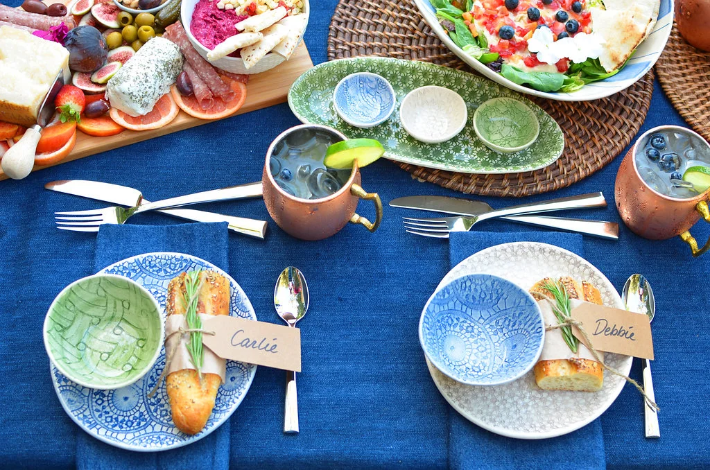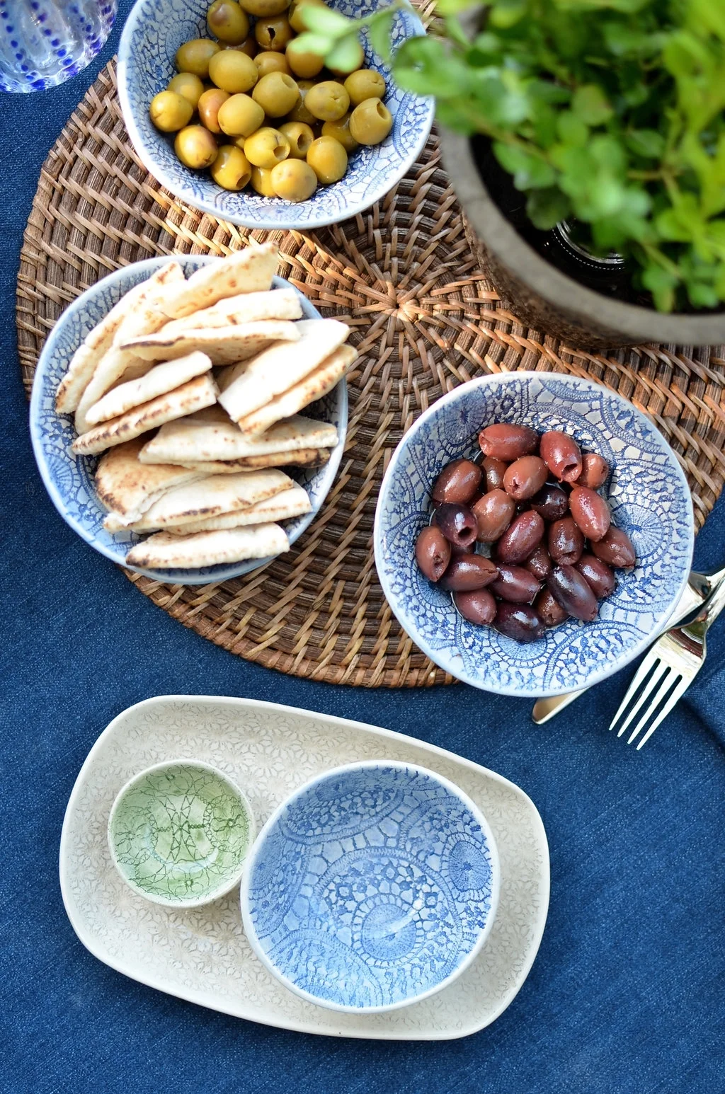While there's endless ways you can arrange Wonki Ware on the table to serve Tapas, I'm always about creating an atmosphere for good conversations and meeting new people at any get together, so I tend to set my tables with placesettings for a more intimate, up front and personal afternoon or evening. There's just some magic that happens sitting at a table and breaking bread together.