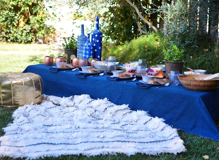 1. Set the Mood & the Table: Make it easy, uncomplicated and most of all, authentic and fun! And, by that we mean, anything from using your picnic table and benches, cozy-ing up the outdoor seating area, to bringing your coffee table out on the lawn, throwing down some blankets, scattering pillows and throws to create a warm atmosphere, and lighting candles everywhere. In this case, we threw down my friend Stefanie's Moroccan Wedding blanket. It's the real deal, truly AH-mazing, I love it, and if there was any way I could snatch it, I would. Sorry, Stef. Next time, please buy two!