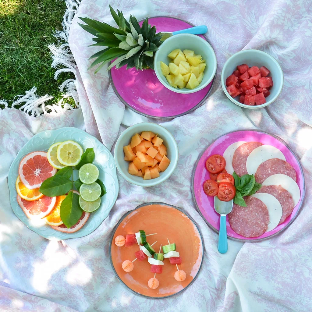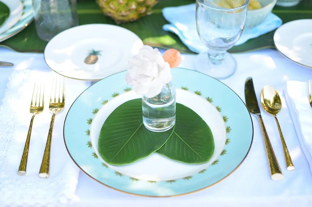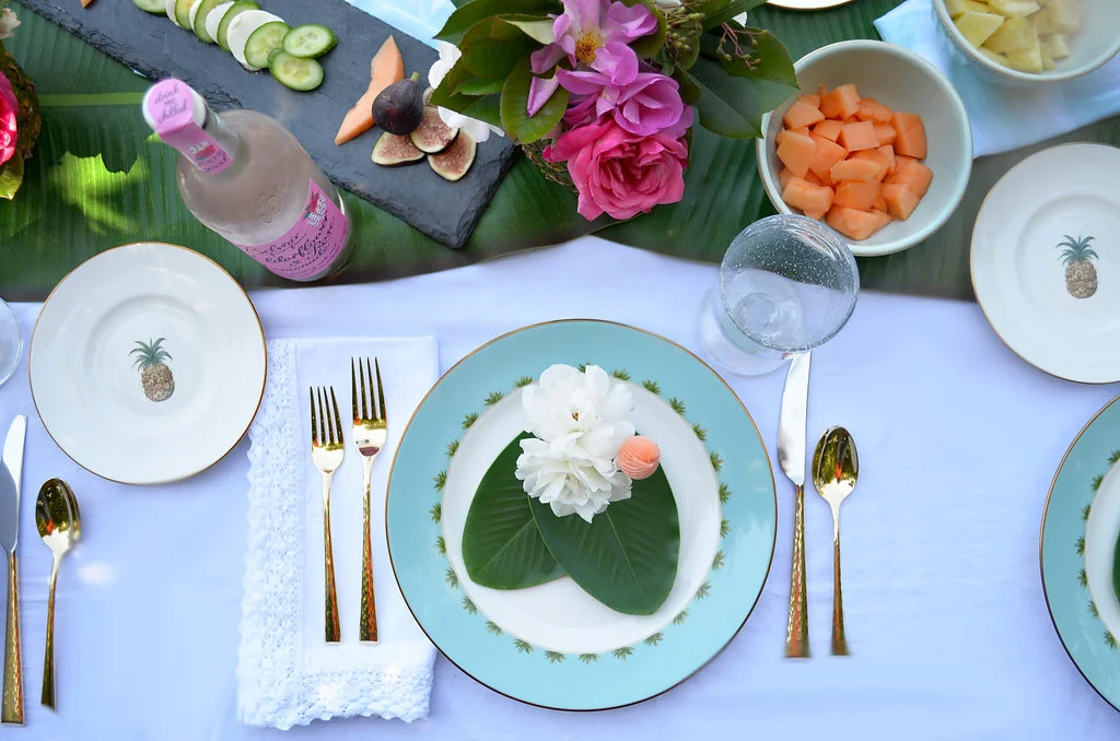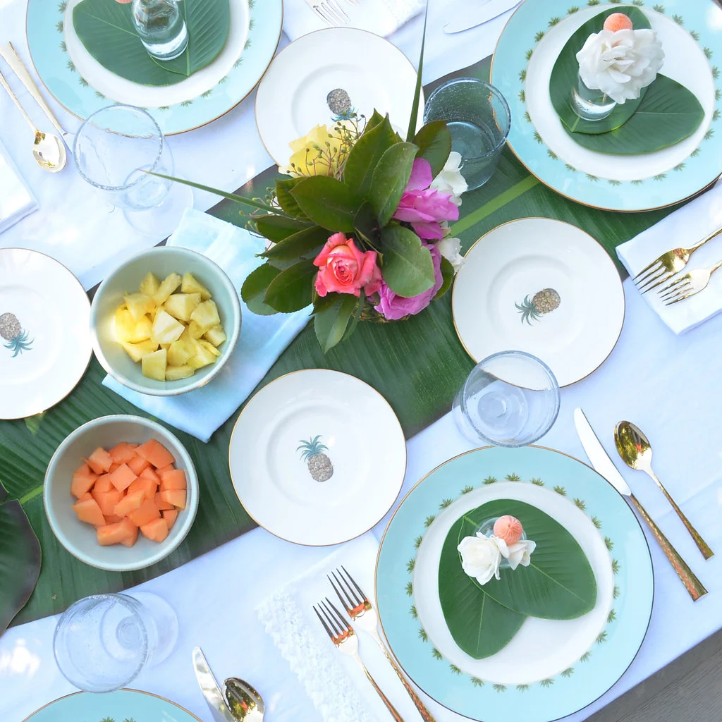Two things I love, summer and a good themed party. Summer is my favorite season and you already know I'll never miss the chance to throw a party or get a gang together. With summer coming to an end and my love, er, obsession with pineapples and palms, I decided one of the last hurrahs at Casa de Shearer should be a tropical get-together around the patio and pool. So, when our pals at Lenox asked us to partner again (so excited!), I knew right away I'd be bringing British Colonial to the party table. Attention all brides, because if this pattern, Marchesa by Lenox Painted Camellia or Lenox French Perle is part of your bridal registry, here's some inspo on more ways to have fun with your china!