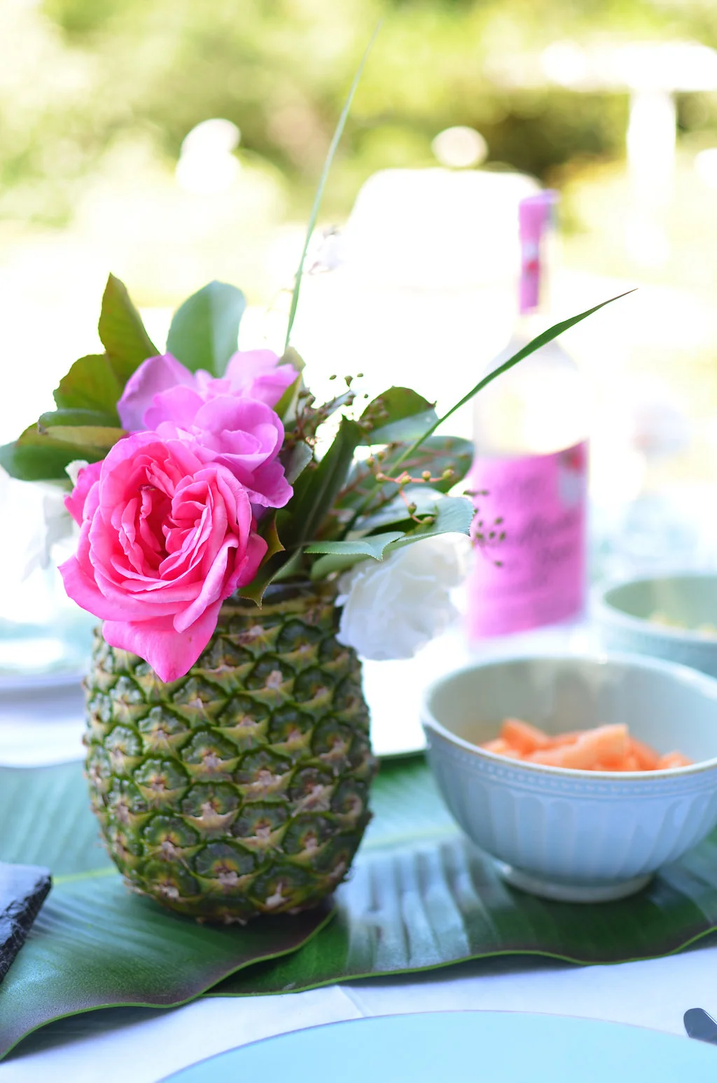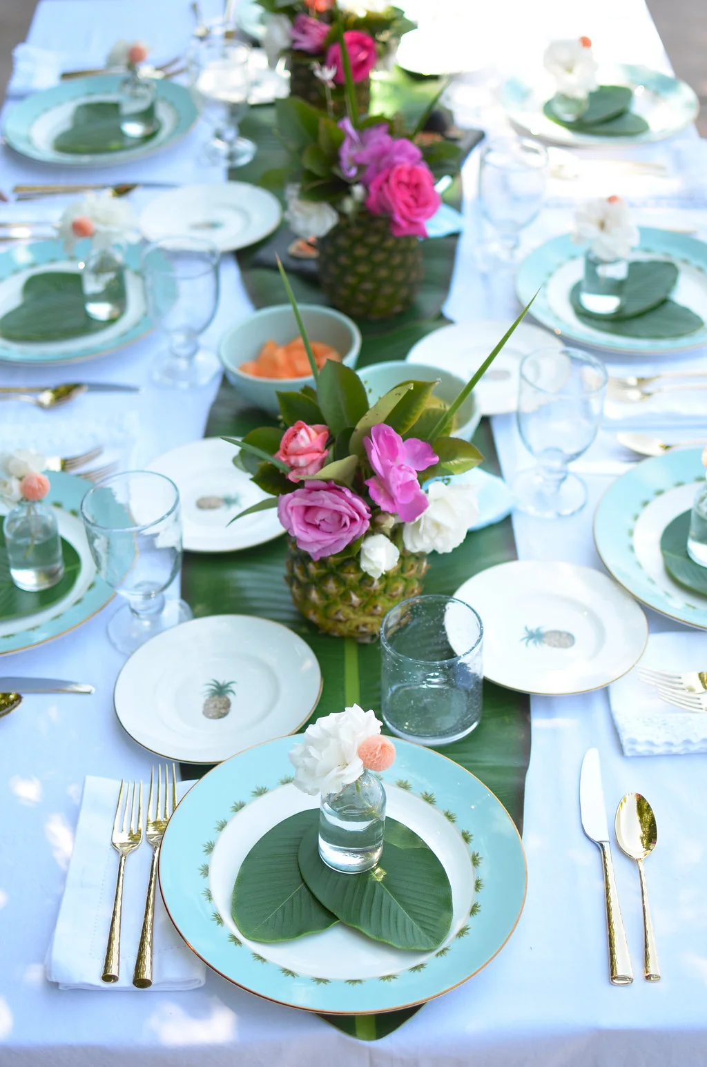 I've been swooning over pineapple vases the whole summer, so I hit Instagram for some quick inspiration and Pinterest for a good DIY "recipe". A trip to the market, tour around our flower garden and a fruitfest in the kitchen later, I had four pineapple flower vases in hand that made the best tropical centerpieces ever and were the center of my table inspiration. Side note, they were so easy and fun to make!
