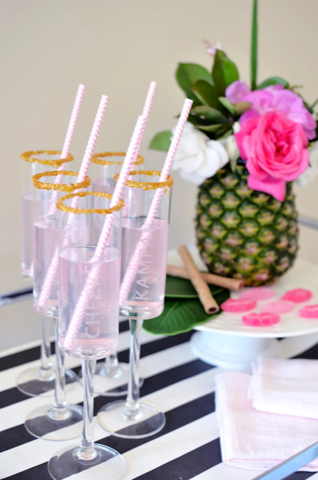 To pull in the theme to the bar cart, we set a pineapple flower vase on a cake pedestal for height, scattered Sugarfina gummy Sugar Lips for a sweet accent, and layered blush colored cotton flour sack napkins because my entertaining mantra is - 'if you have it, use it' and I do!