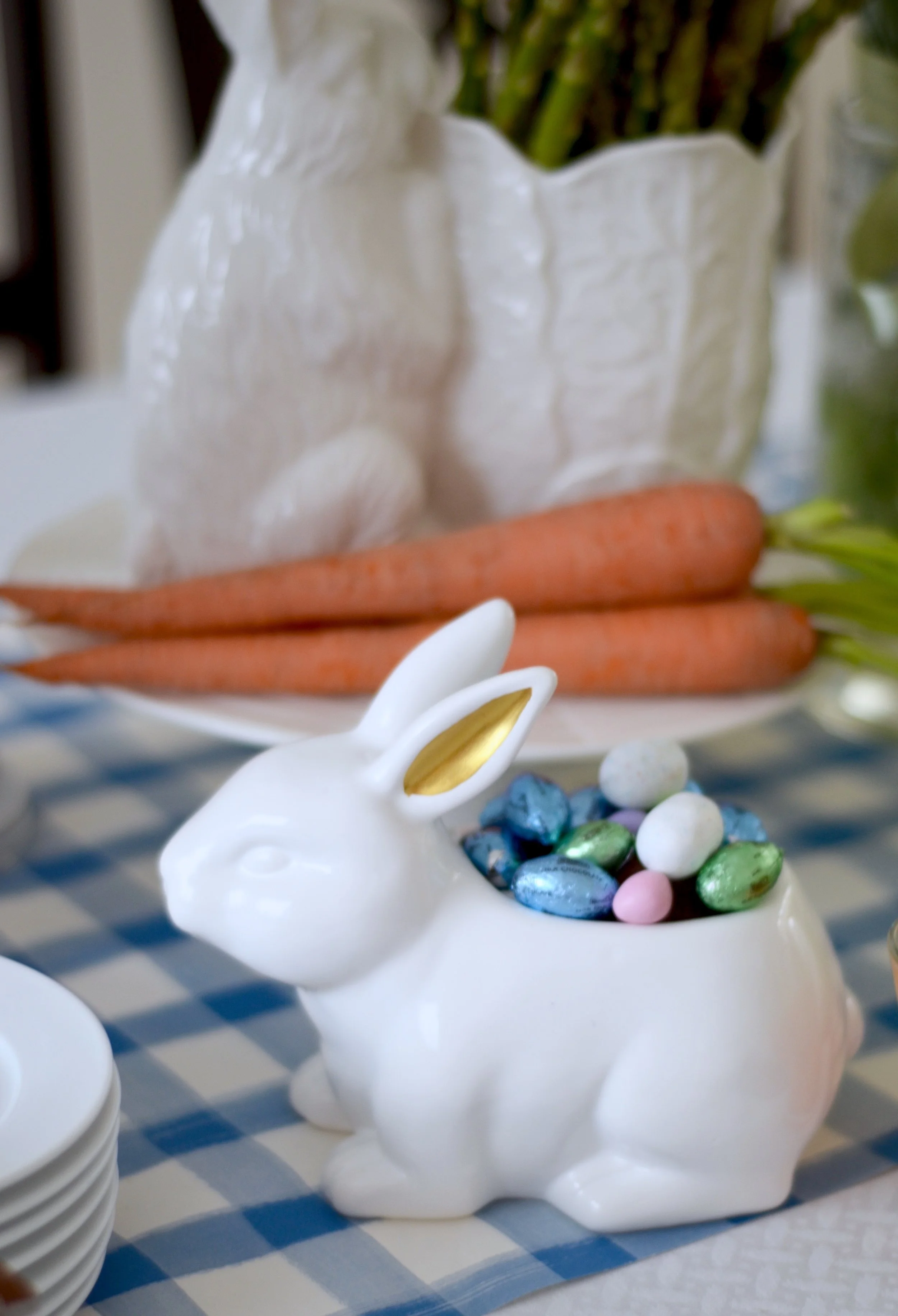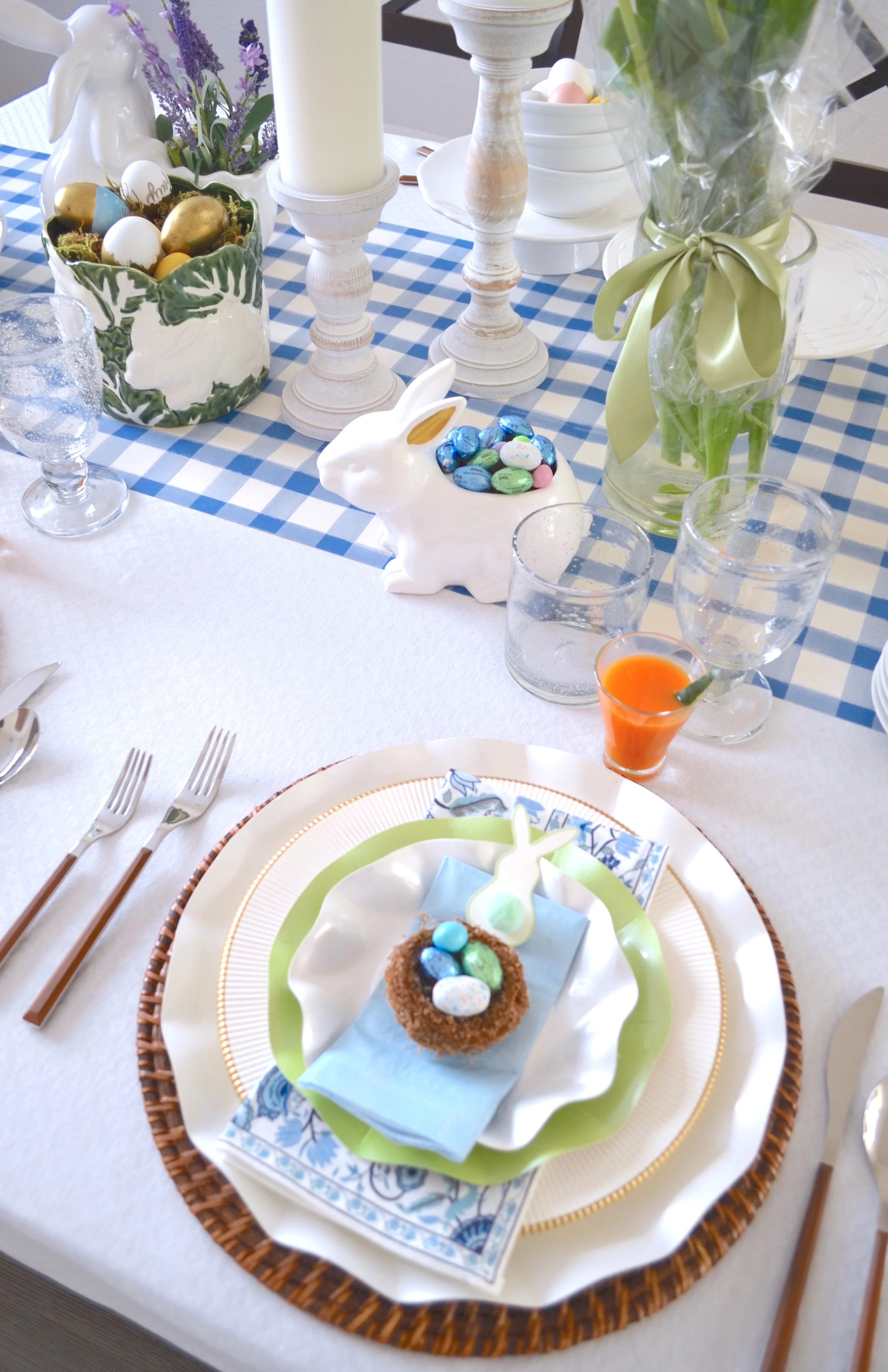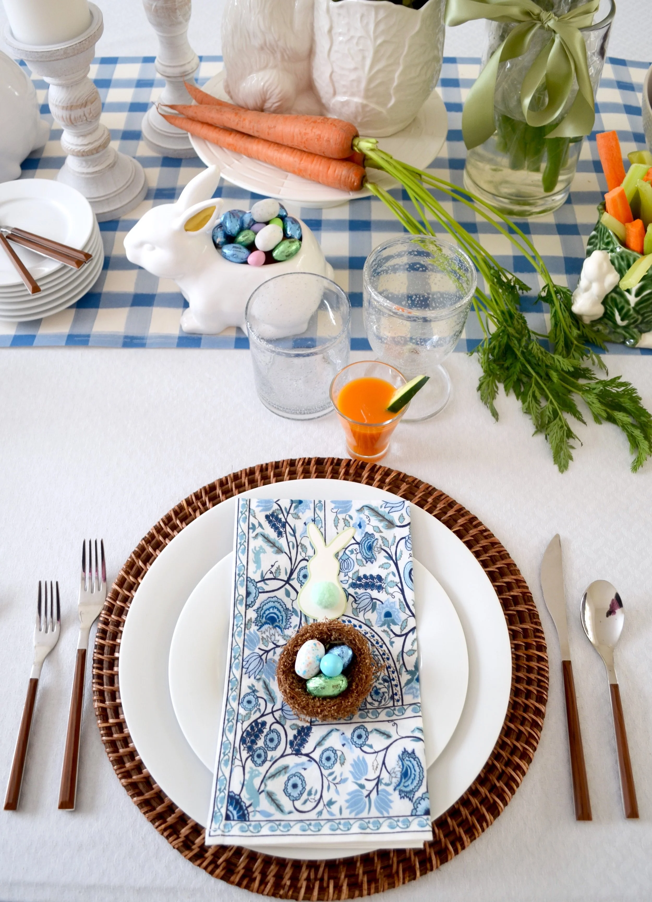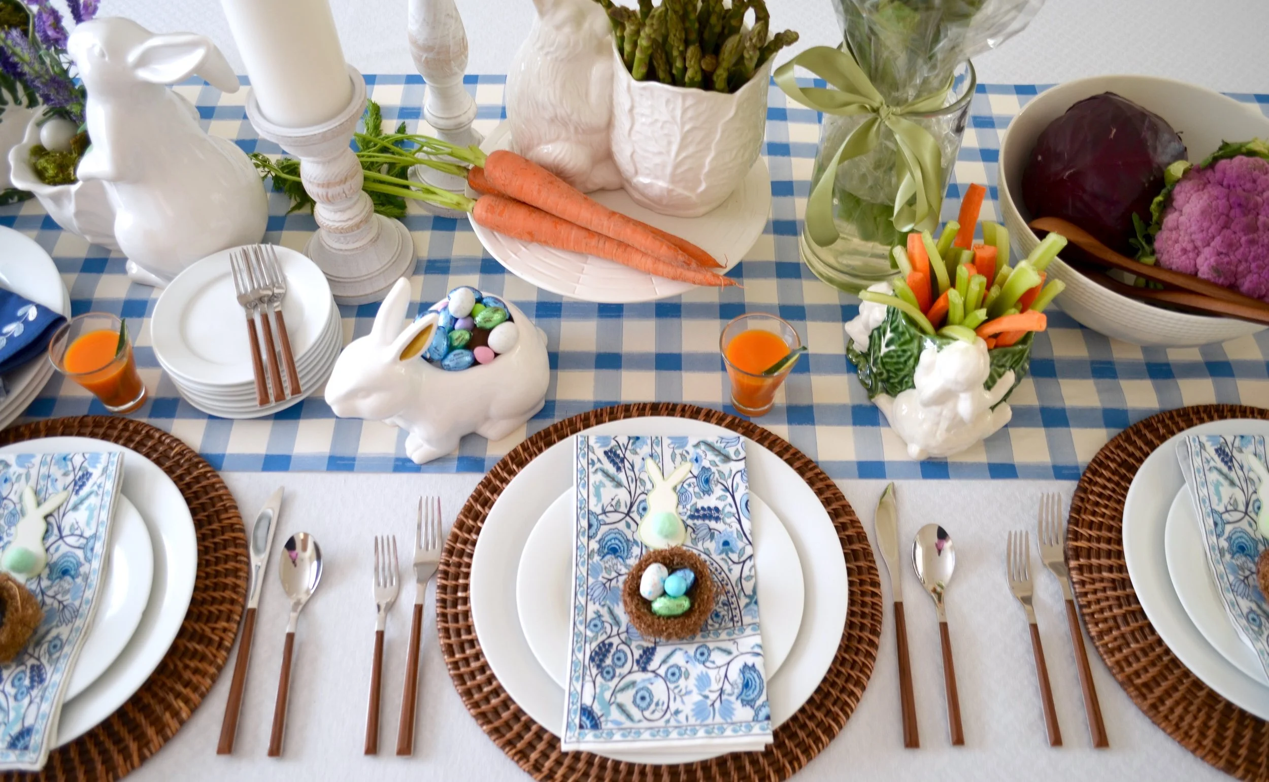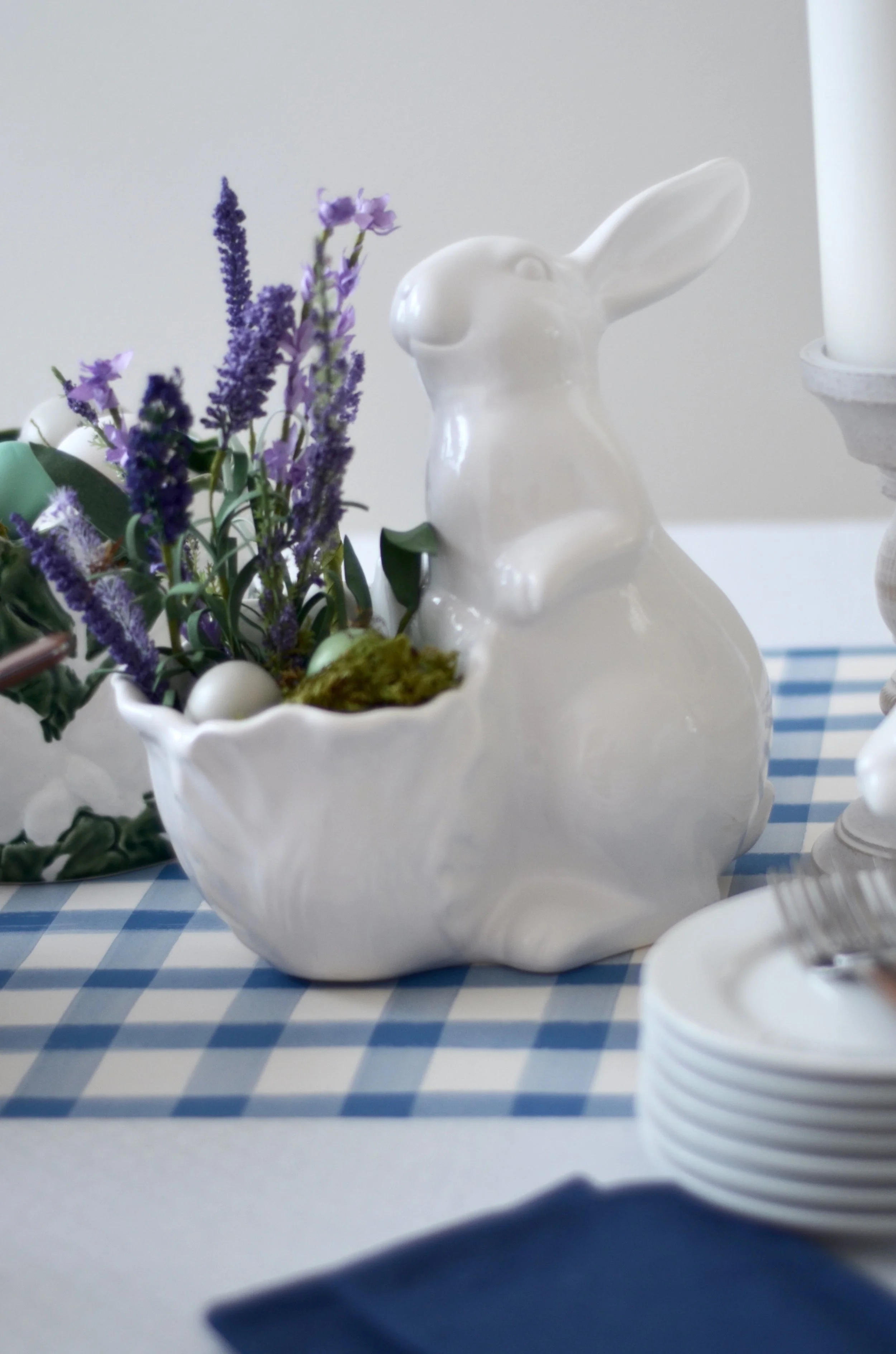 Featured: Crate & Barrel Aspen Whiteware, blue check paper runner from Hester & Cook, vintage style blue printed napkin from Pier1, The French Chefs Rattan Placemats from Lenox, Bormioli Rocco Ypislon cordial glasses, and clear bubble glassware, TAG. White ceramic bunnies and decor; Marshalls and HomeGoods.