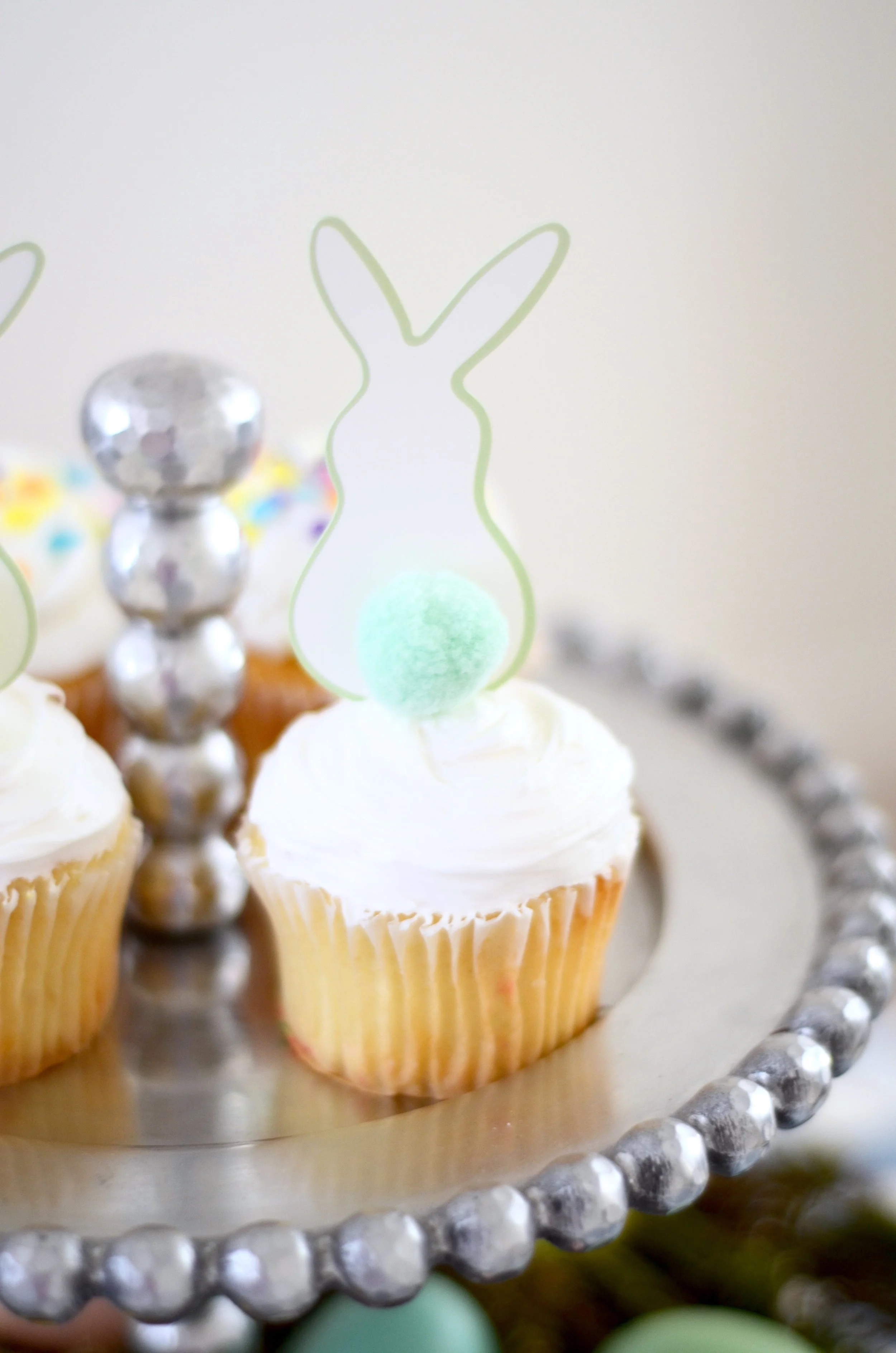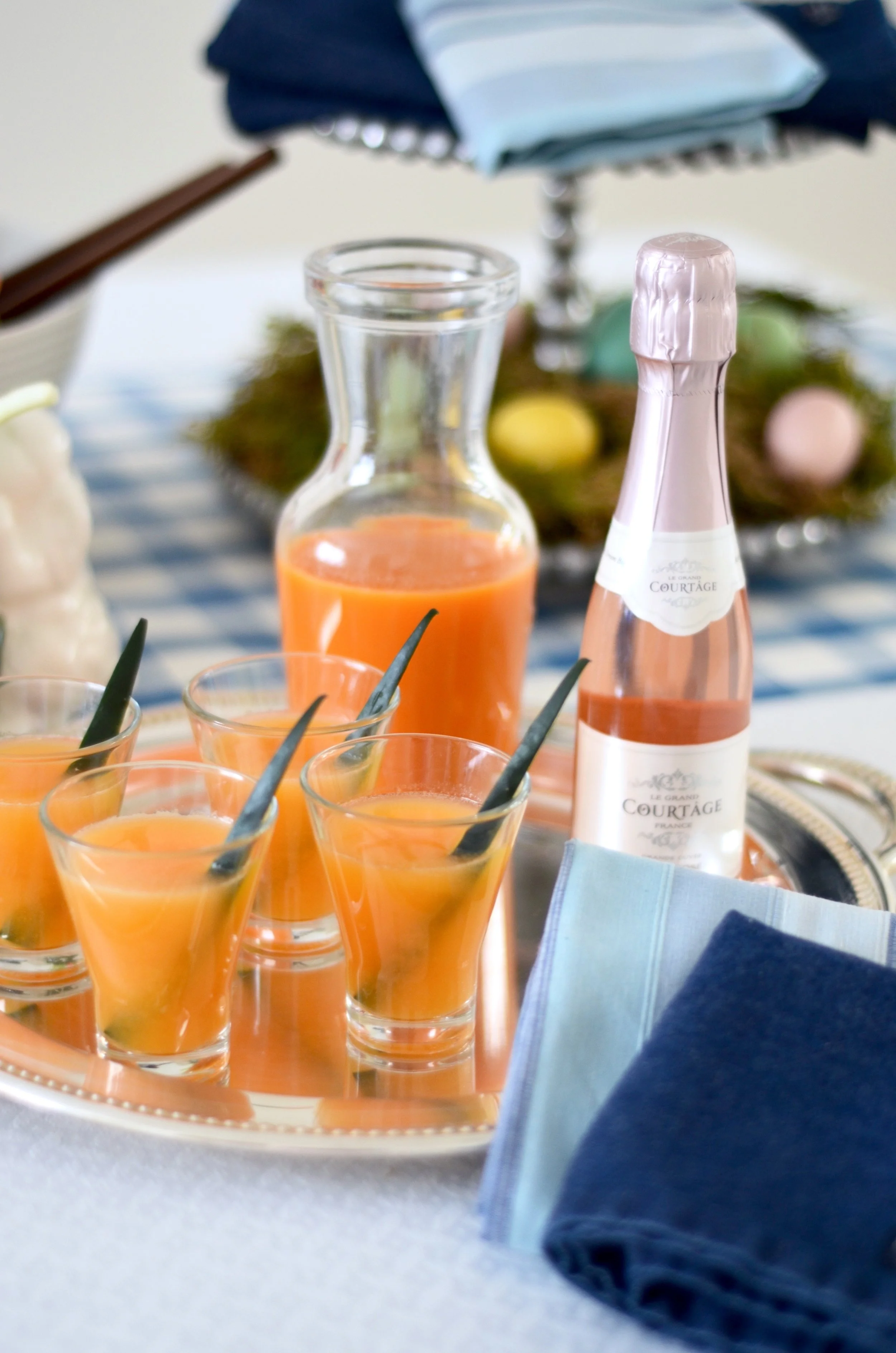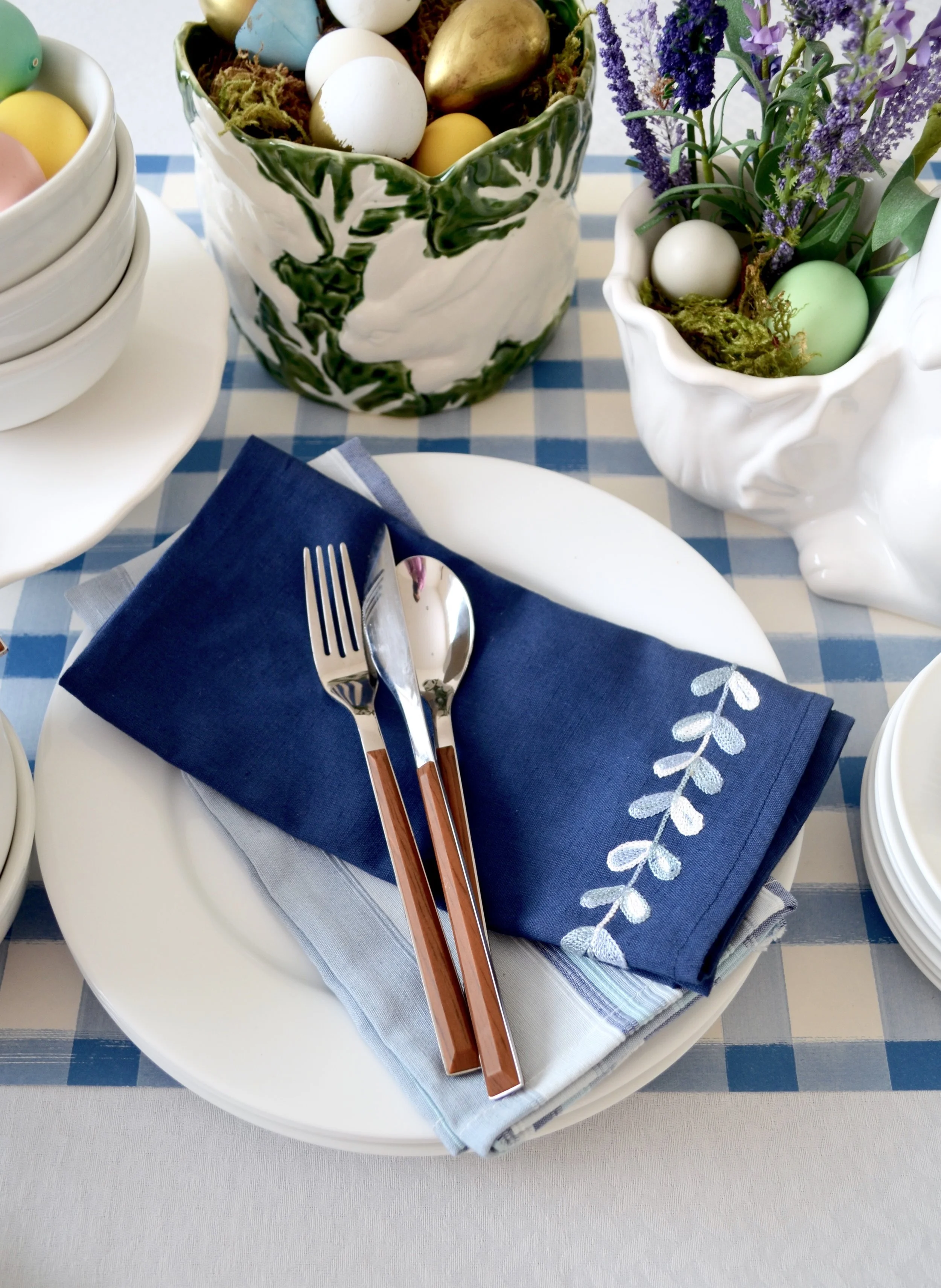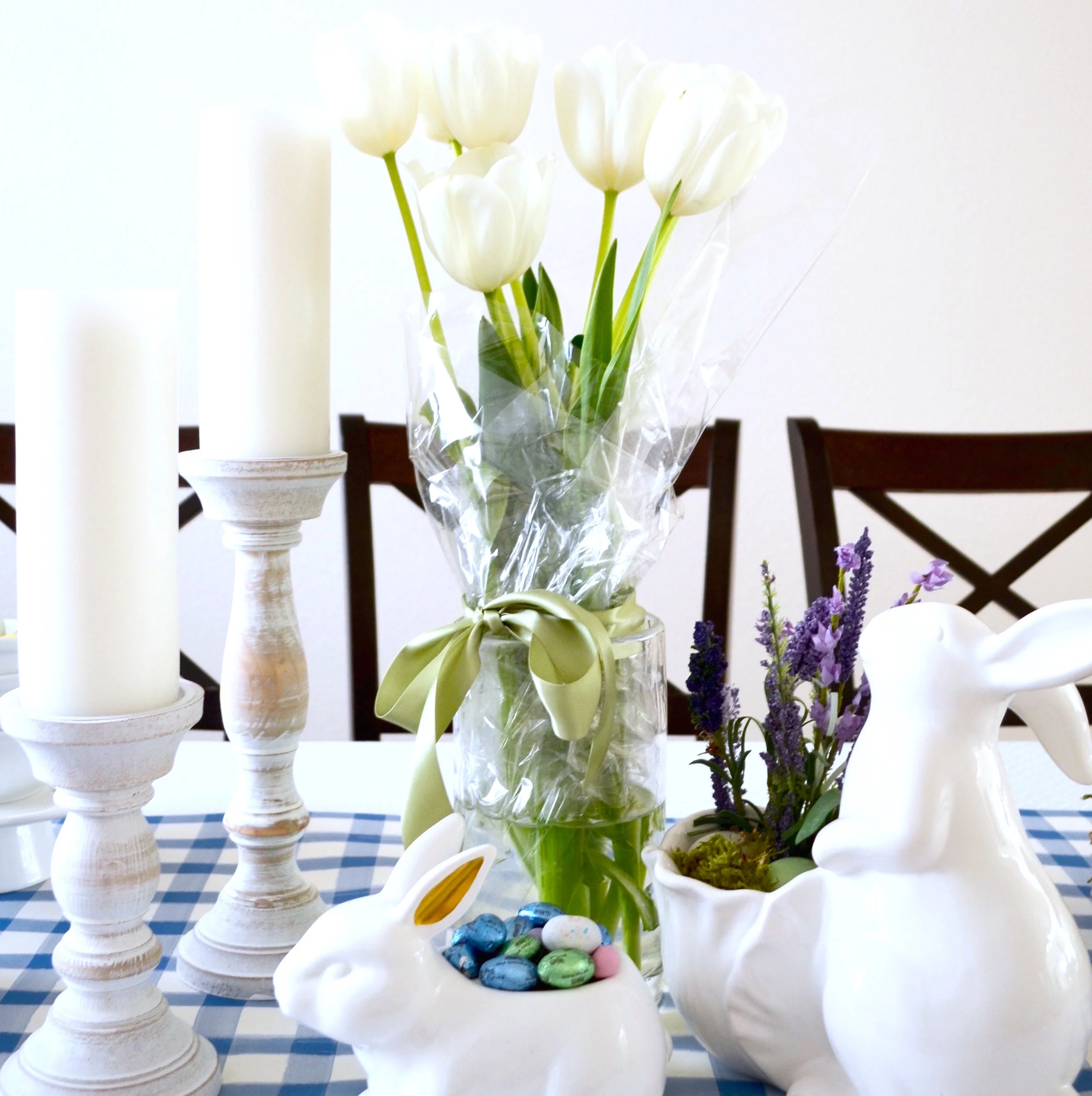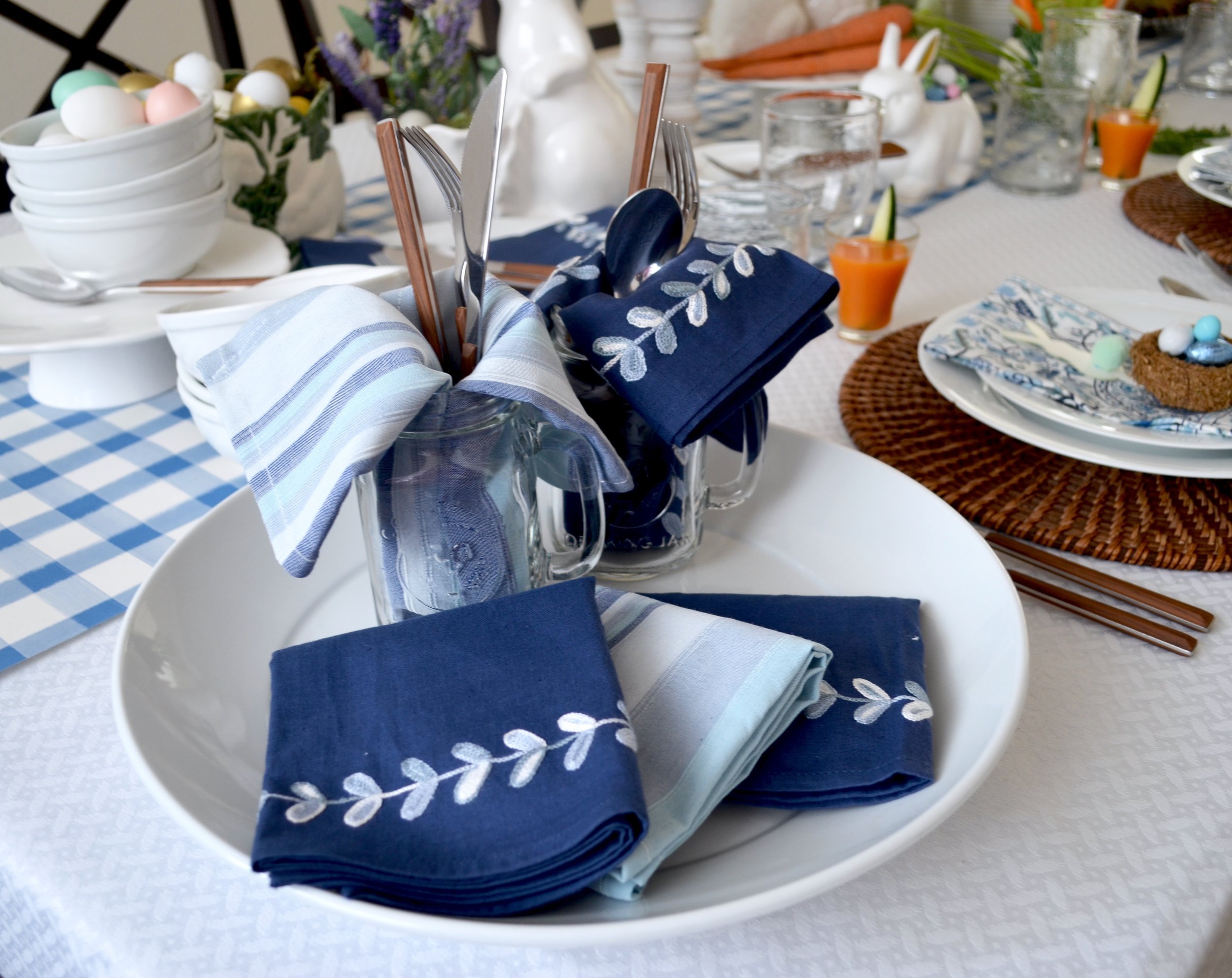 Featured: Crate & Barrel Aspen Whiteware, blue check paper runner from Hester & Cook, vintage style blue printed napkin from Pier1, The French Chefs Rattan Placemats from Lenox, Bormioli Rocco Ypislon cordial glasses, and clear bubble glassware, TAG. White ceramic bunnies and decor; Marshalls and HomeGoods.