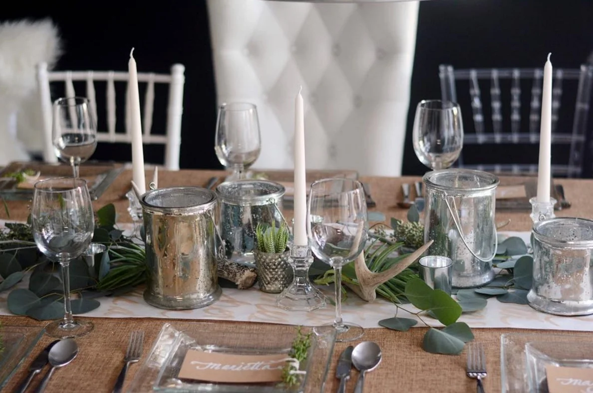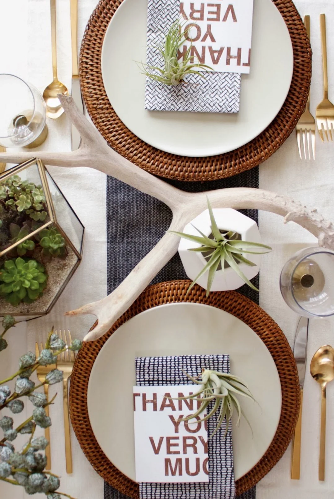 Simple, modern and cozy. Craft and Couture shows us that you don't always go glam and glitz to set a beautiful Thanksgiving table. Terrarium centerpieces, faceted white bud vases, striped linens and again...those antlers! This is a table to be proud of.