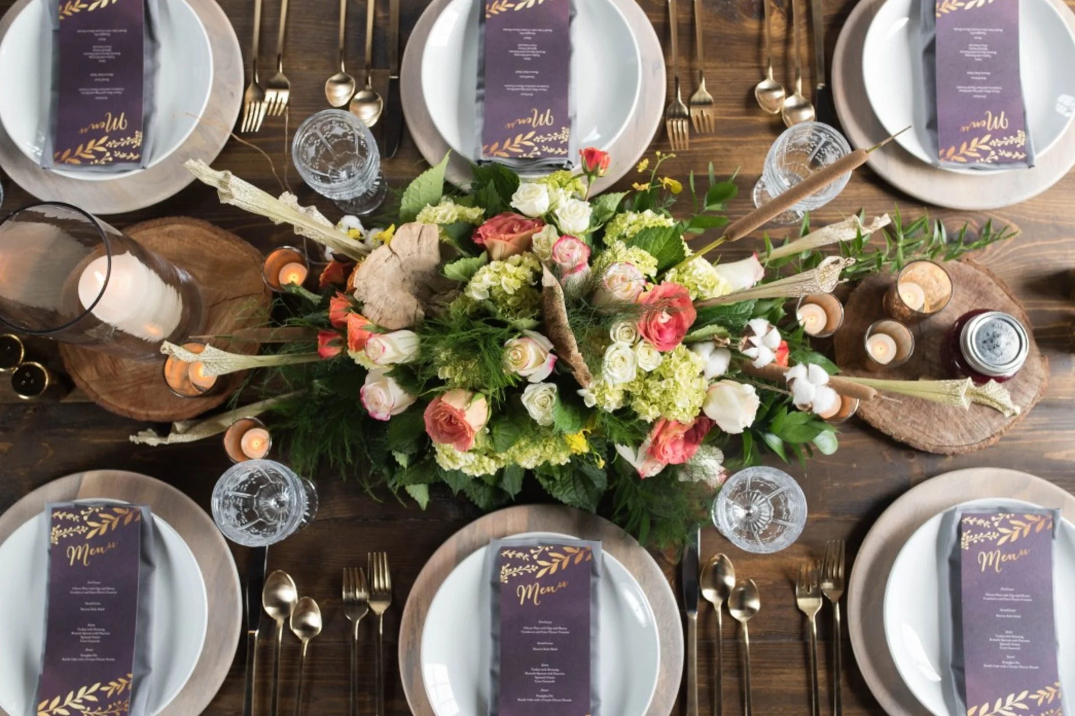 Nailed it. From the naked, rustic wood table, gold flatware and wooden chargers to the gold foil printed violet menus. This Thanksgiving tablescape is one that we would be thankful to dine at.