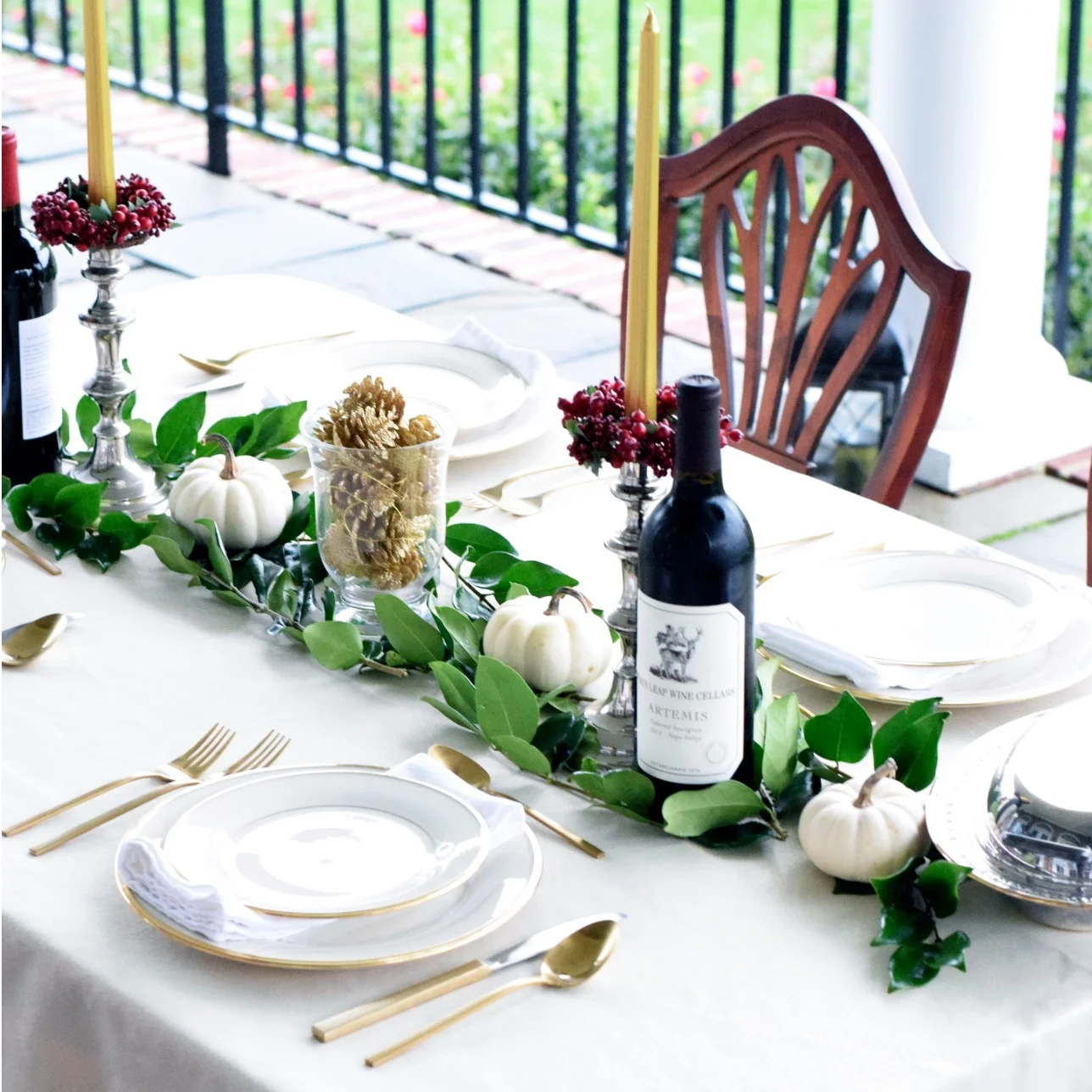 If you're hosting your Thanksgiving on the patio, pickup some tips to keep your table warm from Morgan Reed of Timeless Taste. Gold lined fine china, gold pine cones, cranberry wreathes and crisp white linens make this table setting truly timeless.