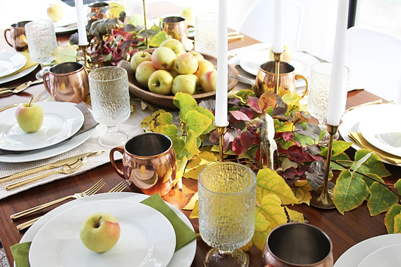 Even if you're decorating your Thanksgiving on a budget, take these expert ideas from Jennifer Stagg With Heart who styled her centerpiece using fresh picked apples and leaves from her backyard. The copper mugs work so well against the green fall colors.