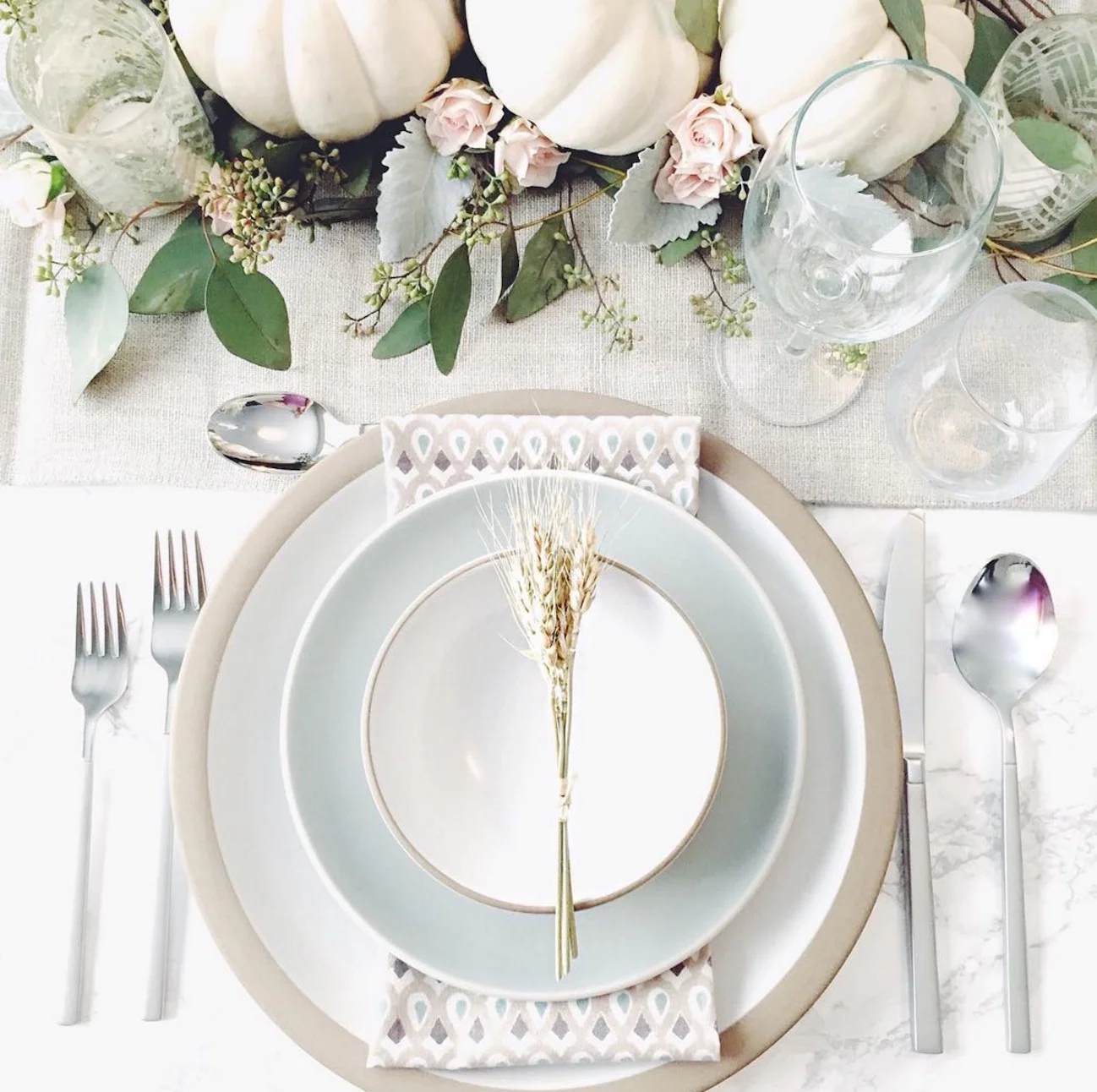 A lighter, fresher take on Autum - Adele of Lifes Lookin' Good styled her Thanksgiving Table in bright whites, hints of green and a sprig of barley for that fall feeling.