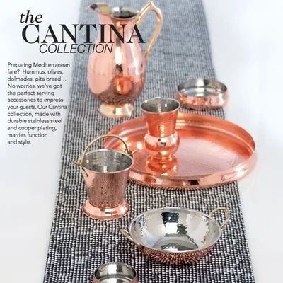 Then there's our copper weather-beaten, aged (and super shiny) Cantina Collection to serve the hummus, olives, dolmas and pita bread at your next Mediterranean feast. Perfect, right? It's a rough-luxe style that never looked better. You've heard it before and you will hear it again; copper is the new black when it comes to home decor, so let's have some fun with it!