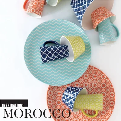 Can we just talk about the color in the Morocco collection for a minute (or hour)? We could honestly do a happy dance with this pastiche of patterns in vibrant colors. Mix and match these turquoise, orange, navy and lime colors and patterns of this collection to dress a fun, casual, yet exotic Moroccan flavored table. We add fun glassware, crisp linens, fresh, but simple flowers and get just a little more giddy as our vision comes alive. Happens every time. Summer isn't over and we're determined to play out our al fresco dinners until the very end with friends around and wine in hand.