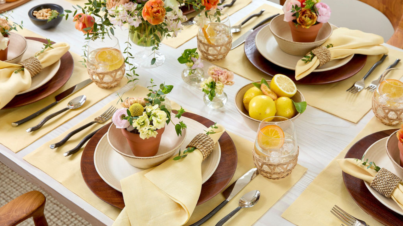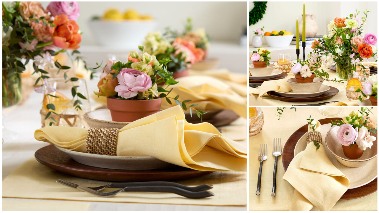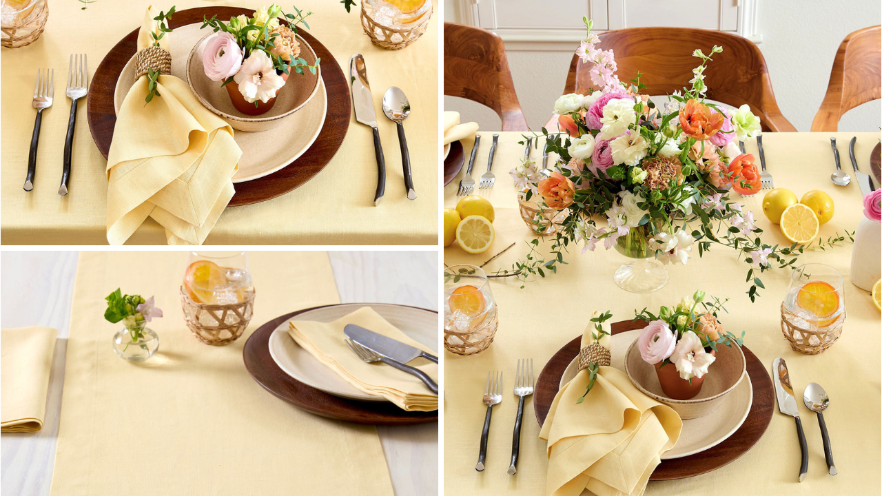 While collaborating with Solino Home, I leaned into that warmth. Their linens hold color in a way that feels lived in rather than styled. This isn’t a bright summer yellow. It’s softened. Sun washed. The kind of tone that works beautifully for summer table settings, outdoor entertaining, and even transitional early fall tablescapes—echoing the ease of Sun Washed Entertaining with Solino Home Bright Cabana Stripe.