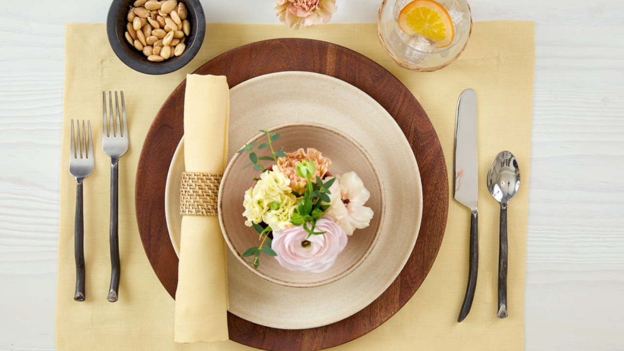 The wooden chargers, the ceramic plates, the woven napkin rings. Even the glassware carries a warmth that complements rather than competes. This is where tabletop styling becomes less about layering and more about cohesion. Everything speaking the same language, a philosophy seen throughout the Table and Dine portfolio.