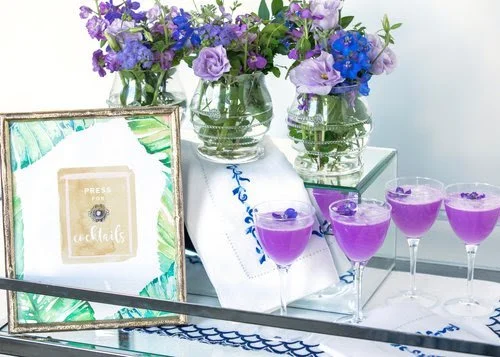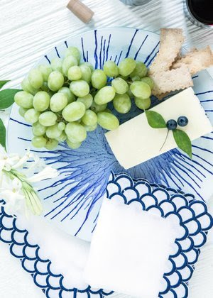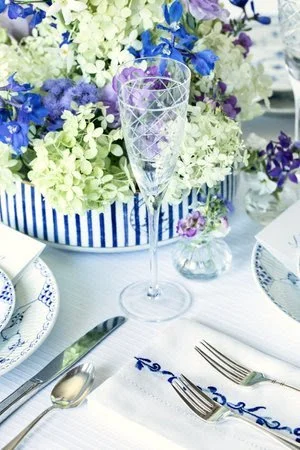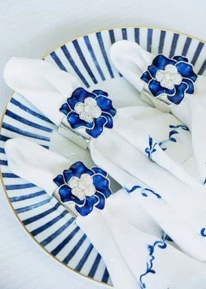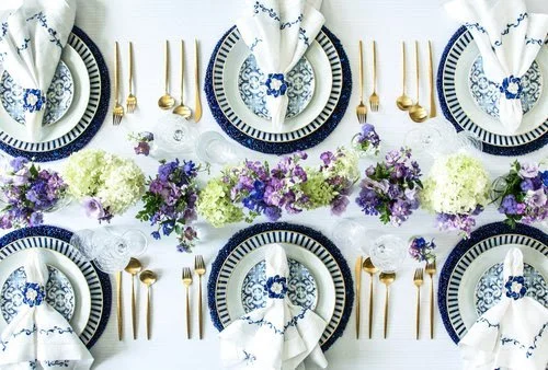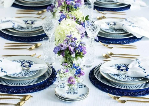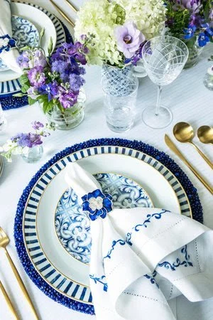 FEATURING ROYAL BLUE BEADED PLACEMATS, BLUE WAVE EMBROIDERED NAPKINS AND ROYAL BLUE SPRING FLOWER NAPKIN RINGS
