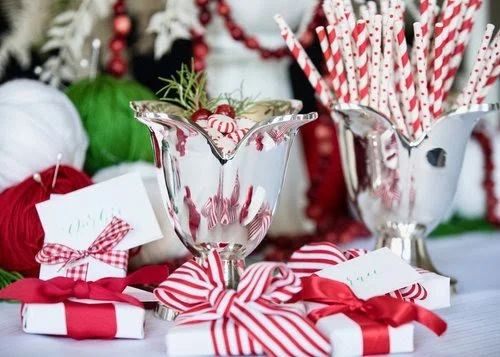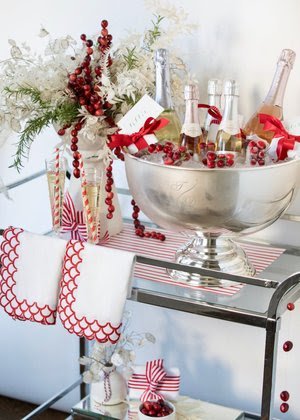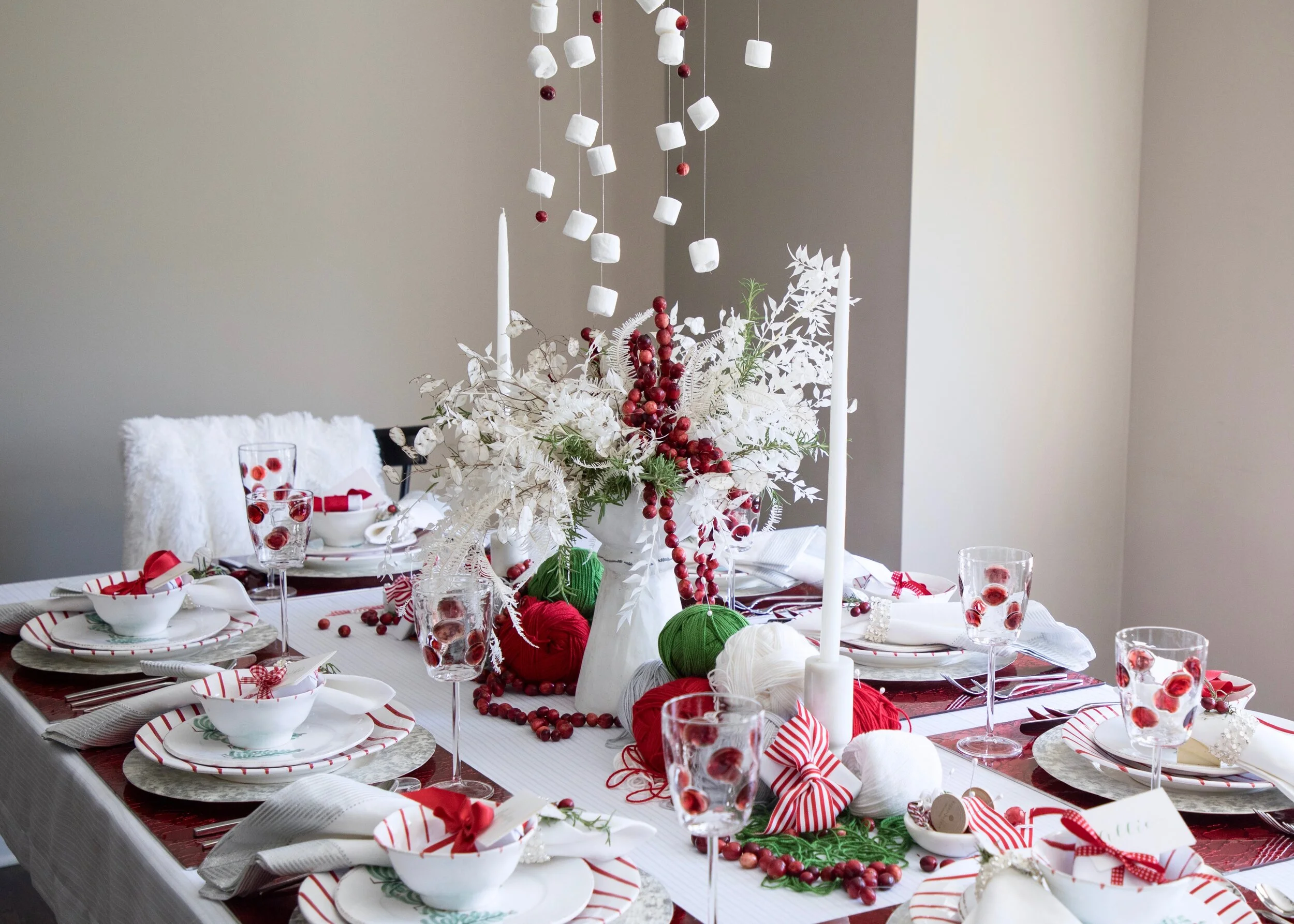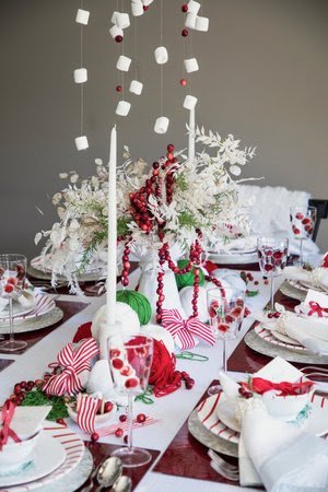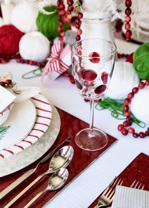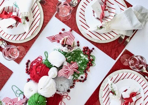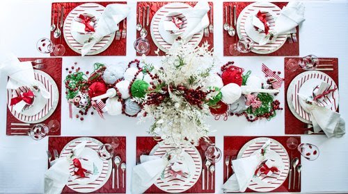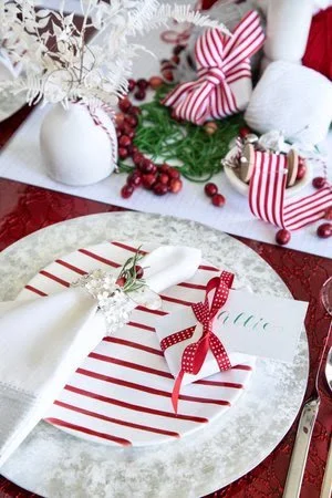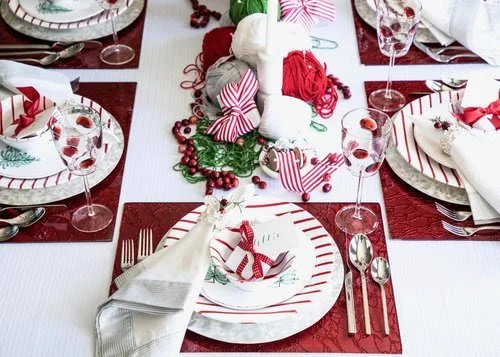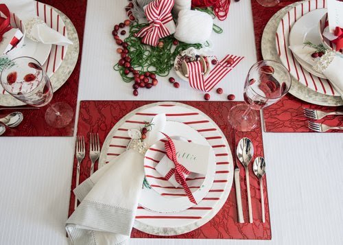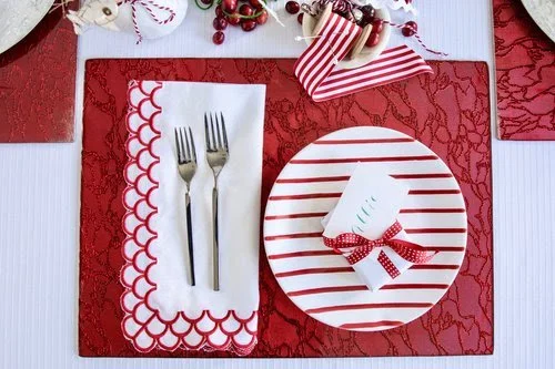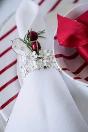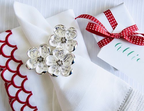FEATURING MODERN ARTISTIC RED GLASS PLACEMATS, SILVER STRIPE EDGE NAPKINS, SILVER SHELL CHARGER PLATE, WHITE FLOWER CHAIN NAPKIN RINGS